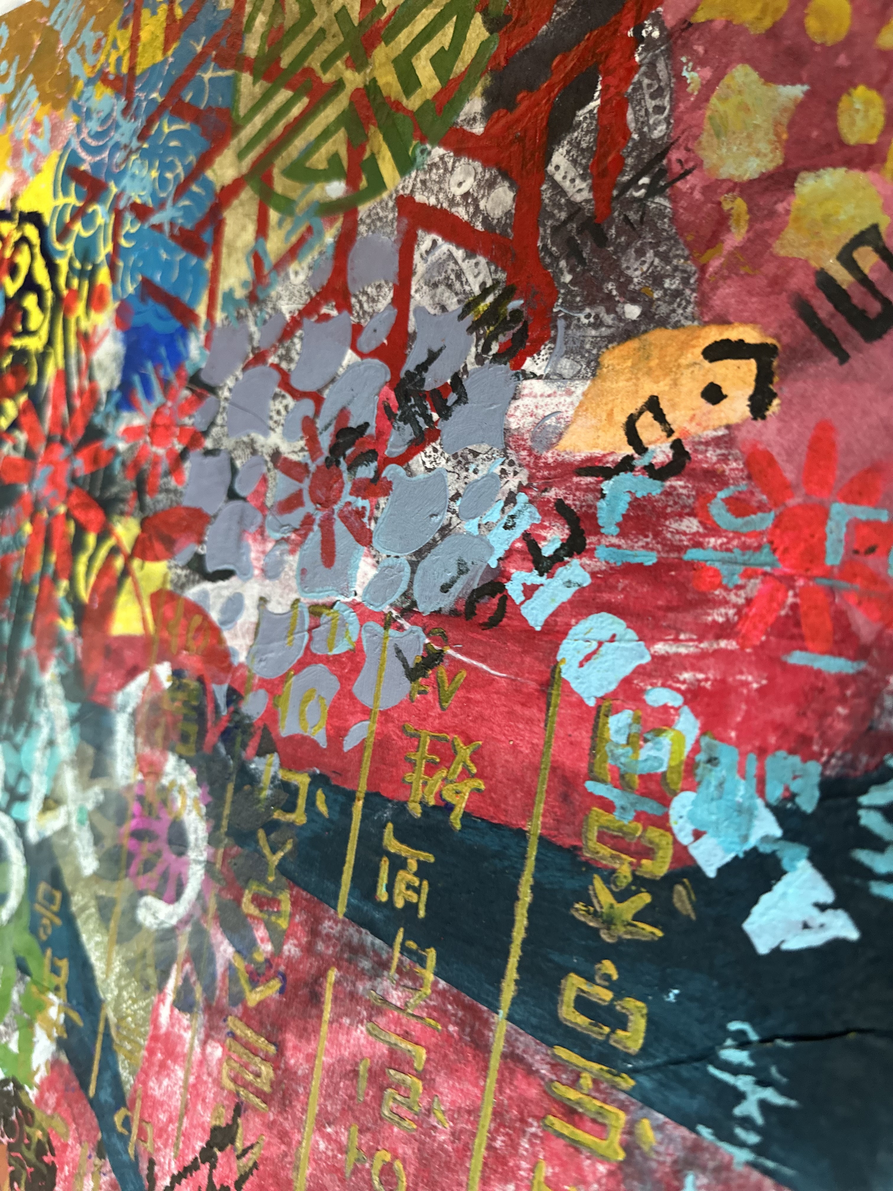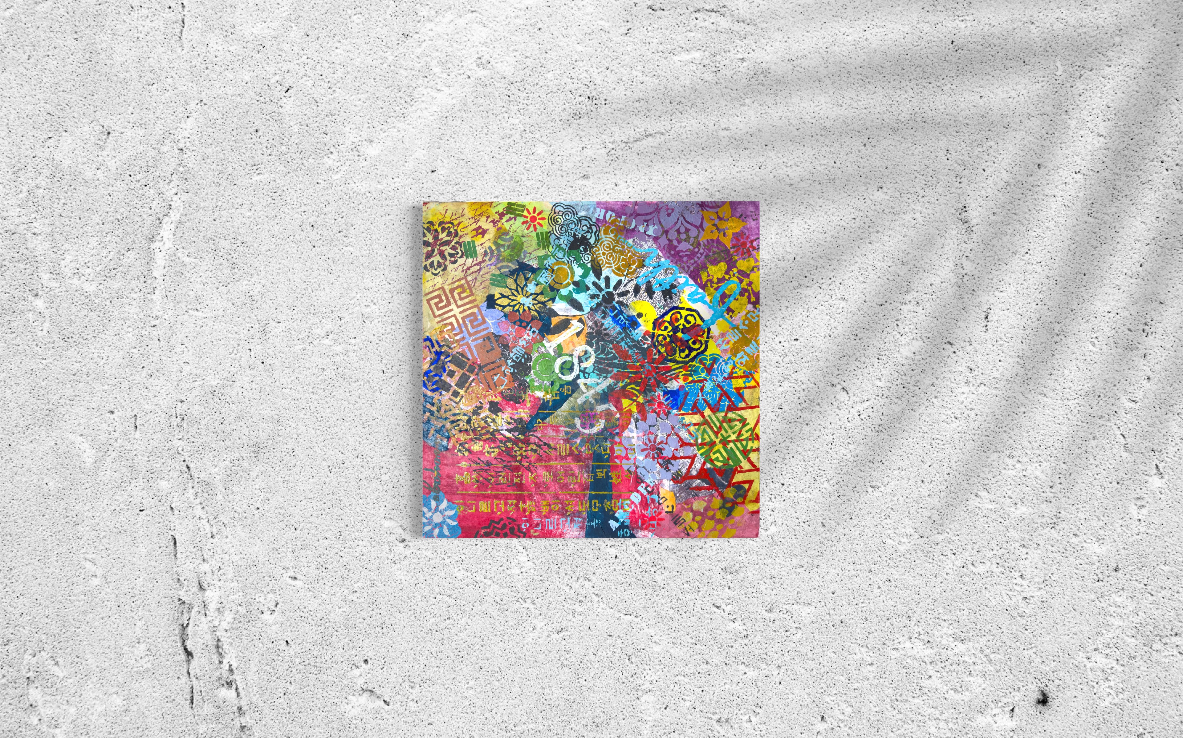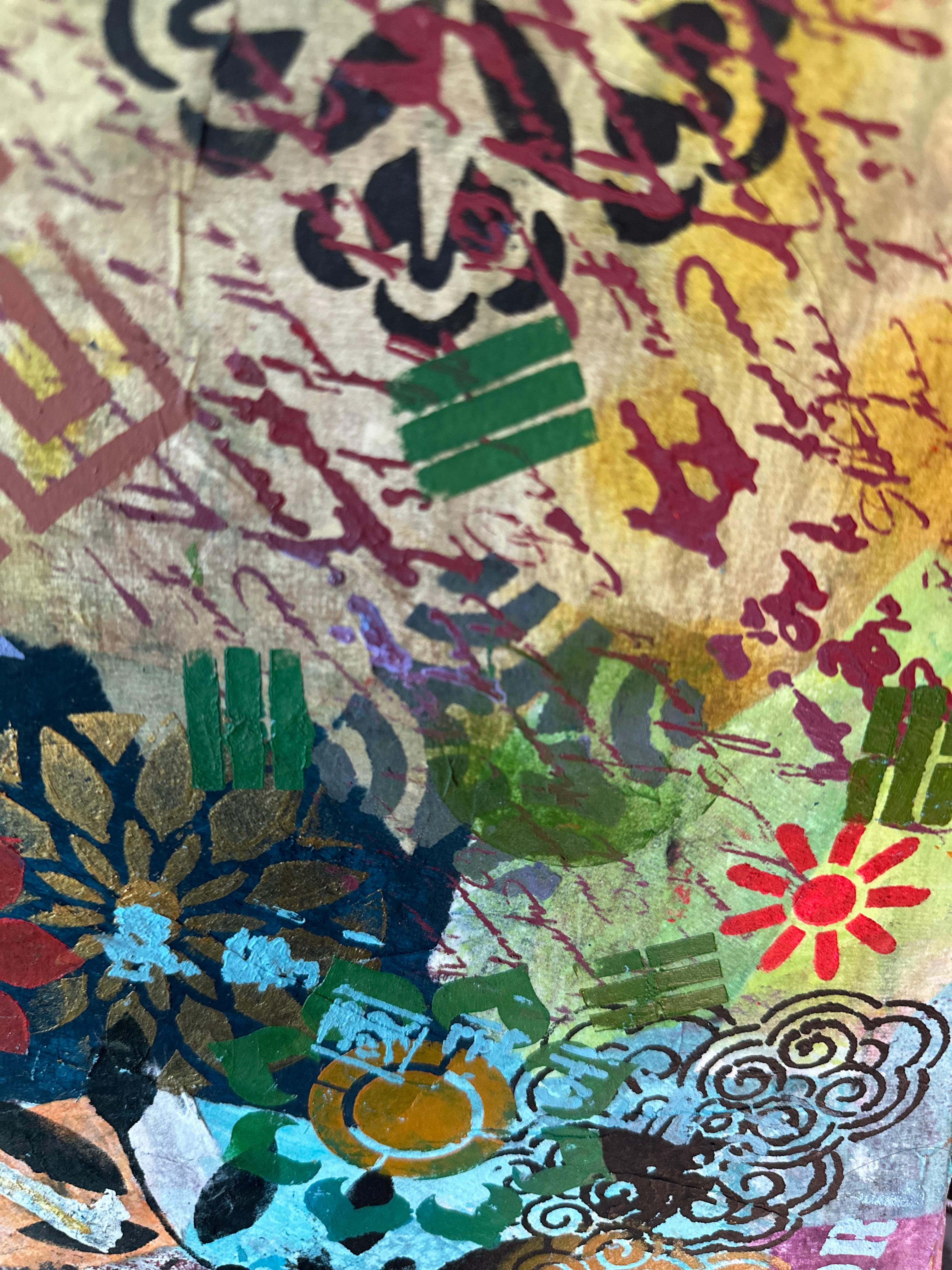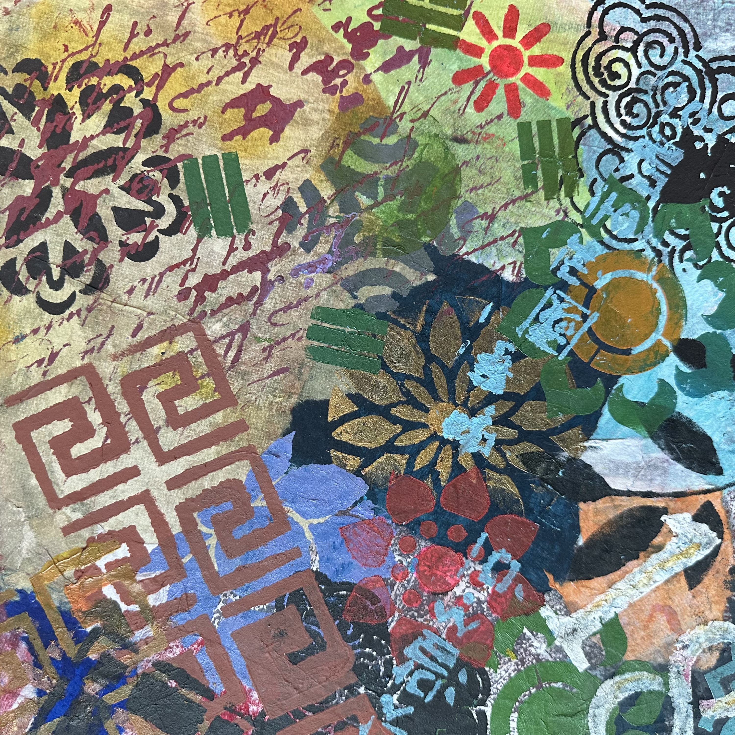 Mixed media on canvas (Dyed hanji and gel-printed hanji collage, acrylic stencil)