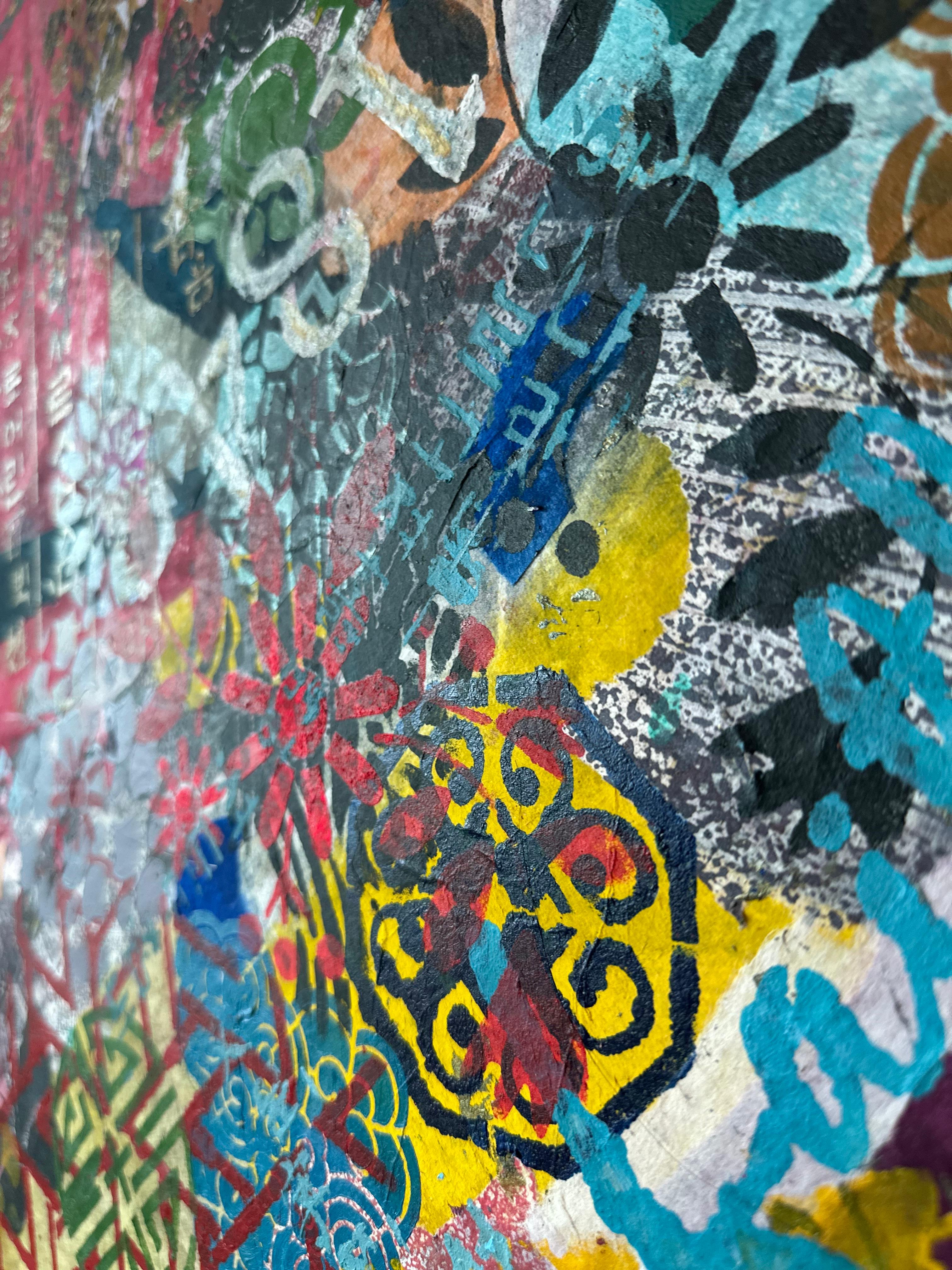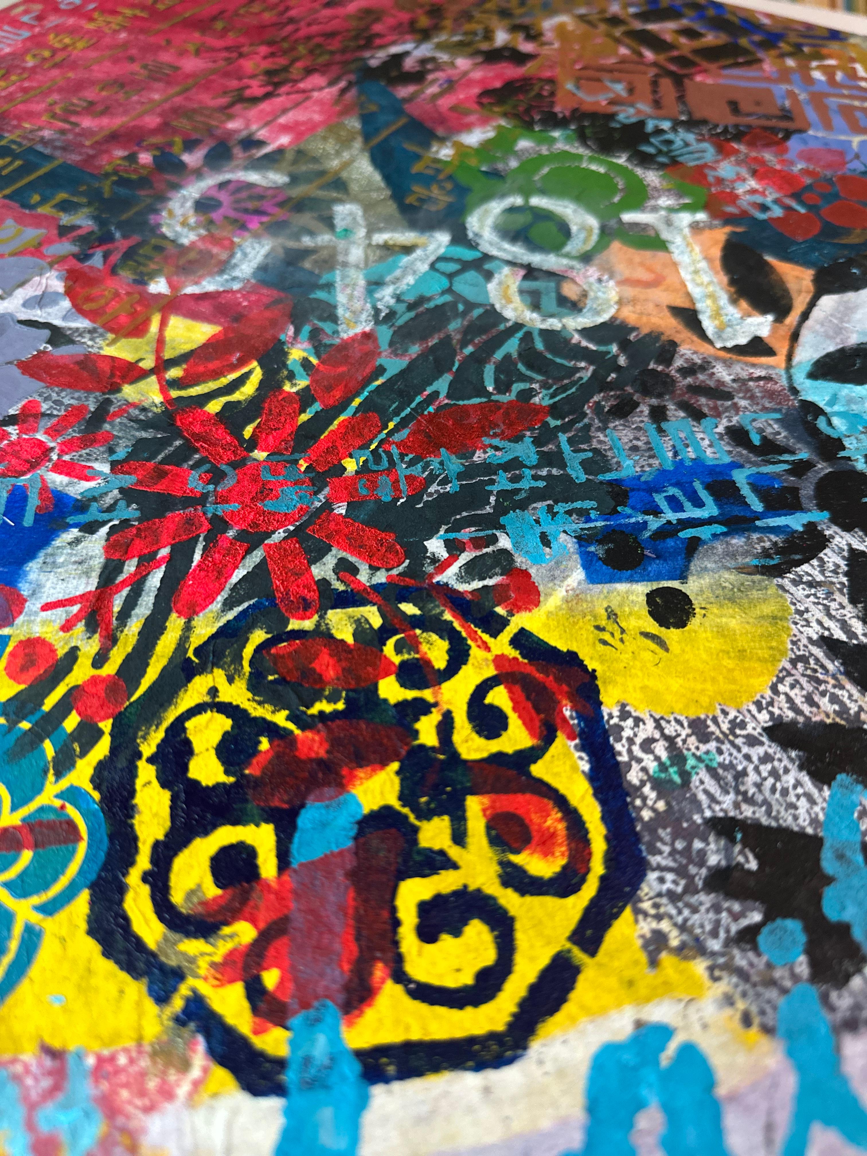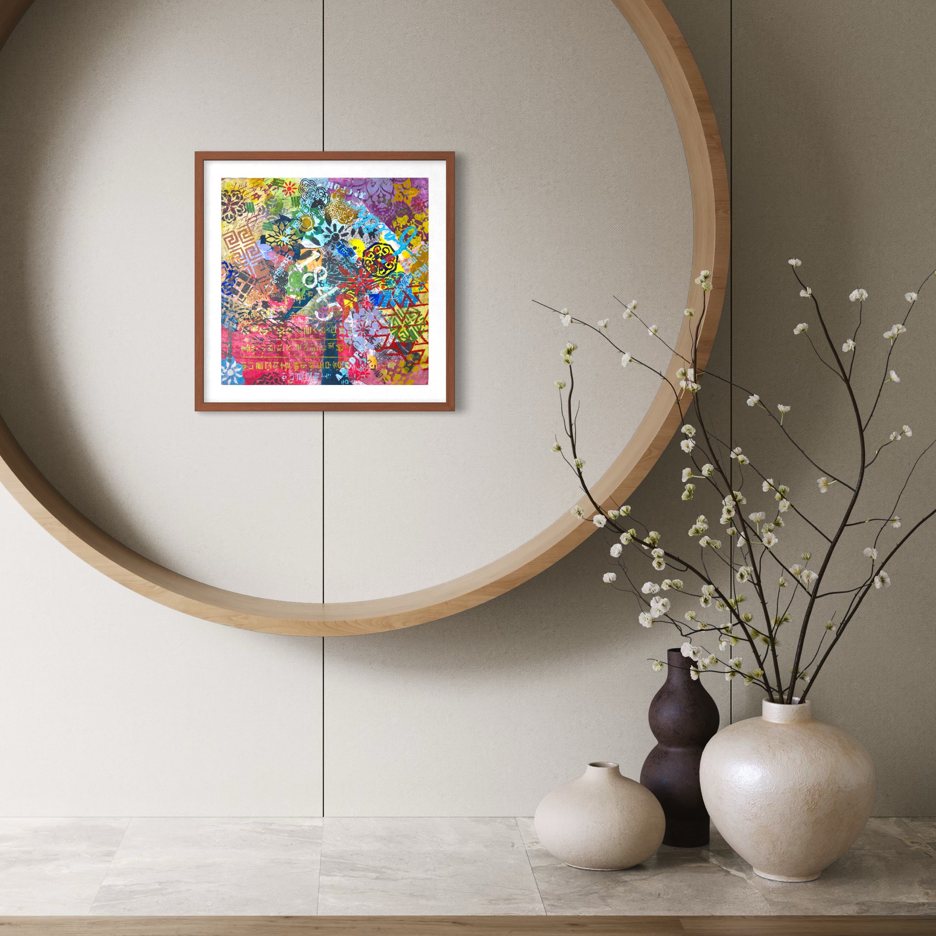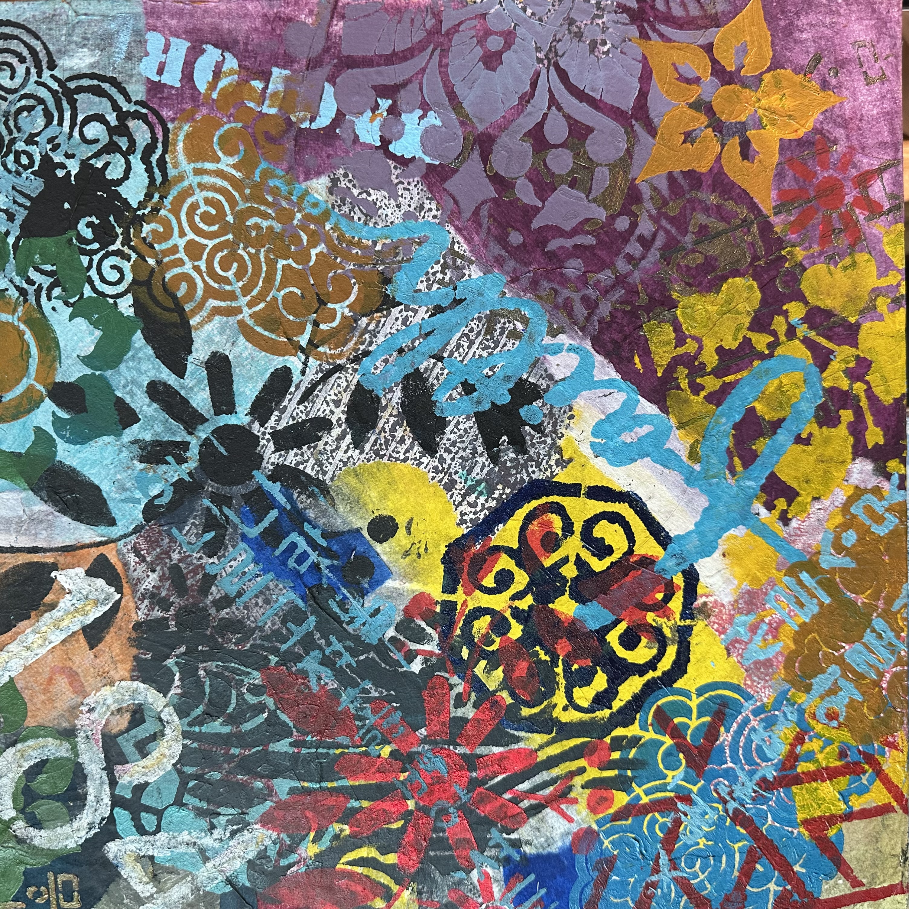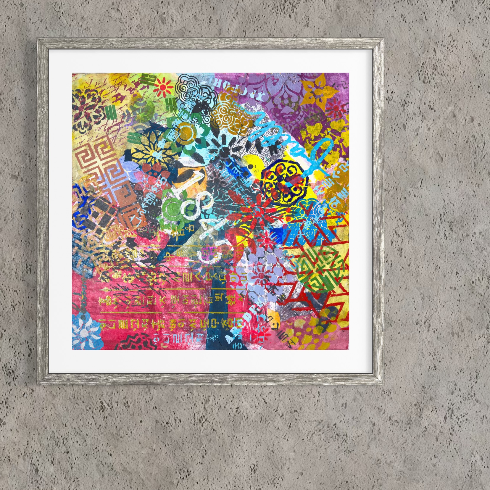 Mixed media on canvas (Dyed hanji and gel-printed hanji collage, acrylic stencil)