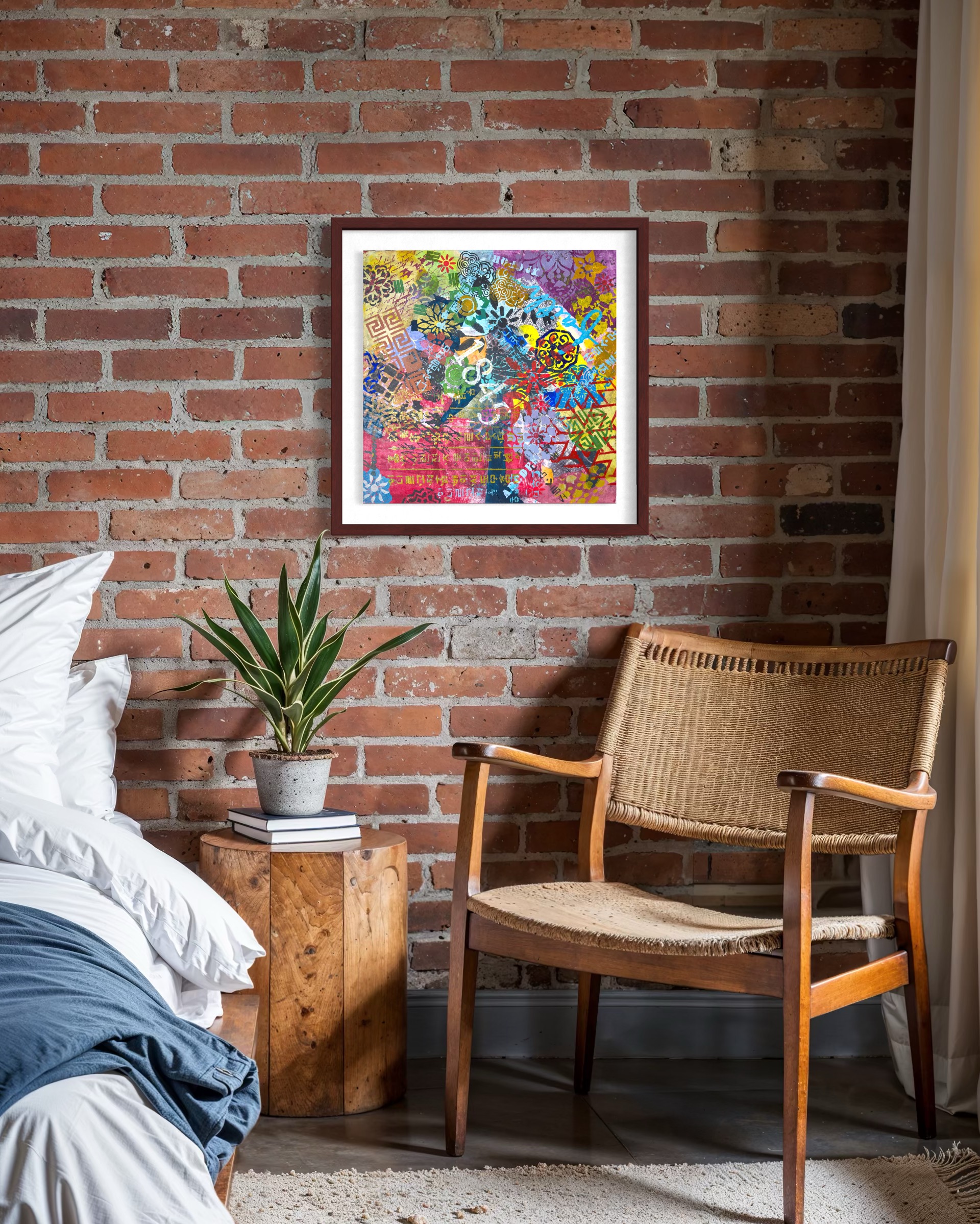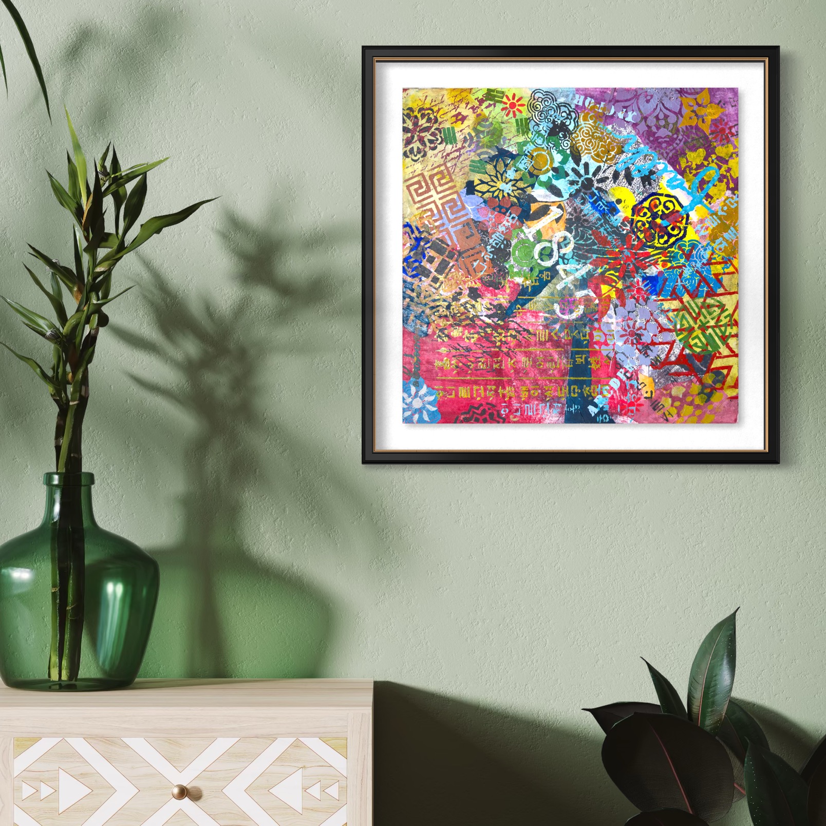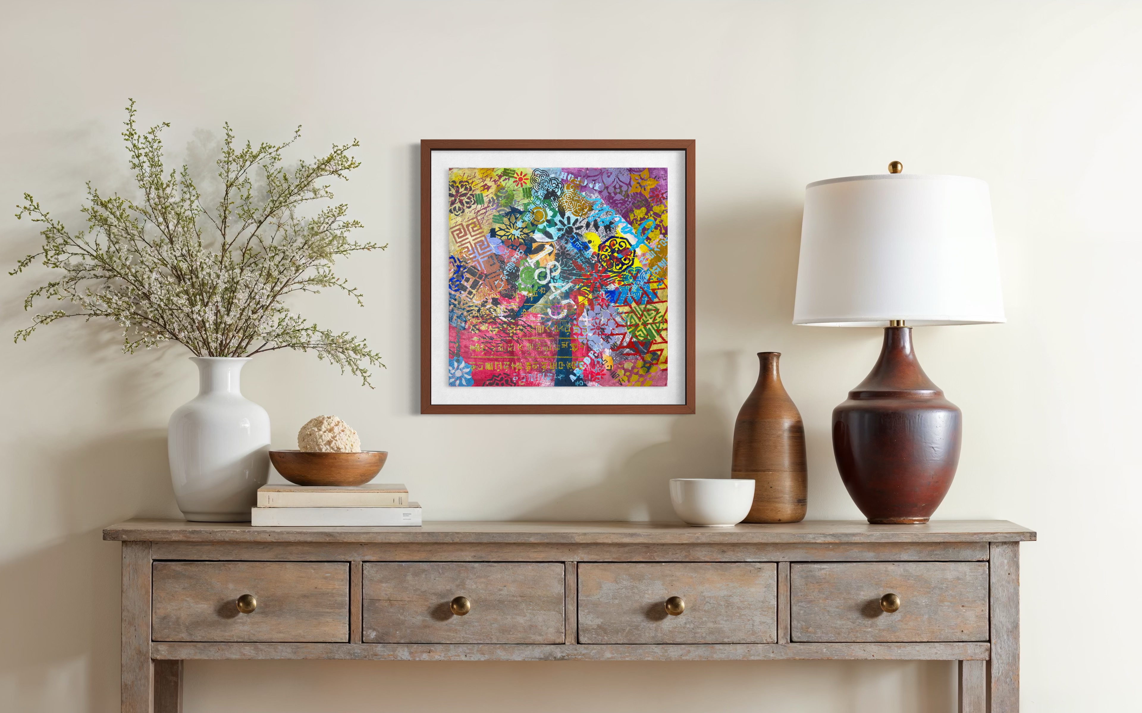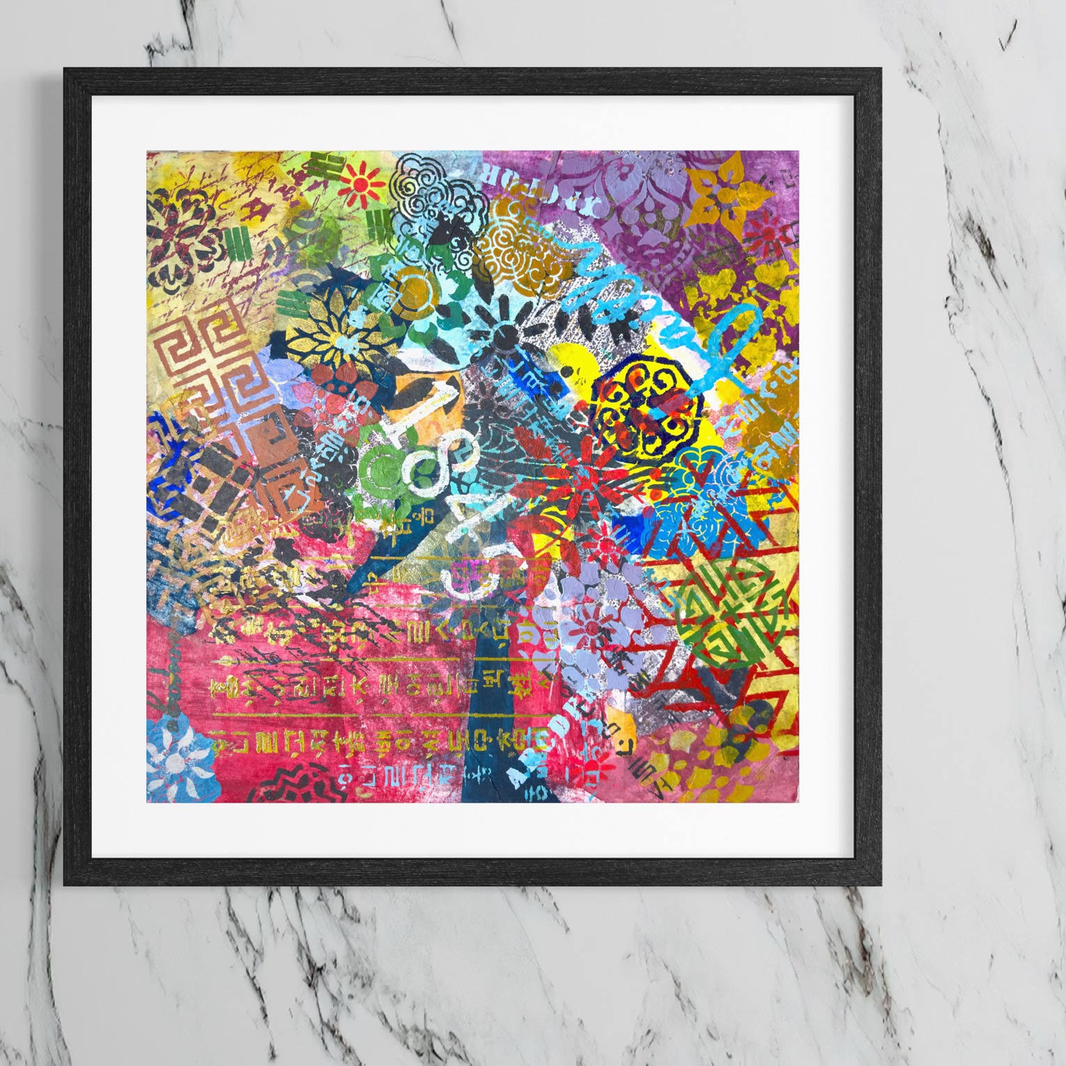 Mixed media on canvas (Dyed hanji and gel-printed hanji collage, acrylic stencil)