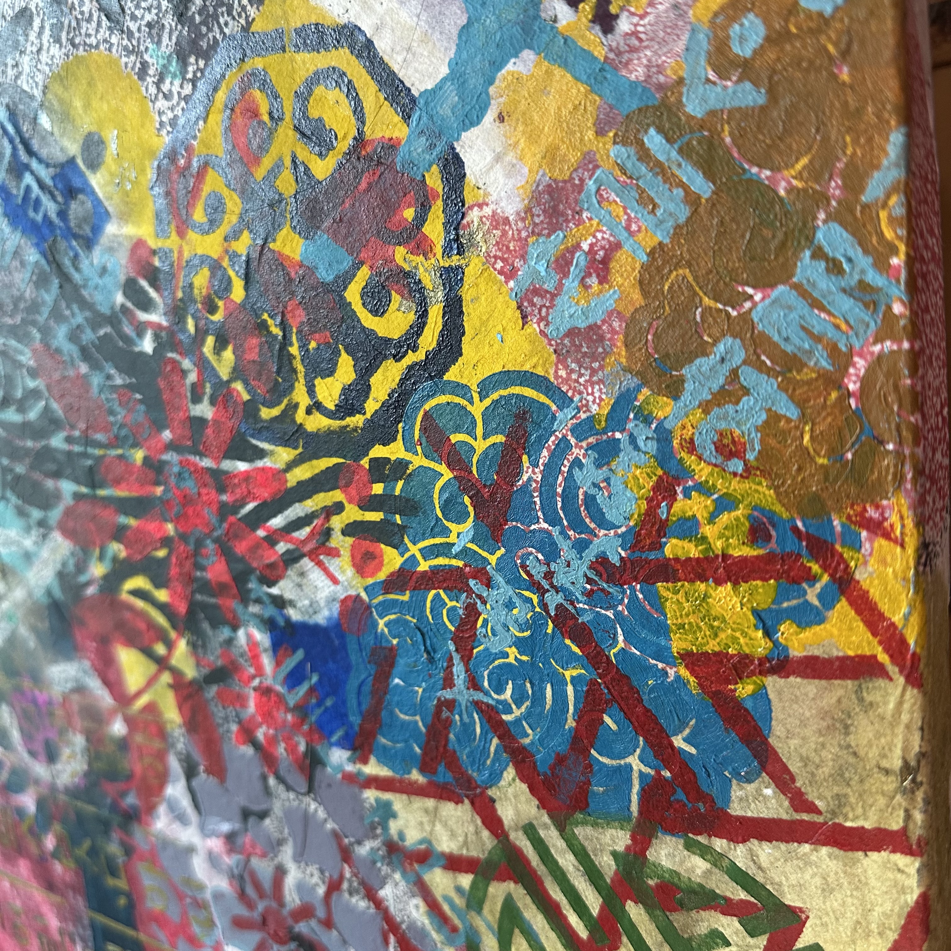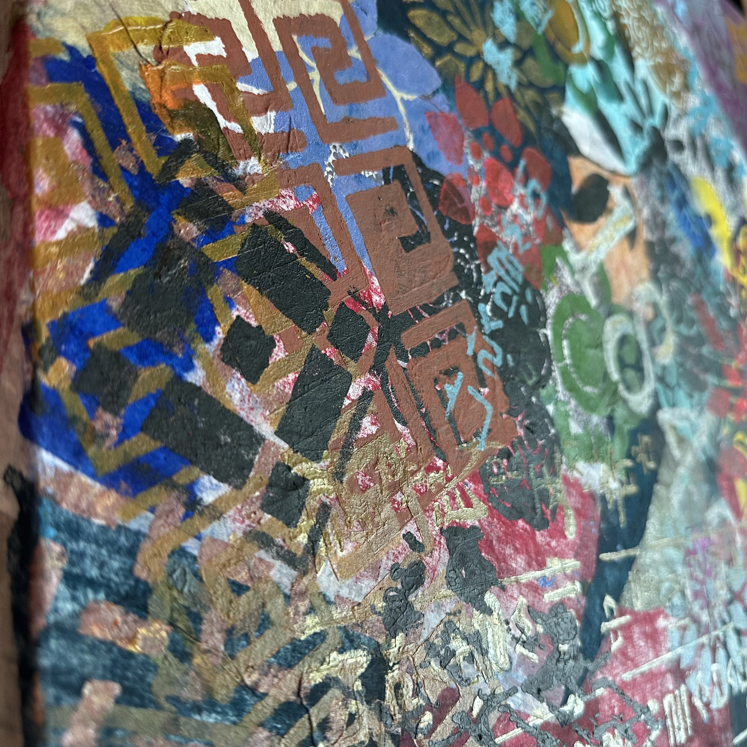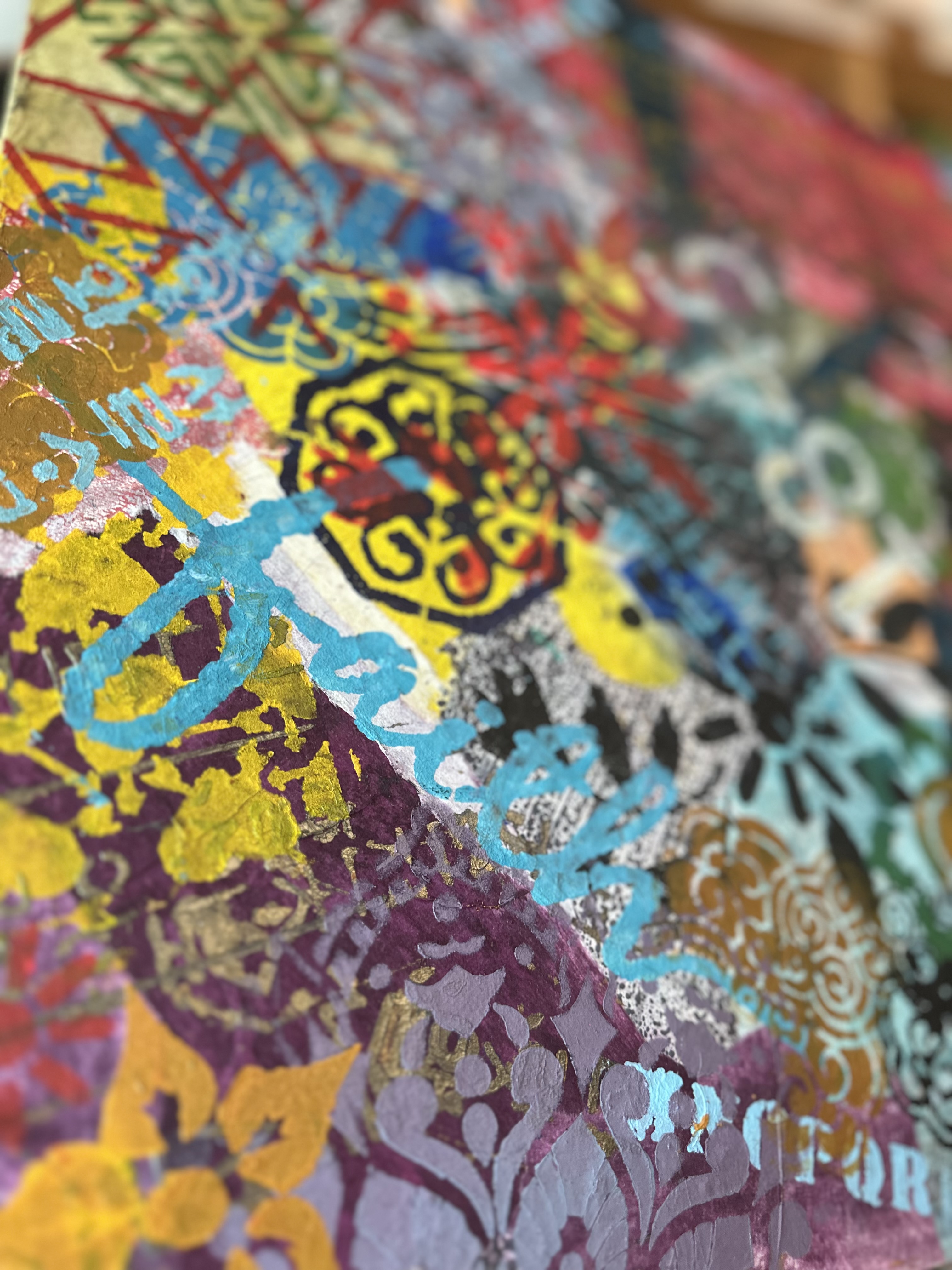 Here, they circulate as pure rhythm. Clouds, florals, and interlocking geometries are unmoored from their original meanings. They are not symbols. They are visual music. As the canvas turns, certain patterns move forward into visibility while others recede into texture. Nothing is lost; everything shifts. The patterns maintain their formal integrity while surrendering their fixed position.