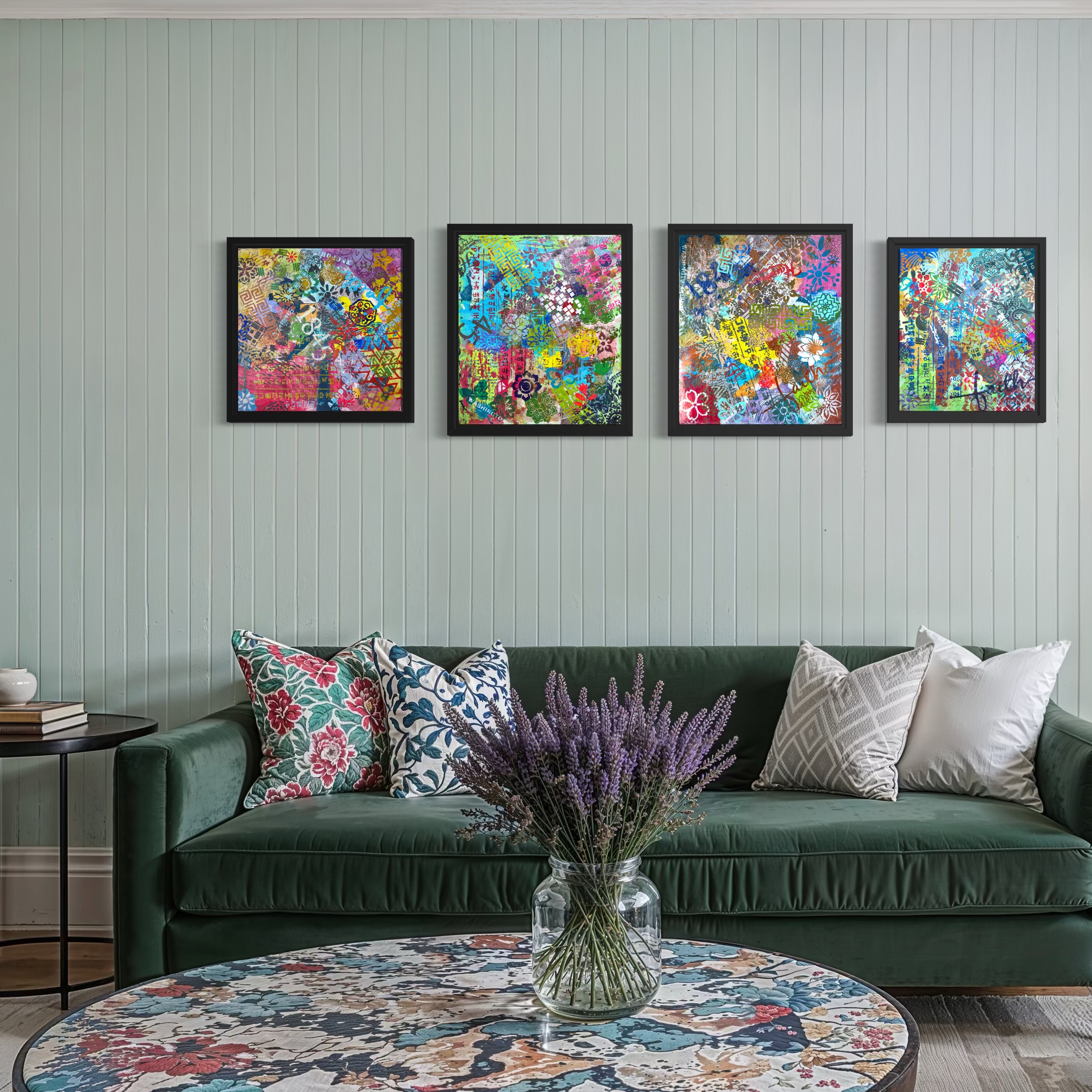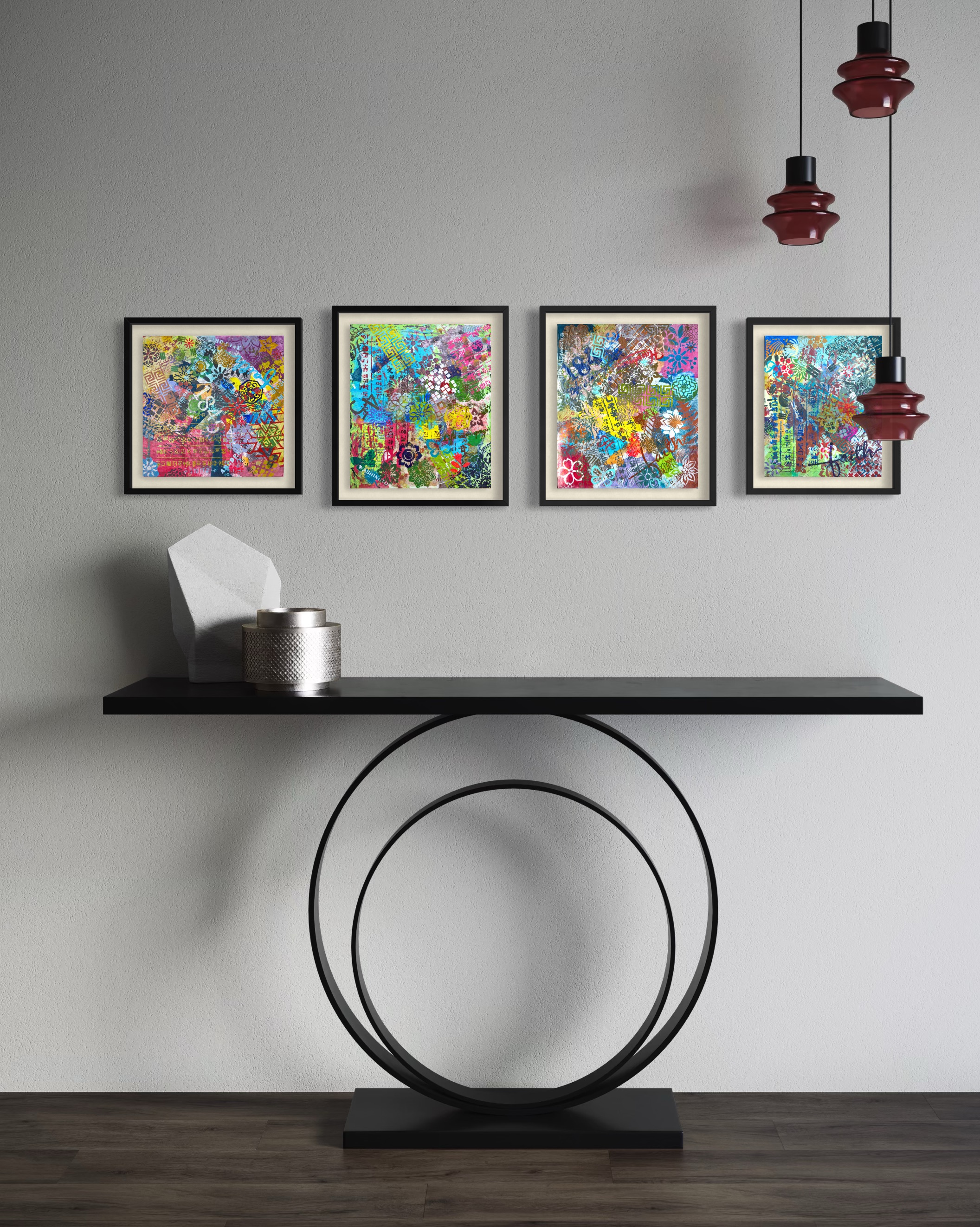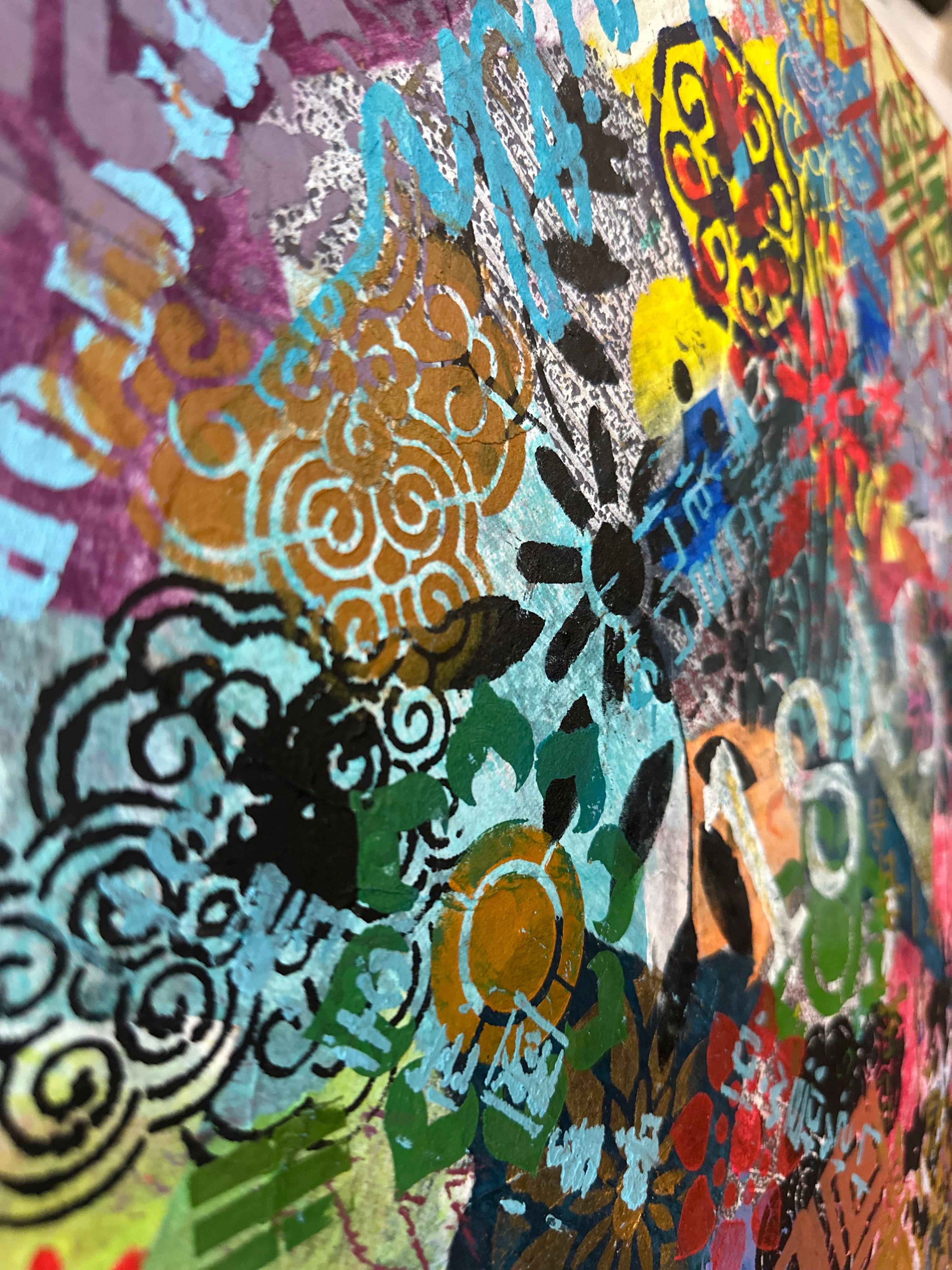 Here, they circulate as pure rhythm. Clouds, florals, and interlocking geometries are unmoored from their original meanings. They are not symbols. They are visual music. As the canvas turns, certain patterns move forward into visibility while others recede into texture. Nothing is lost; everything shifts. The patterns maintain their formal integrity while surrendering their fixed position.