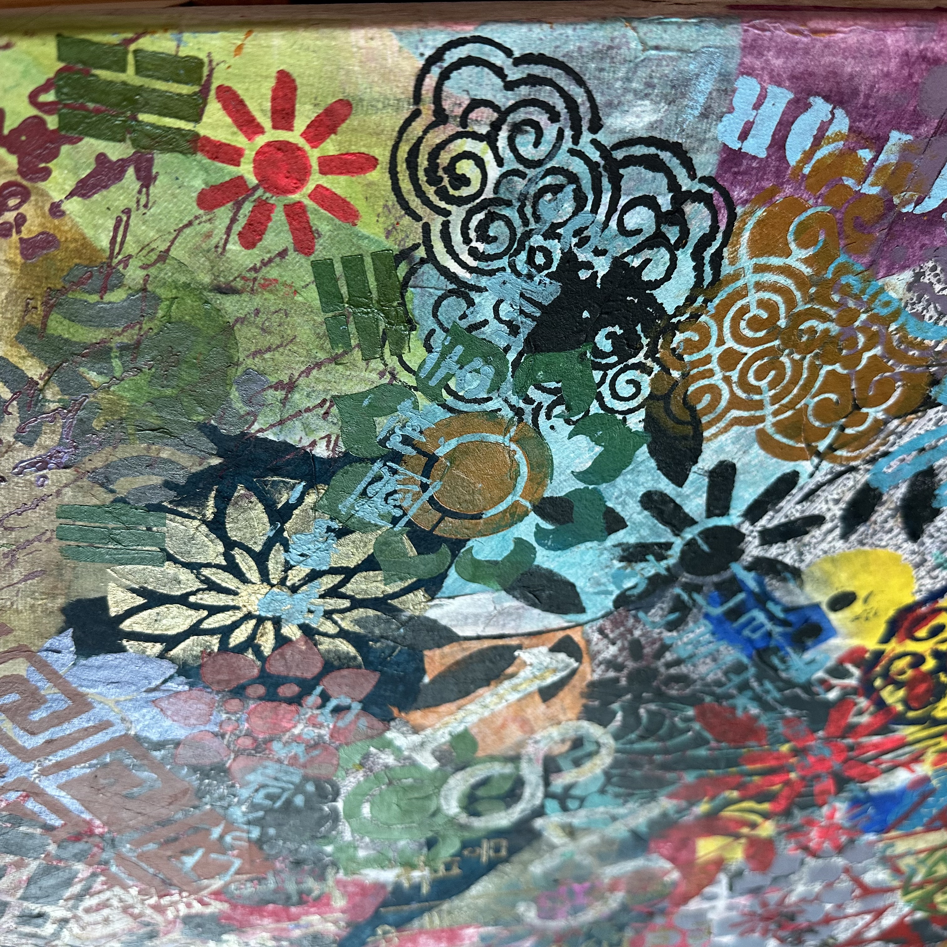 Across this absorptive ground, acrylic stencil introduces immediate clarity. Dancheong cloud motifs, released from architectural function, rotate freely within the square format. As the canvas turns, certain elements move forward into visibility while others recede into rhythm.
