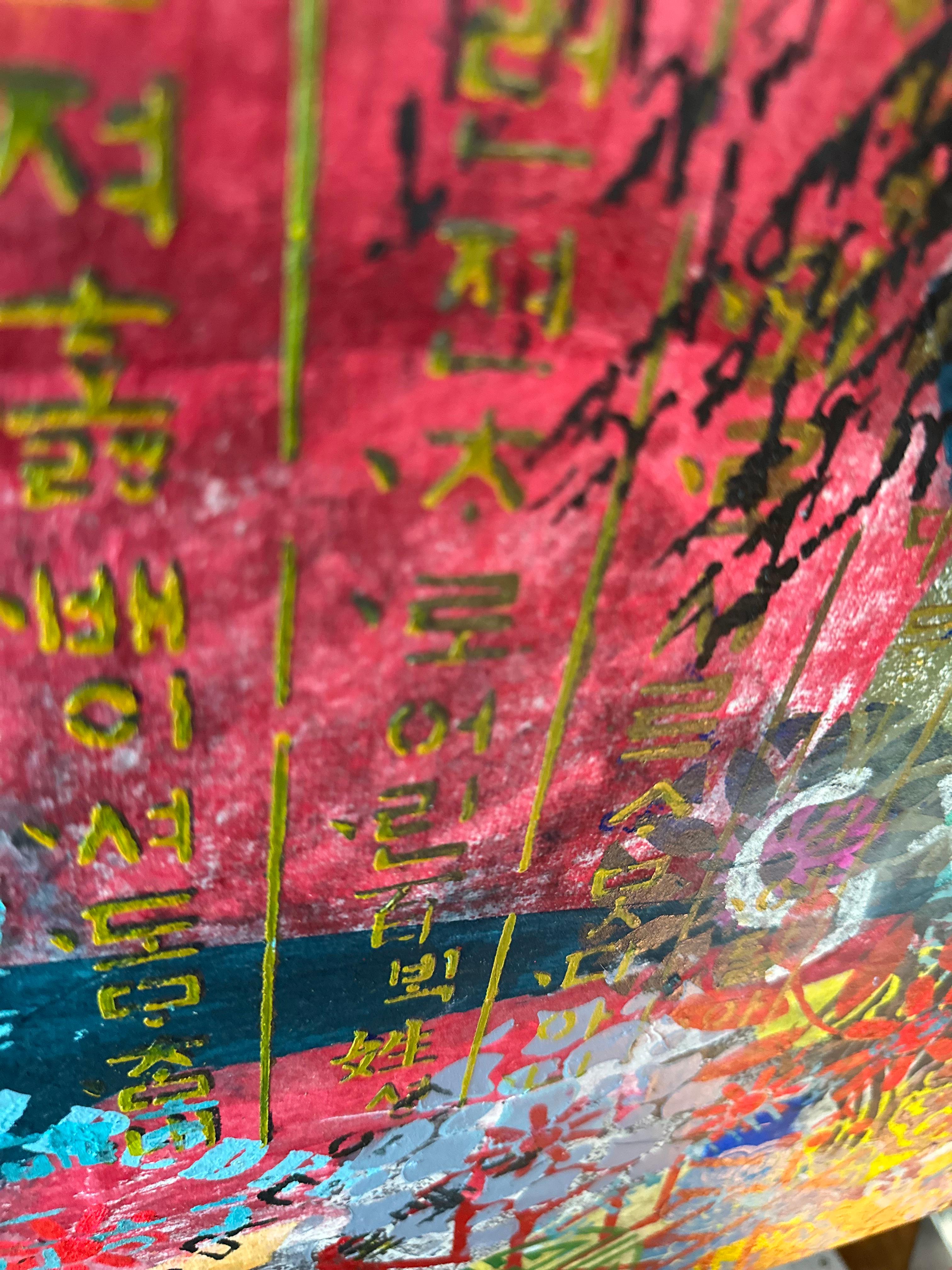 Over this absorptive ground, acrylic stencil introduces clarity and interruption. Gold Hangul descends vertically across the lower portion of the canvas, following the traditional direction of Korean writing. The script is architectural, weighted, formal. It does not invite reading so much as it asserts presence—the presence of a language that has survived colonization, modernization, and the homogenizing pressures of global visual culture. Yet this is not nationalist assertion. The Hangul does not dominate. It coexists.