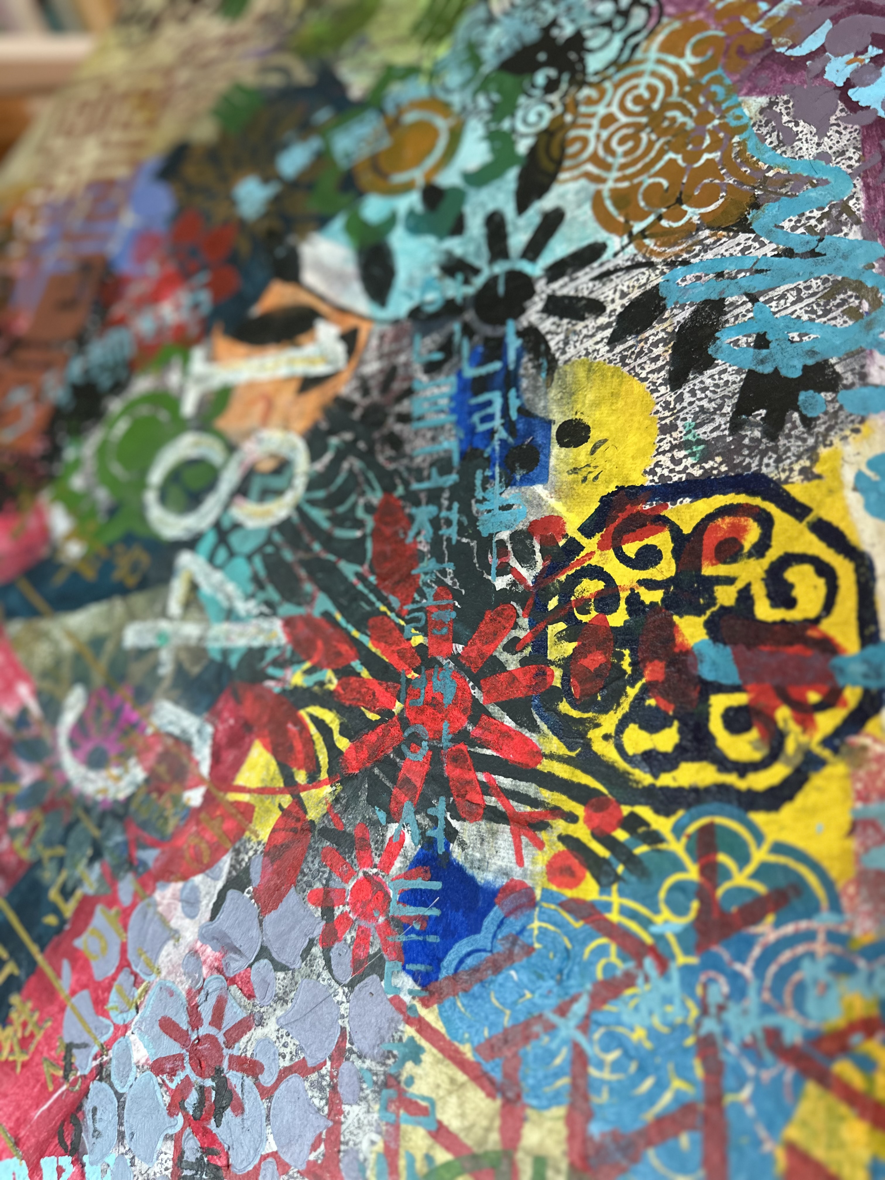 Beneath them, layers of dyed hanji build depth through time and absorption. Scarlet, ochre, and turquoise sink into the paper's fibers rather than sitting on the surface, forming translucent strata as they overlap. This depth is not illusion but accumulation—the material record of time made visible through the traditional process of dyeing. Gel-printed hanji adds residual marks and traces, speaking of sustained making rather than a single gesture.
