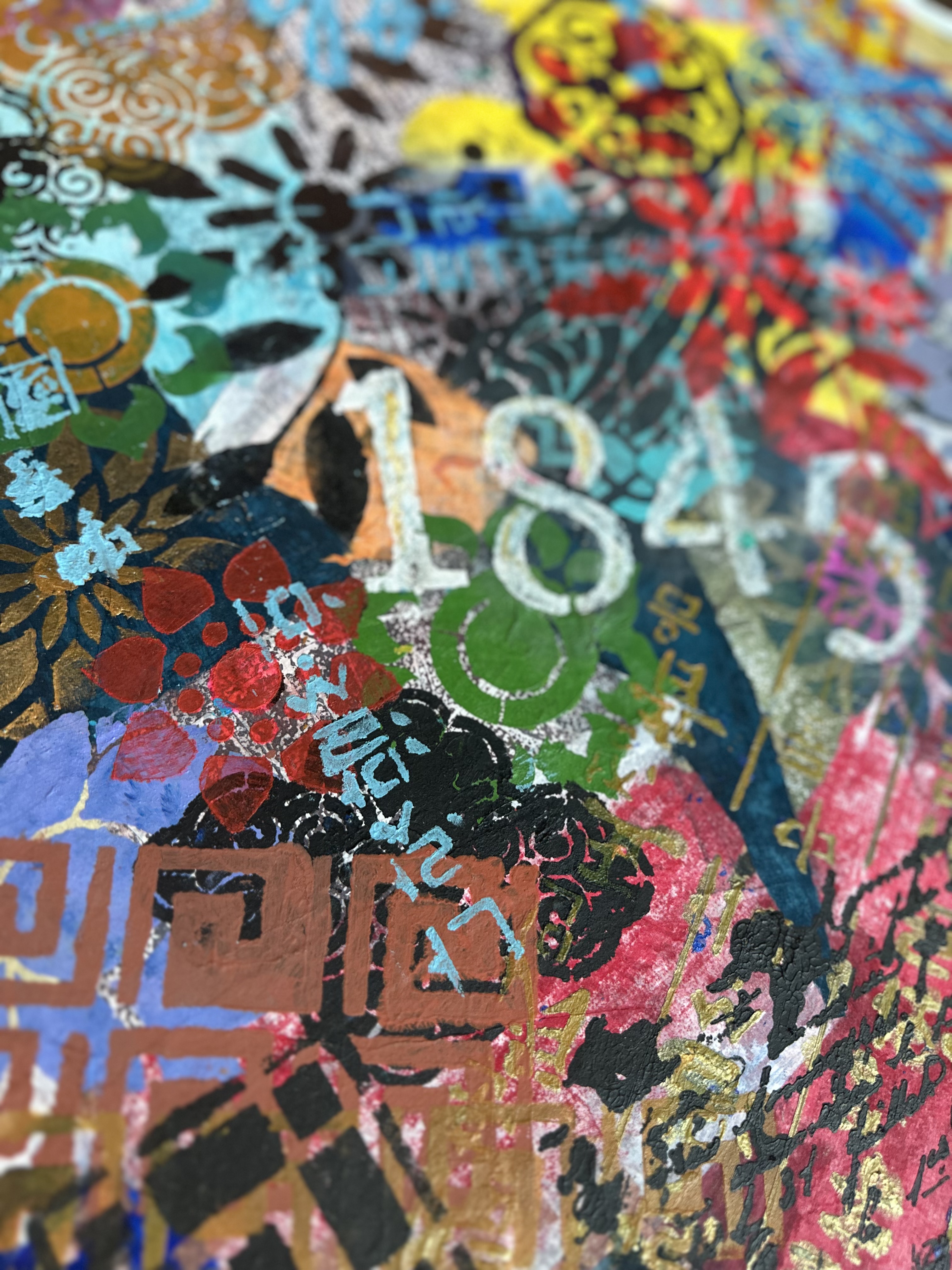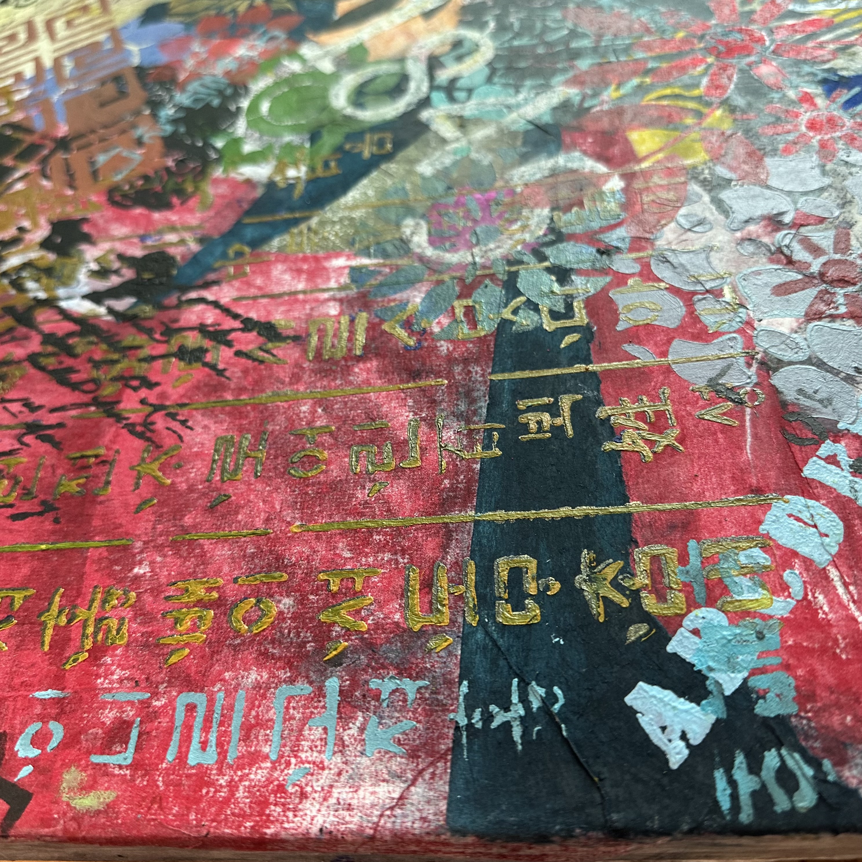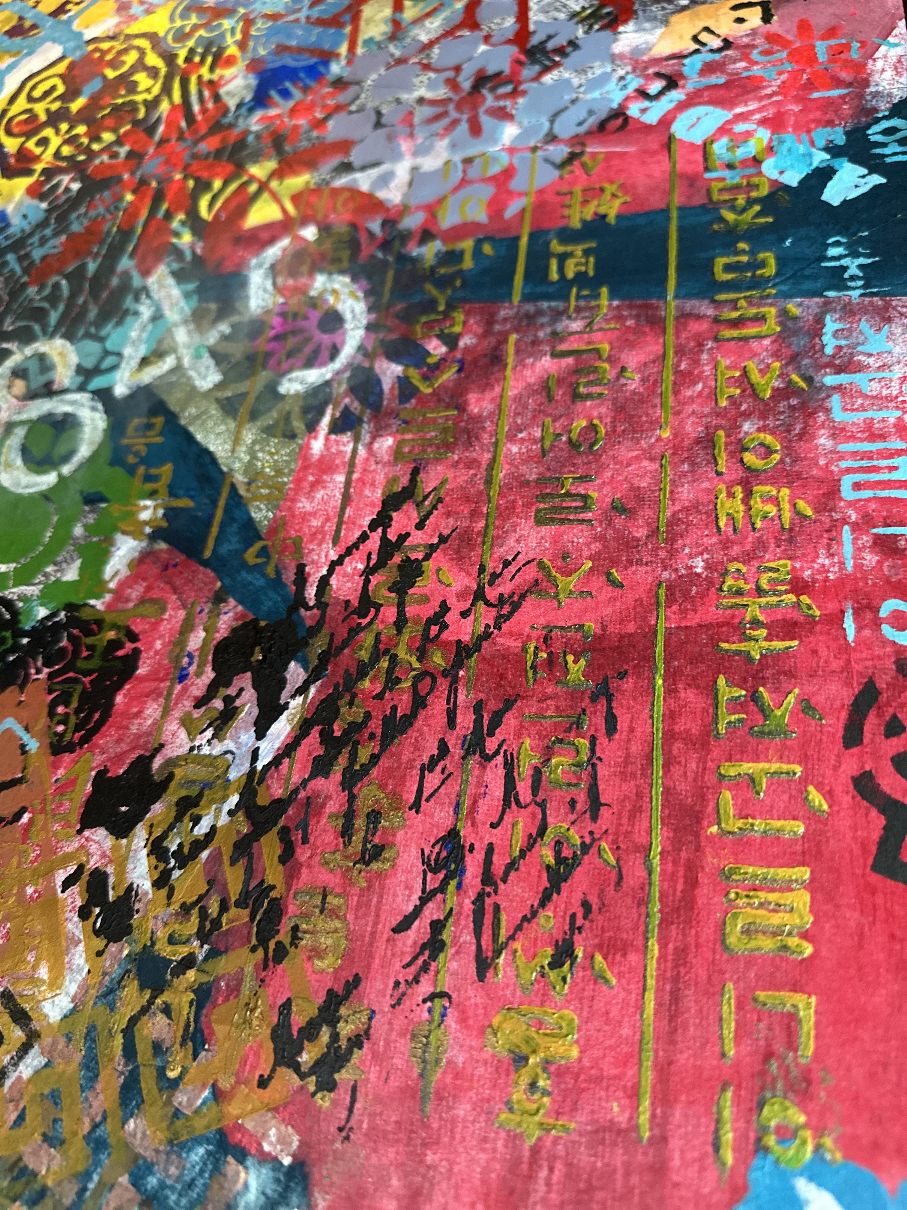 Across this absorptive ground, acrylic stencil introduces clarity and interruption. Gold Hangul descends with architectural discipline, carrying the weight of formal language and historical structure. Its vertical logic stabilizes the surface, anchoring the composition with the authority of written tradition.