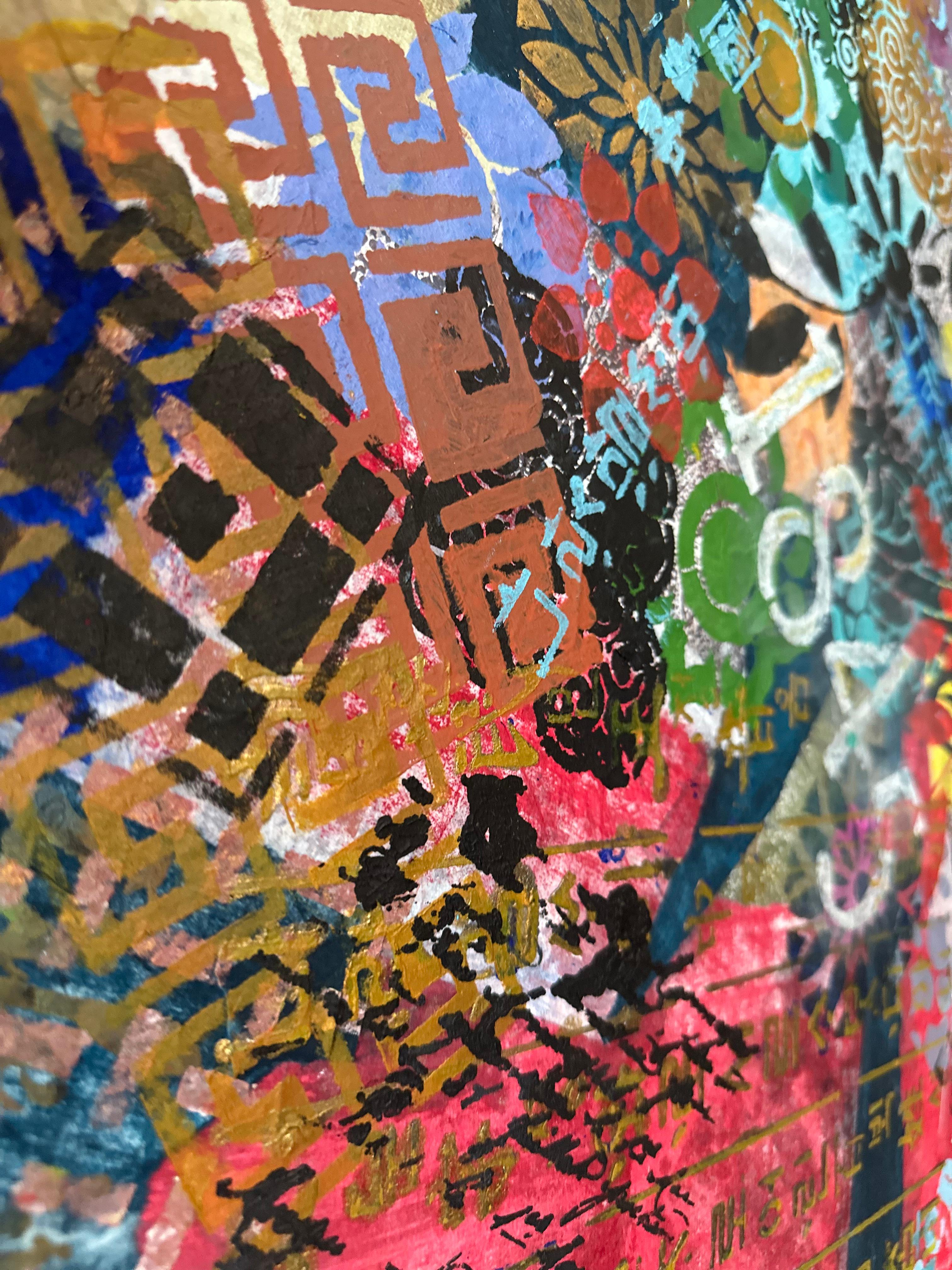 There is no fixed front to this painting. Dyed hanji holds color deep within its fiber, building depth through time rather than surface. Gold Hangul descends with structure; French cursive drifts across it, refusing to settle into meaning. Dancheong patterns rotate freely. Nothing resolves. What remains is radiance—forms resting in difference, without apology.