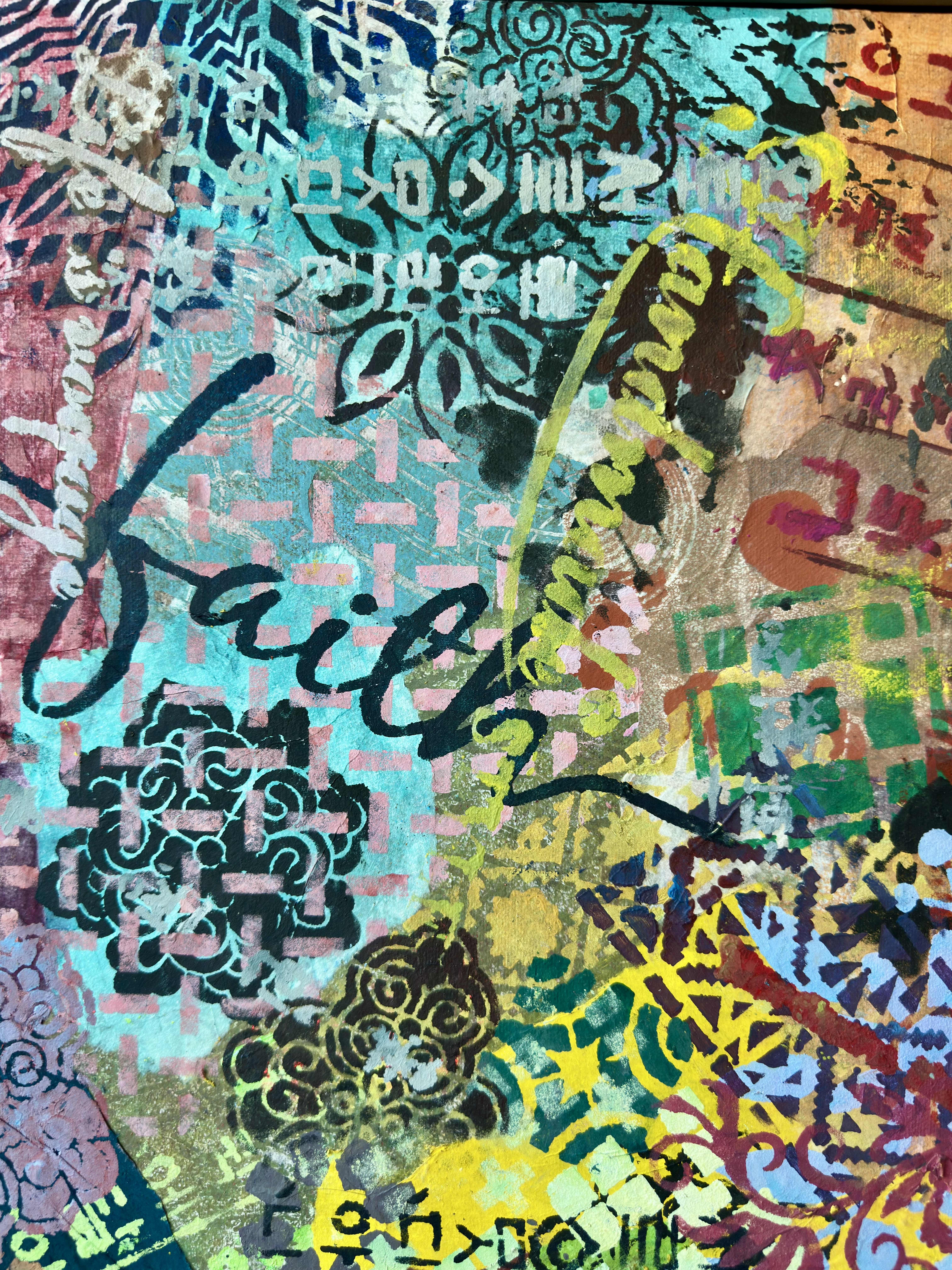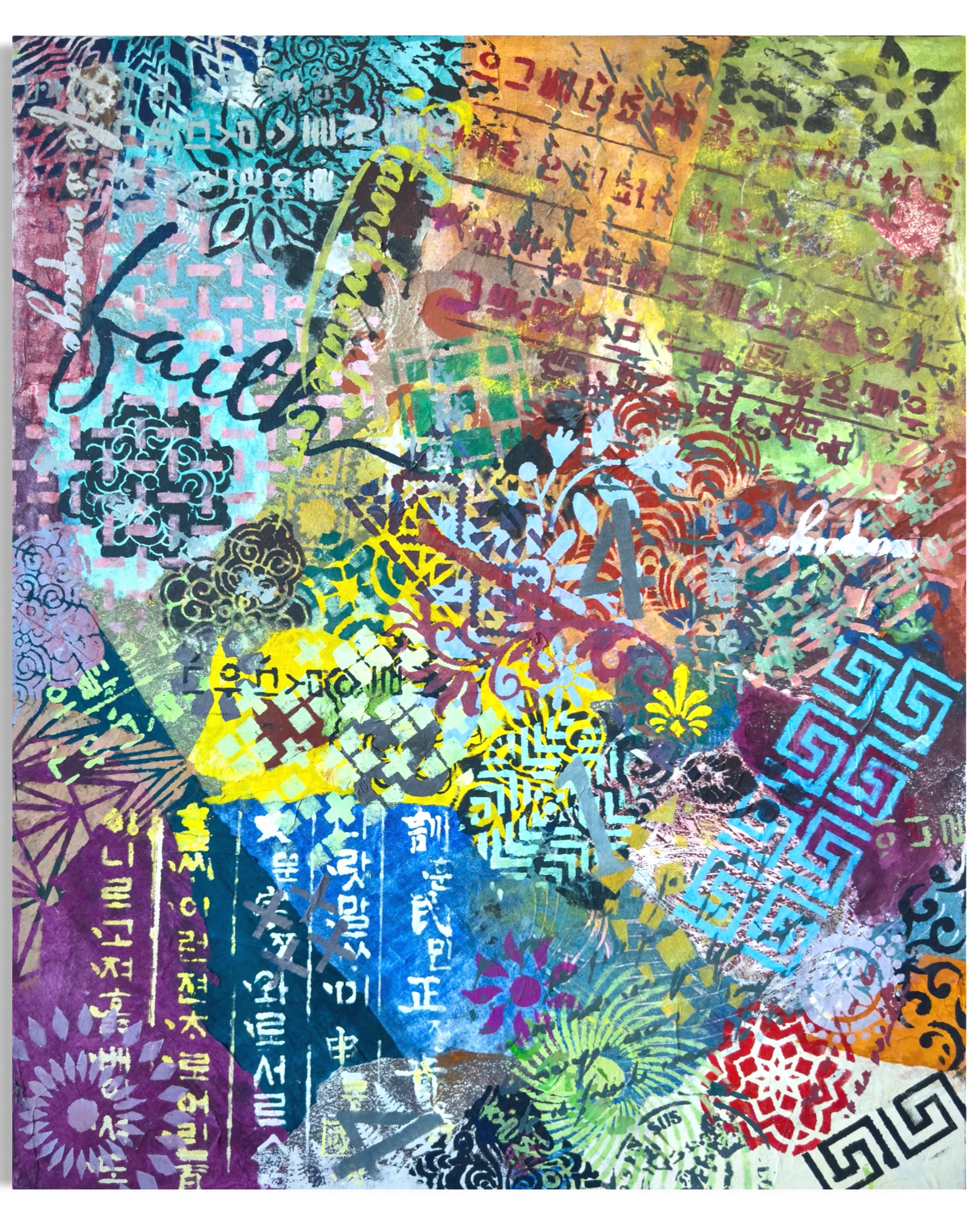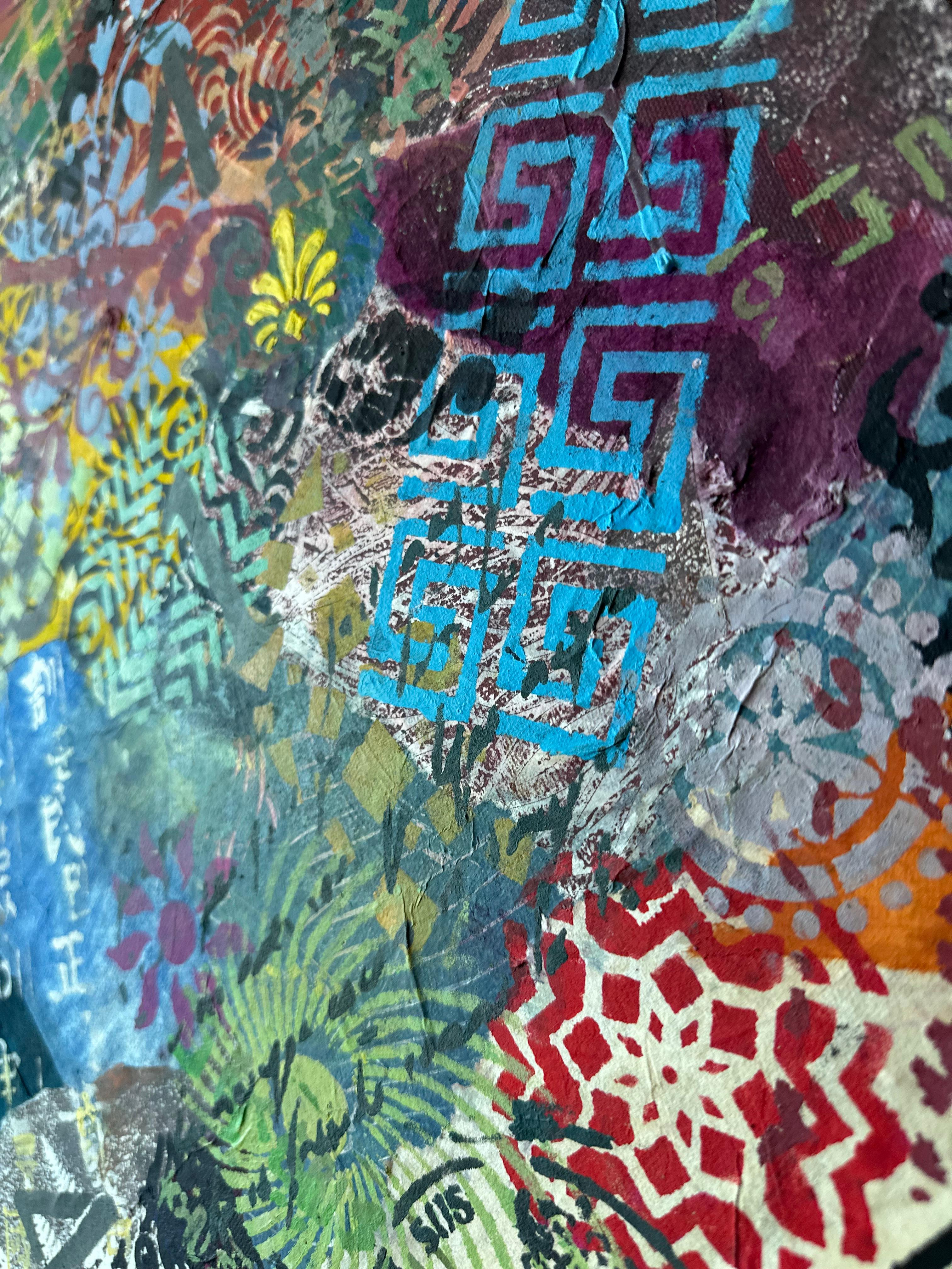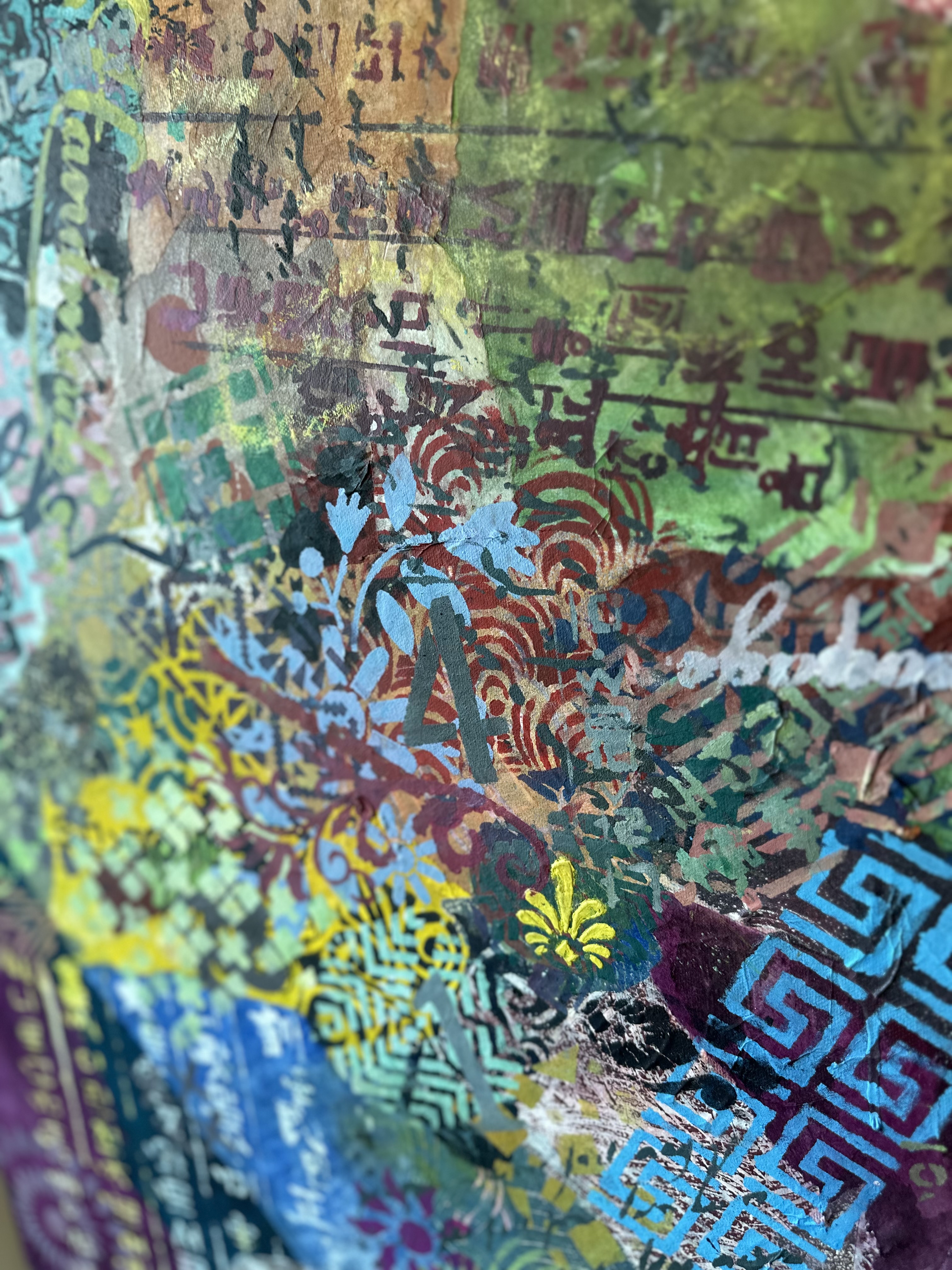 Forms arrive all at once—patterns collide, scripts cross, colors push forward without apology. This is not a composition; it is an overflow. What once held its edge begins to soften; what dissolves refuses to disappear.
