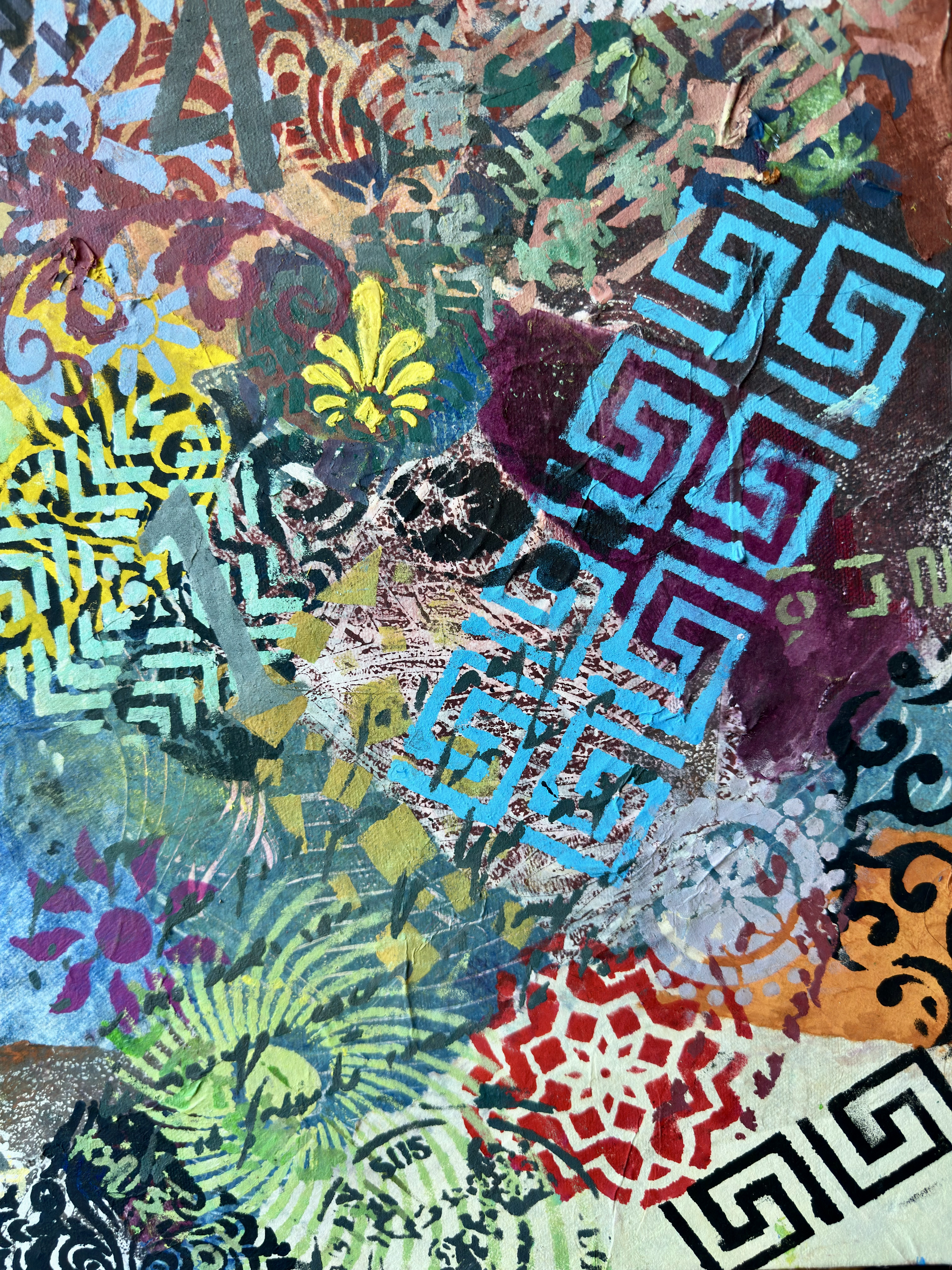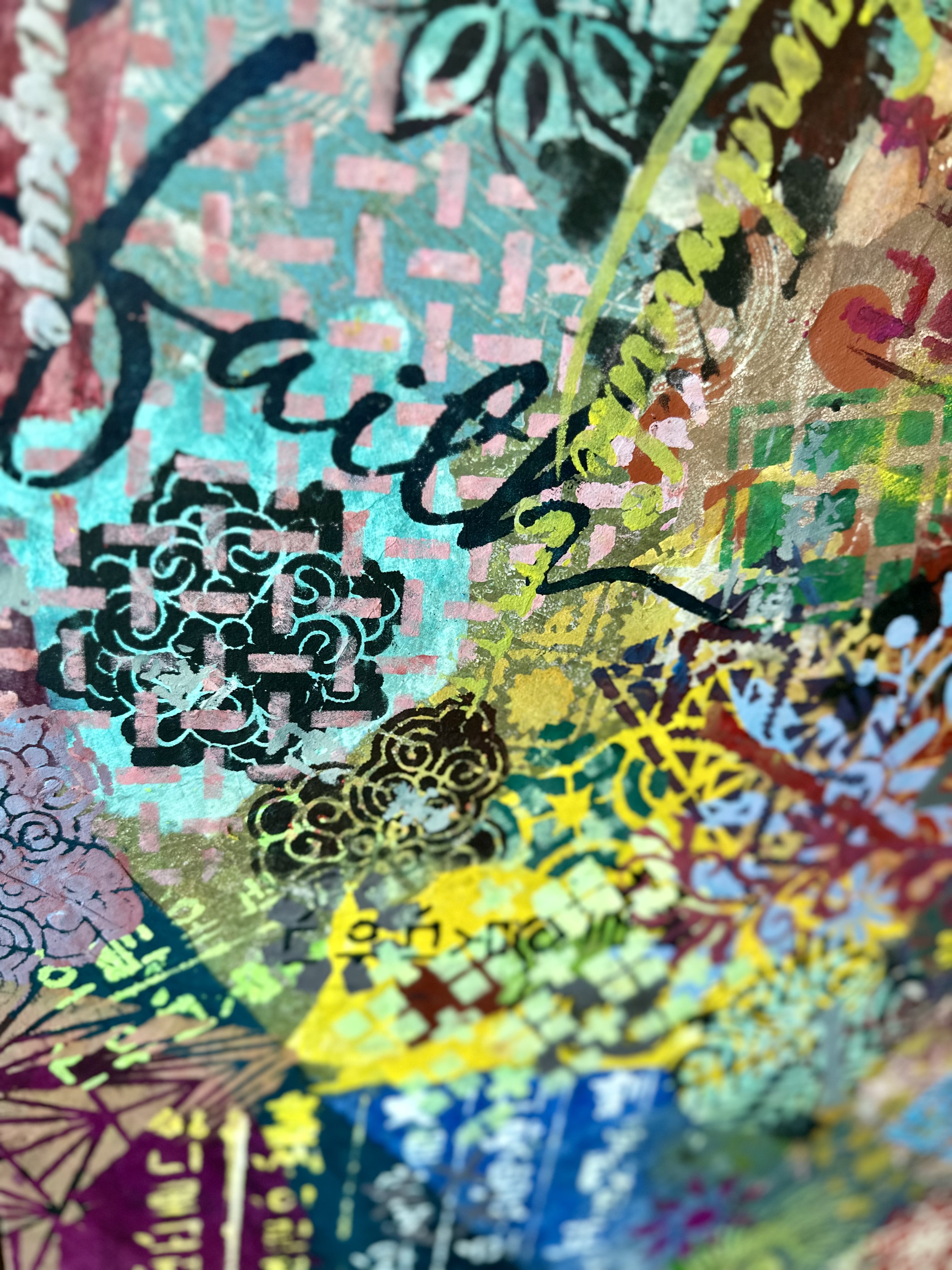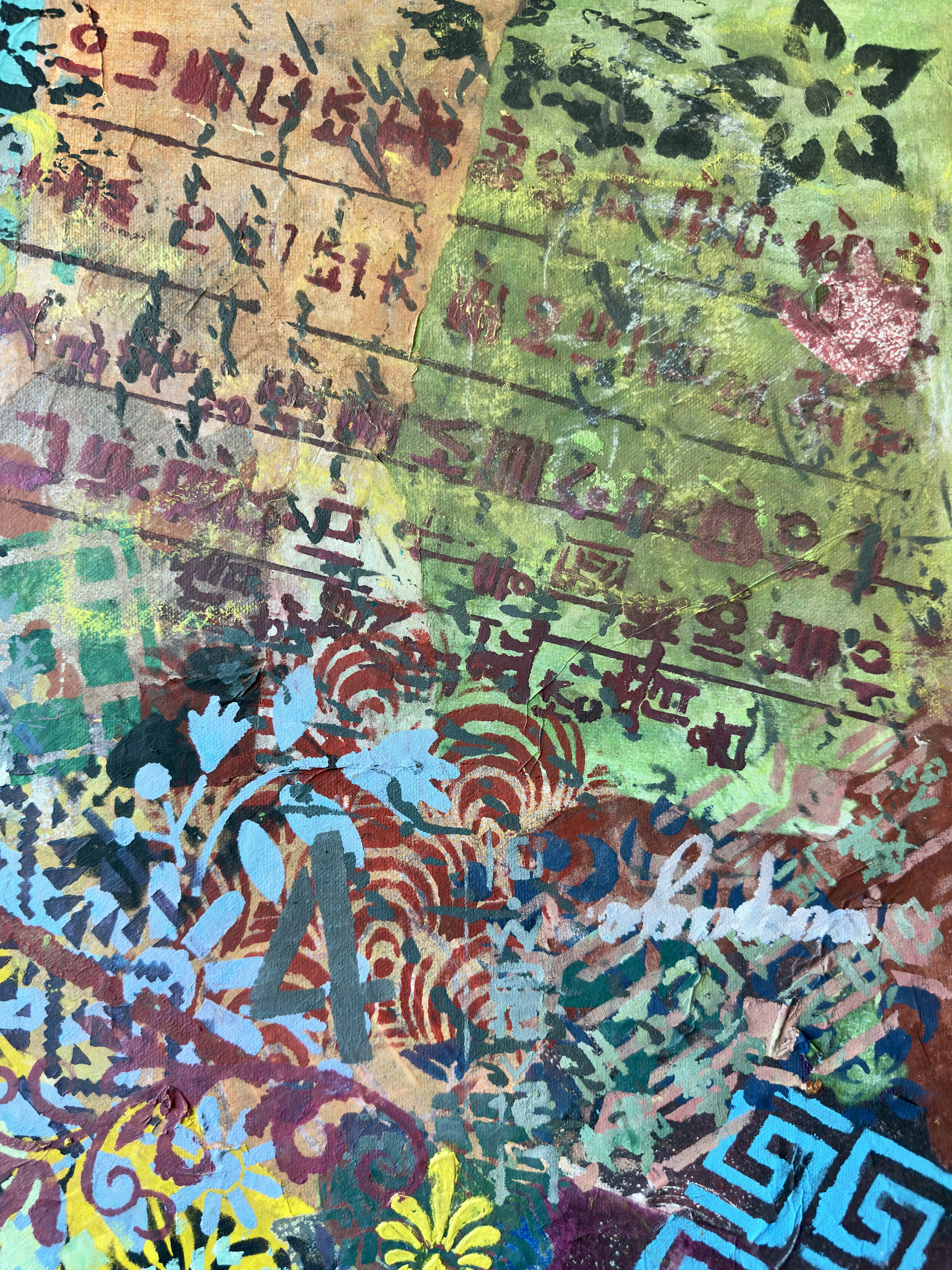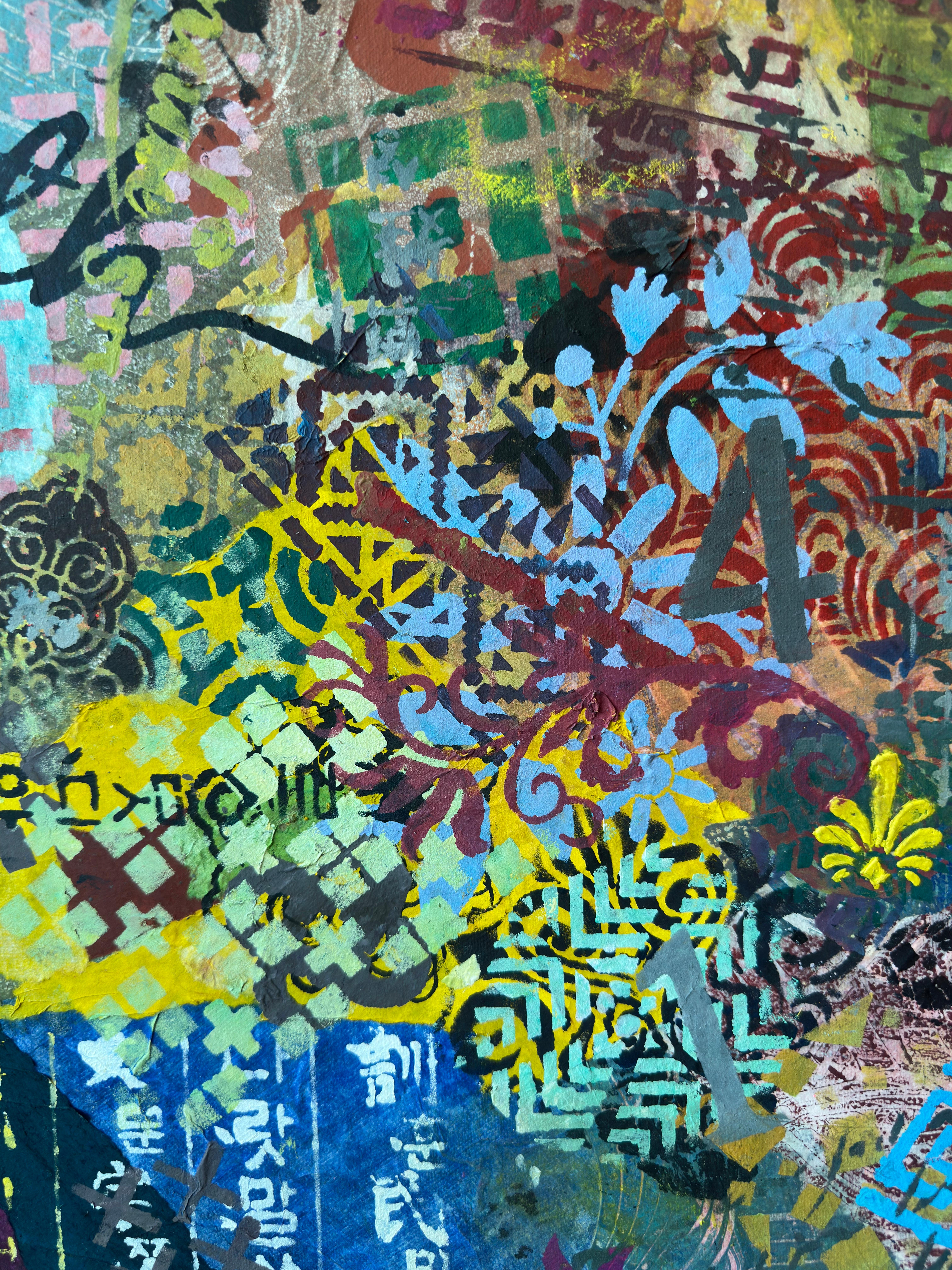Forms arrive all at once—patterns collide, scripts cross, colors push forward without apology. This is not a composition; it is an overflow. What once held its edge begins to soften; what dissolves refuses to disappear.