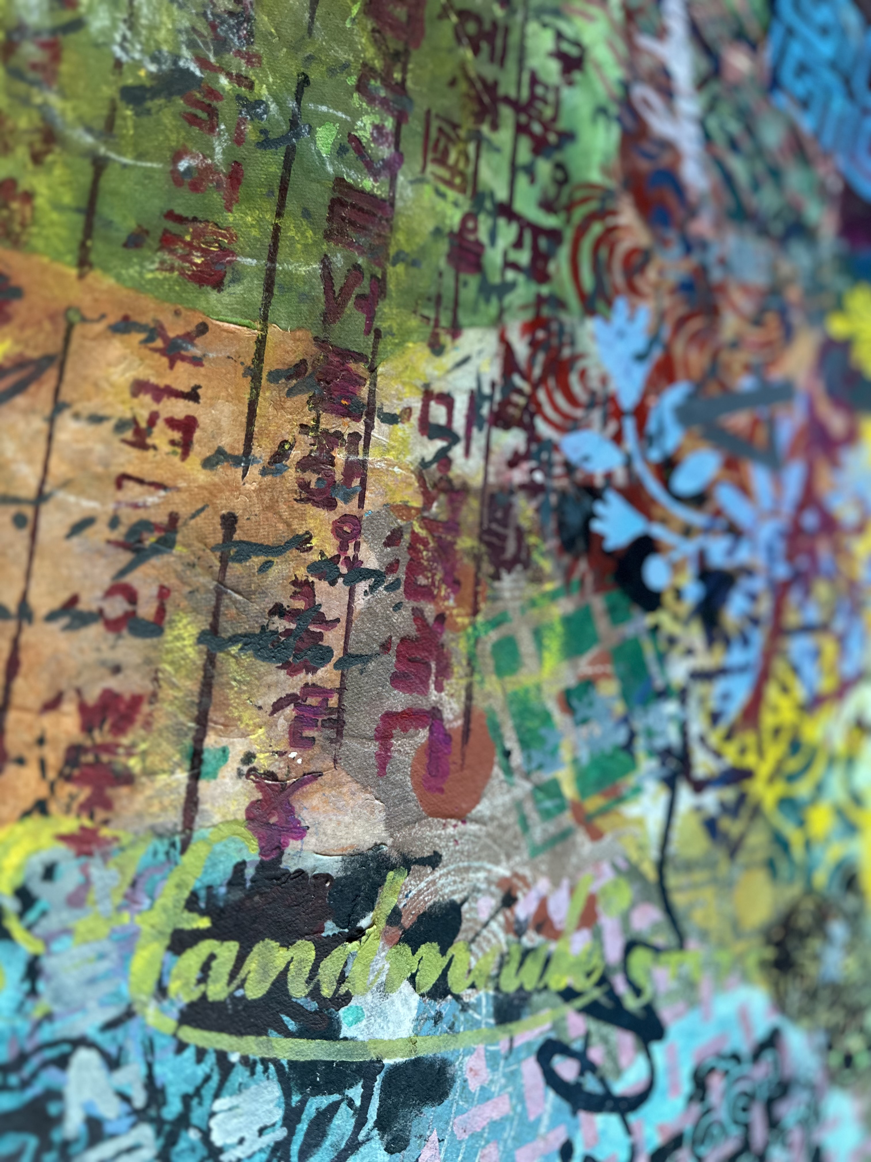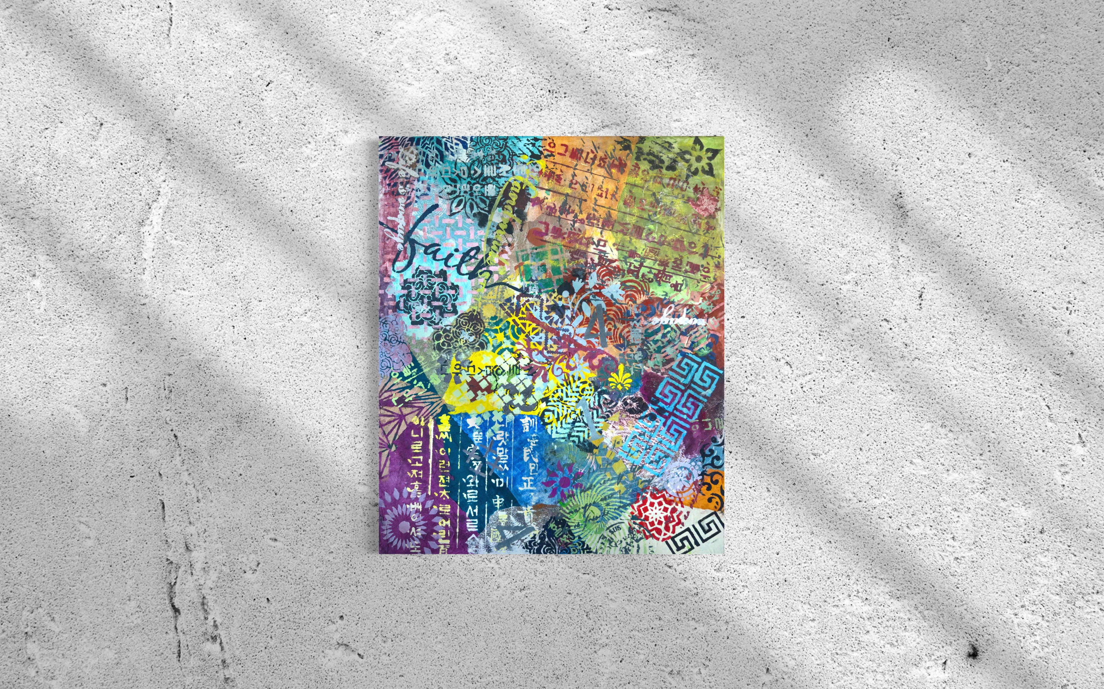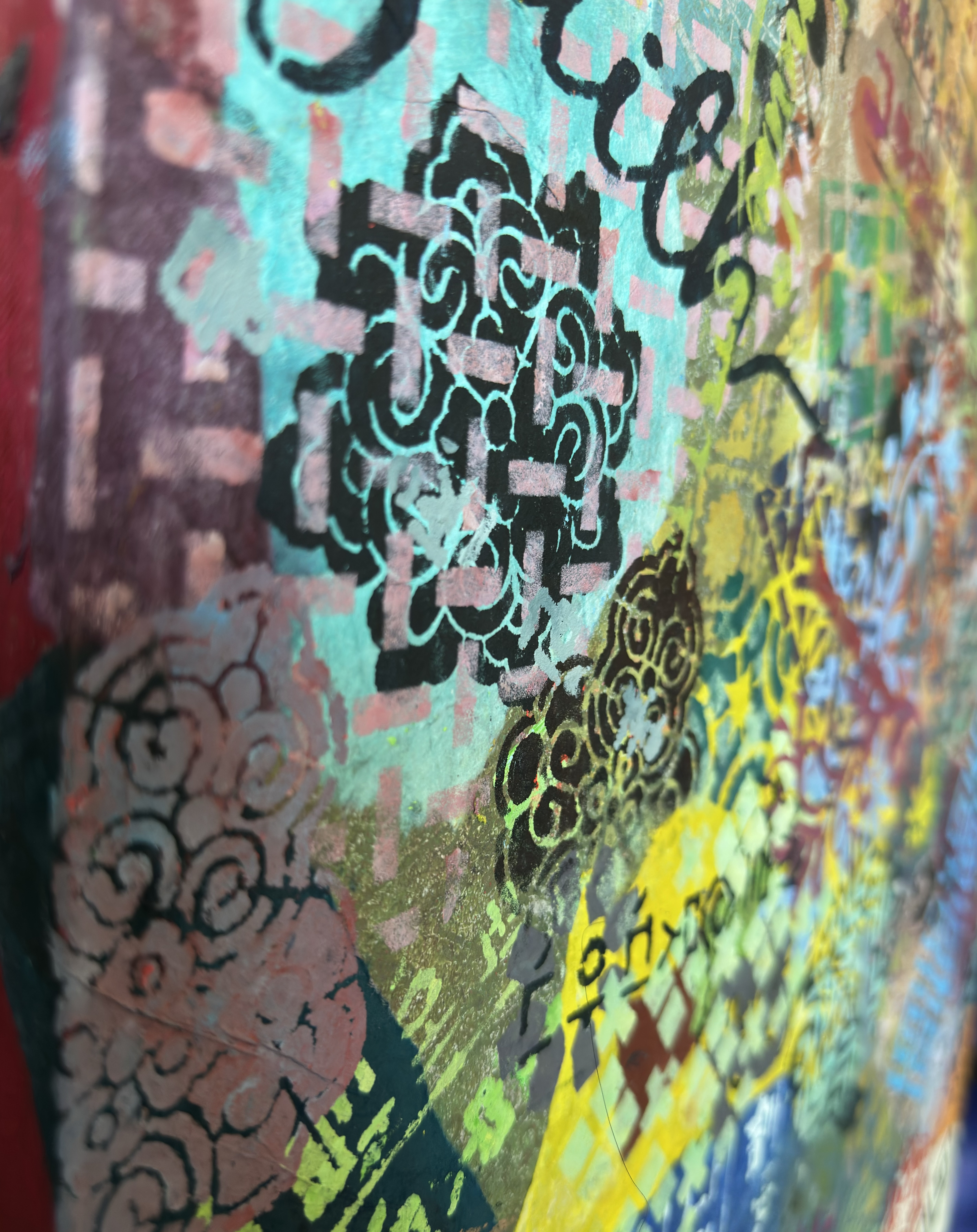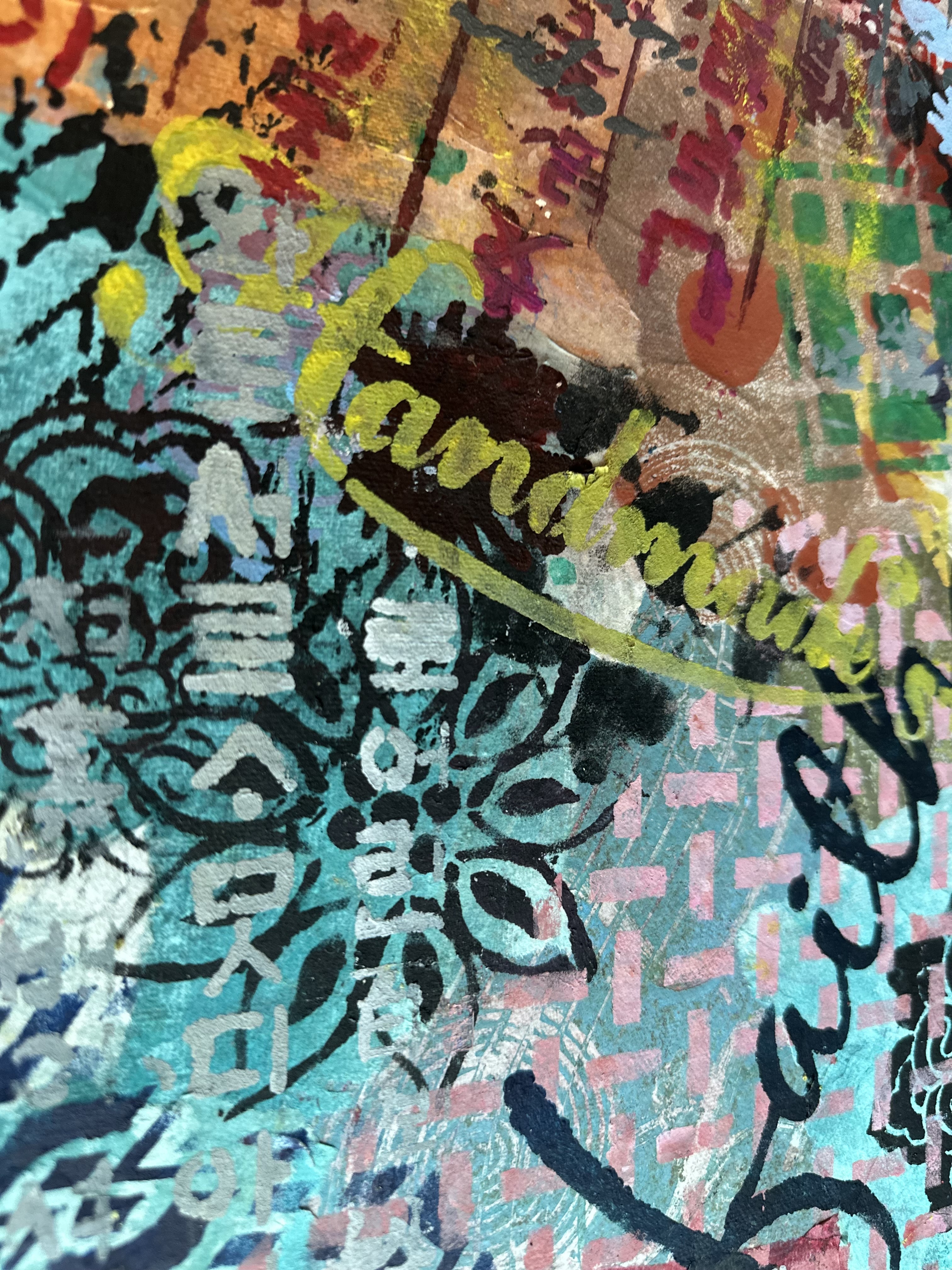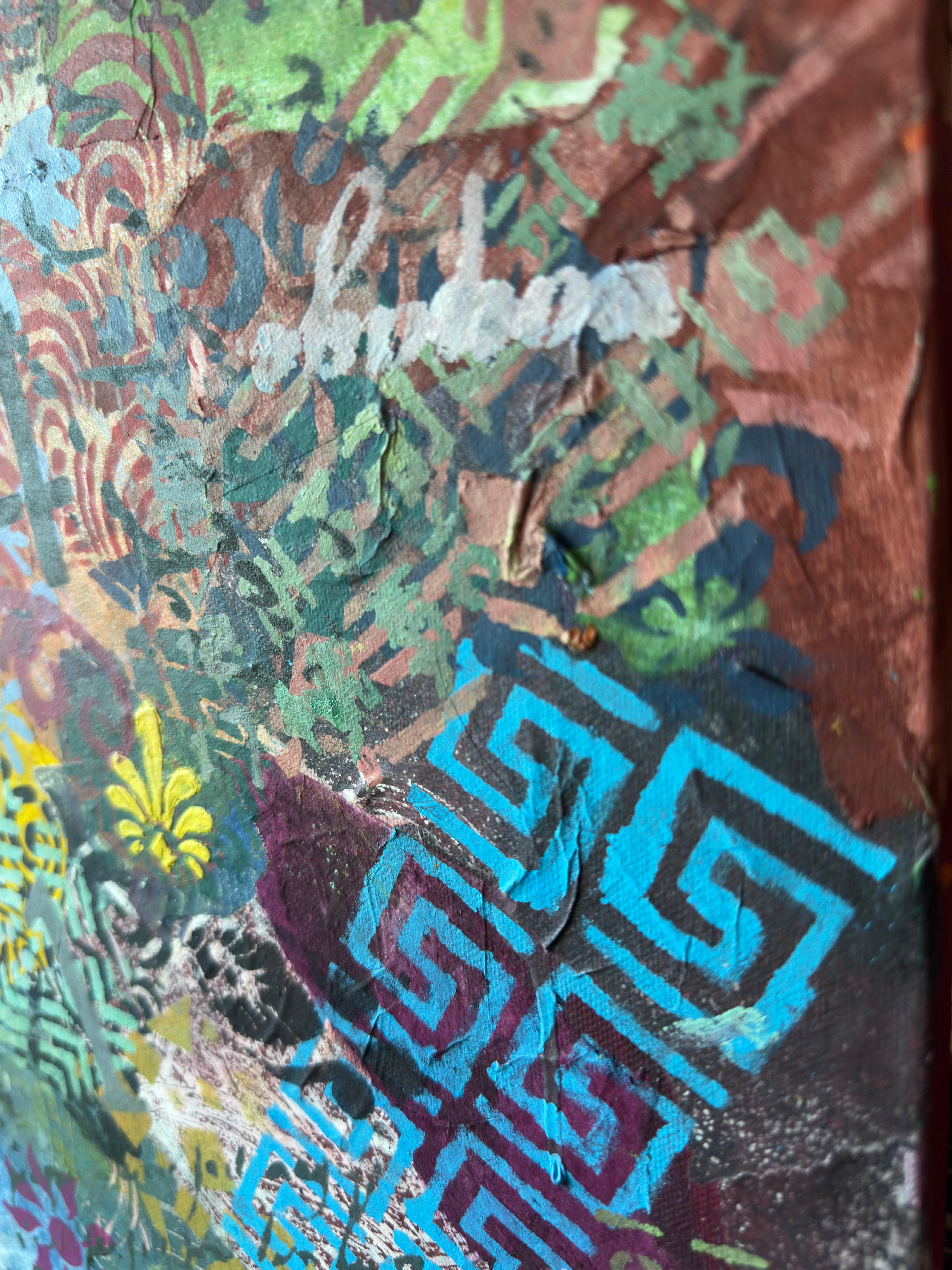 Forms arrive all at once—patterns collide, scripts cross, colors push forward without apology. This is not a composition; it is an overflow. What once held its edge begins to soften; what dissolves refuses to disappear.
