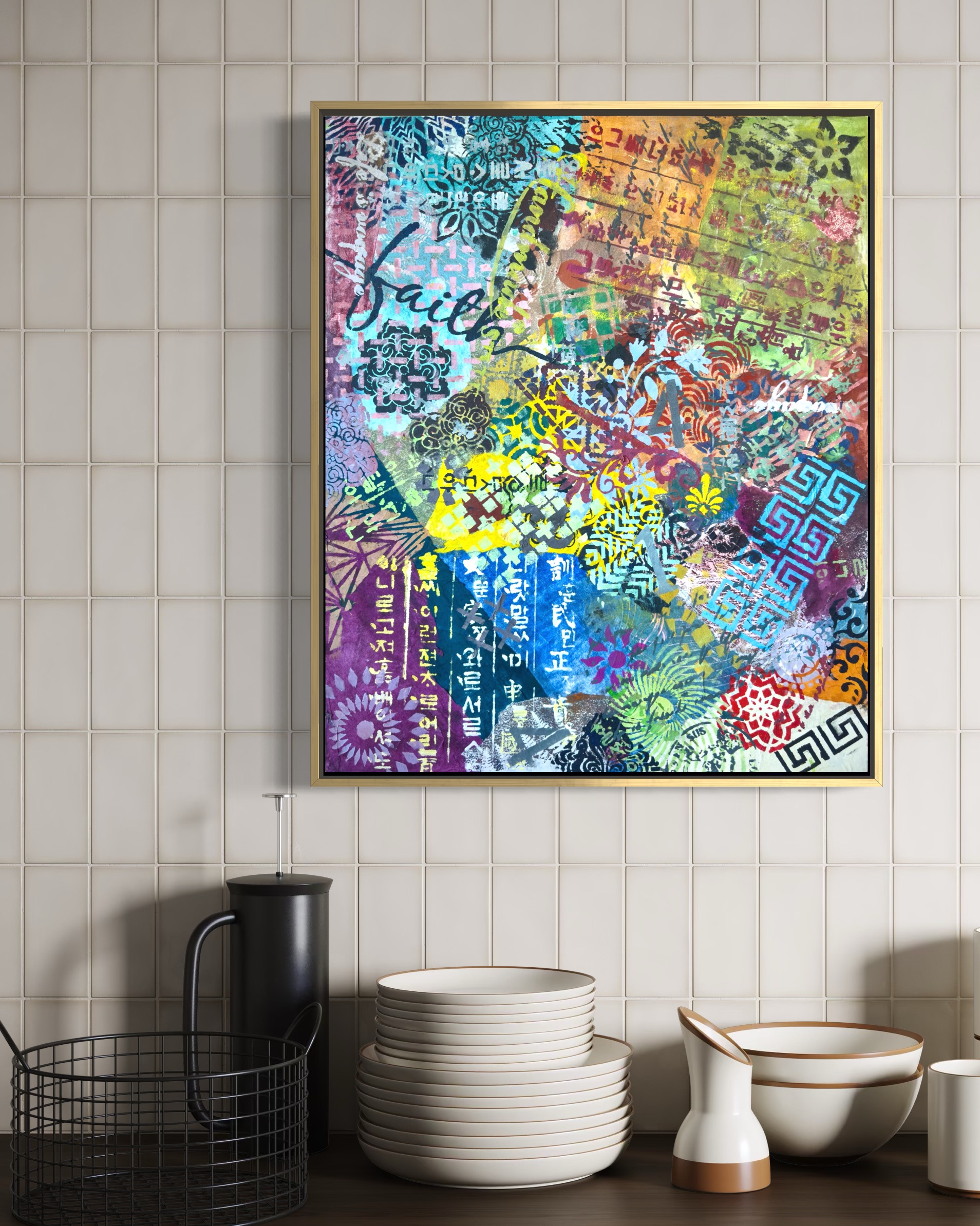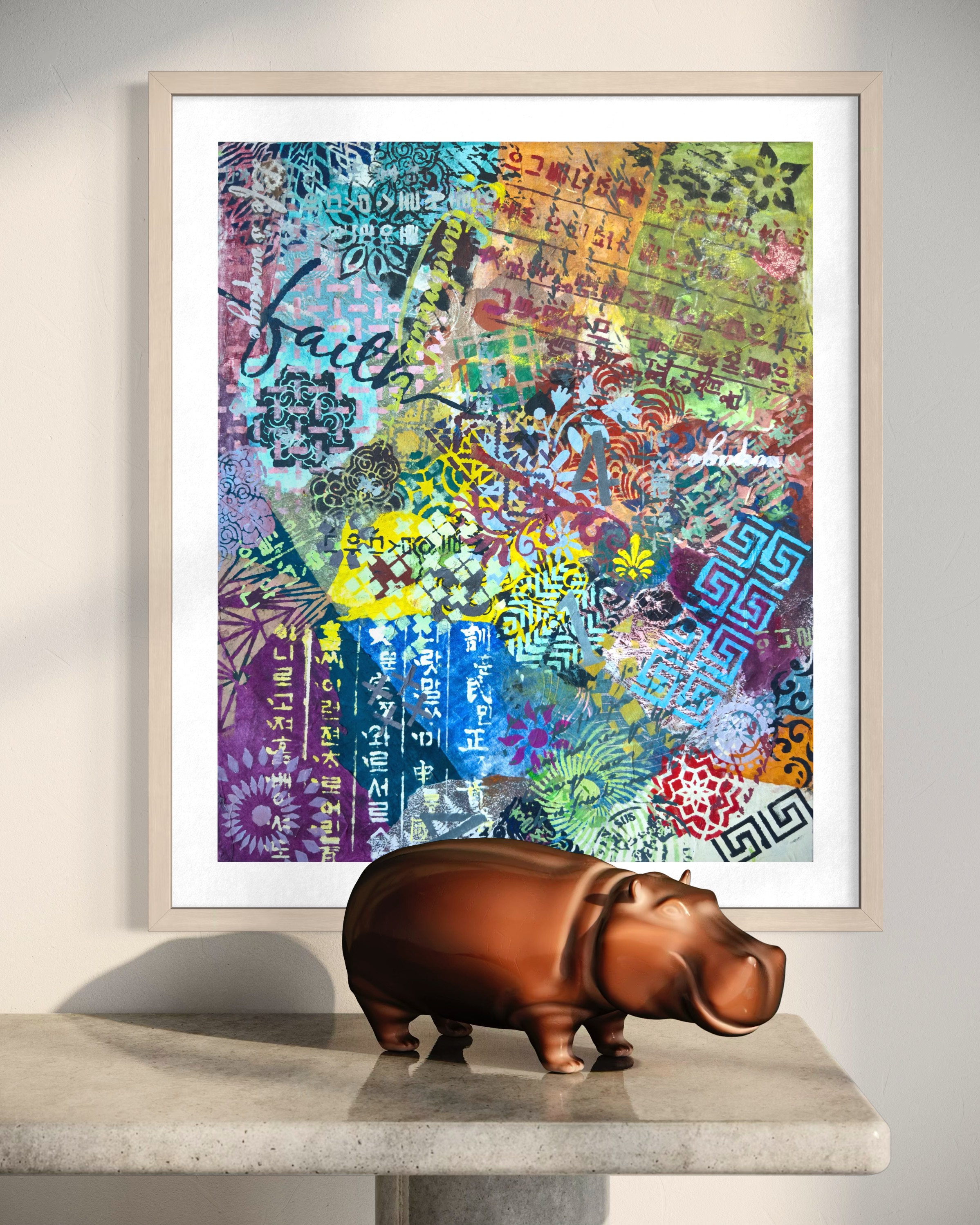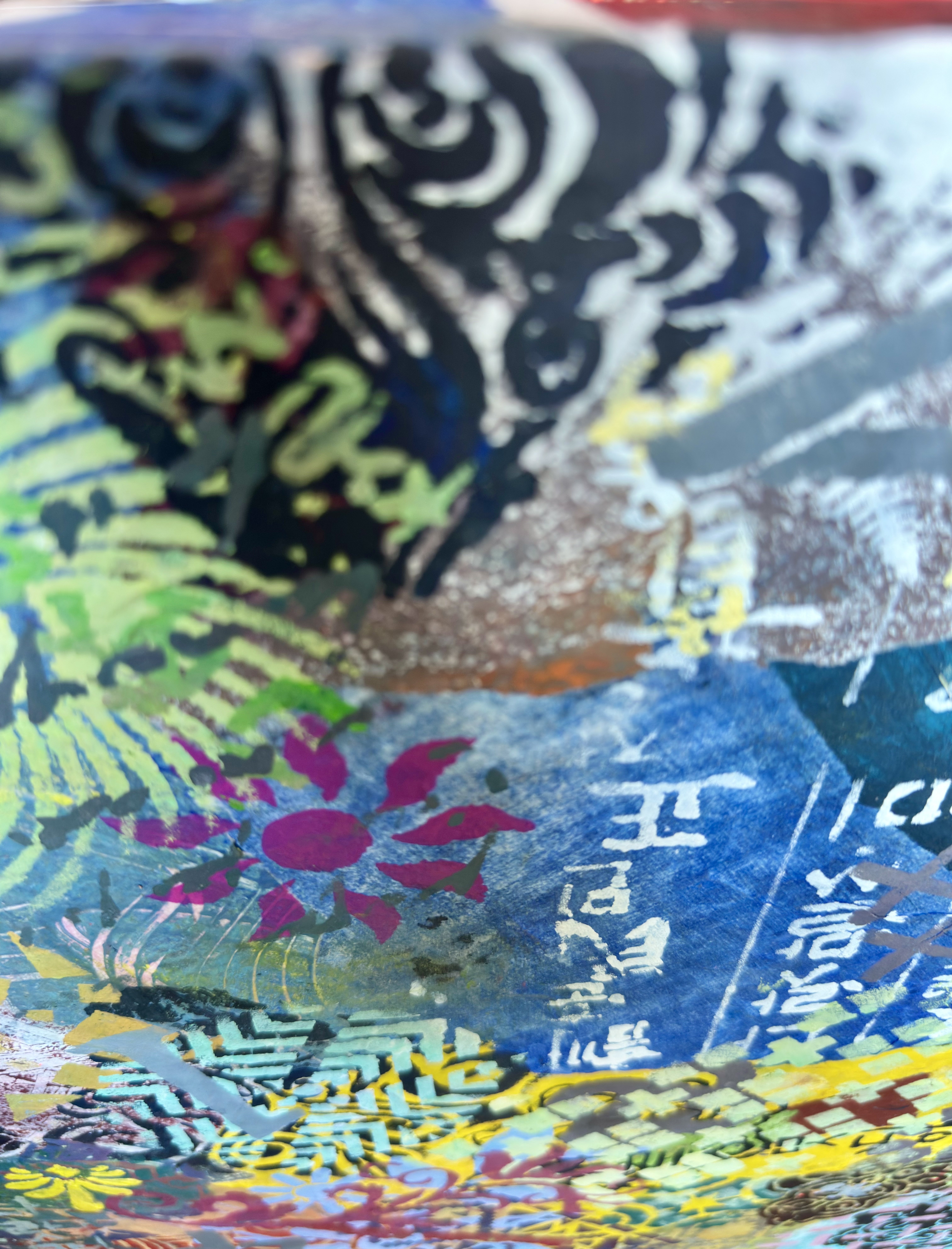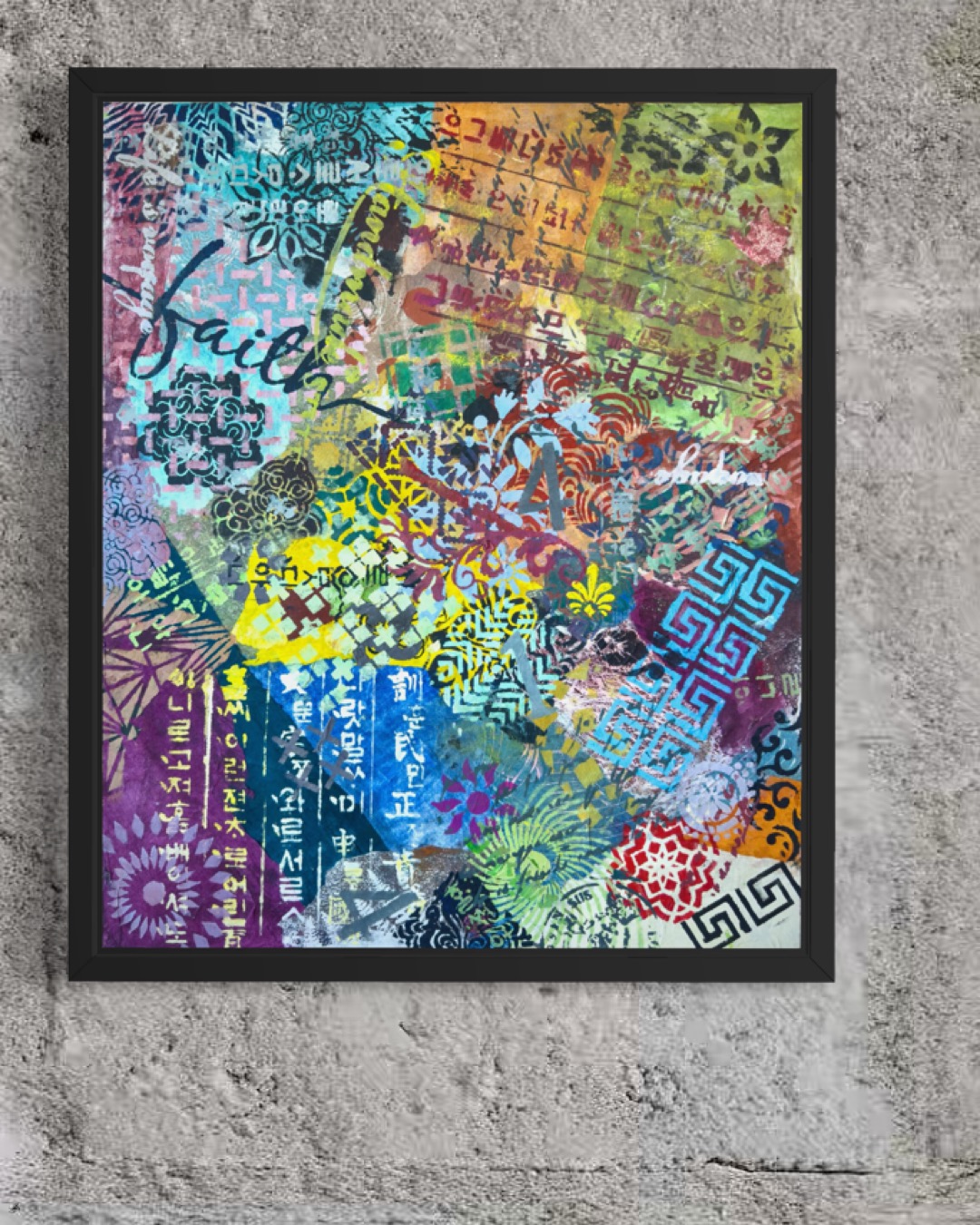 Forms arrive all at once—patterns collide, scripts cross, colors push forward without apology. This is not a composition; it is an overflow. What once held its edge begins to soften; what dissolves refuses to disappear.