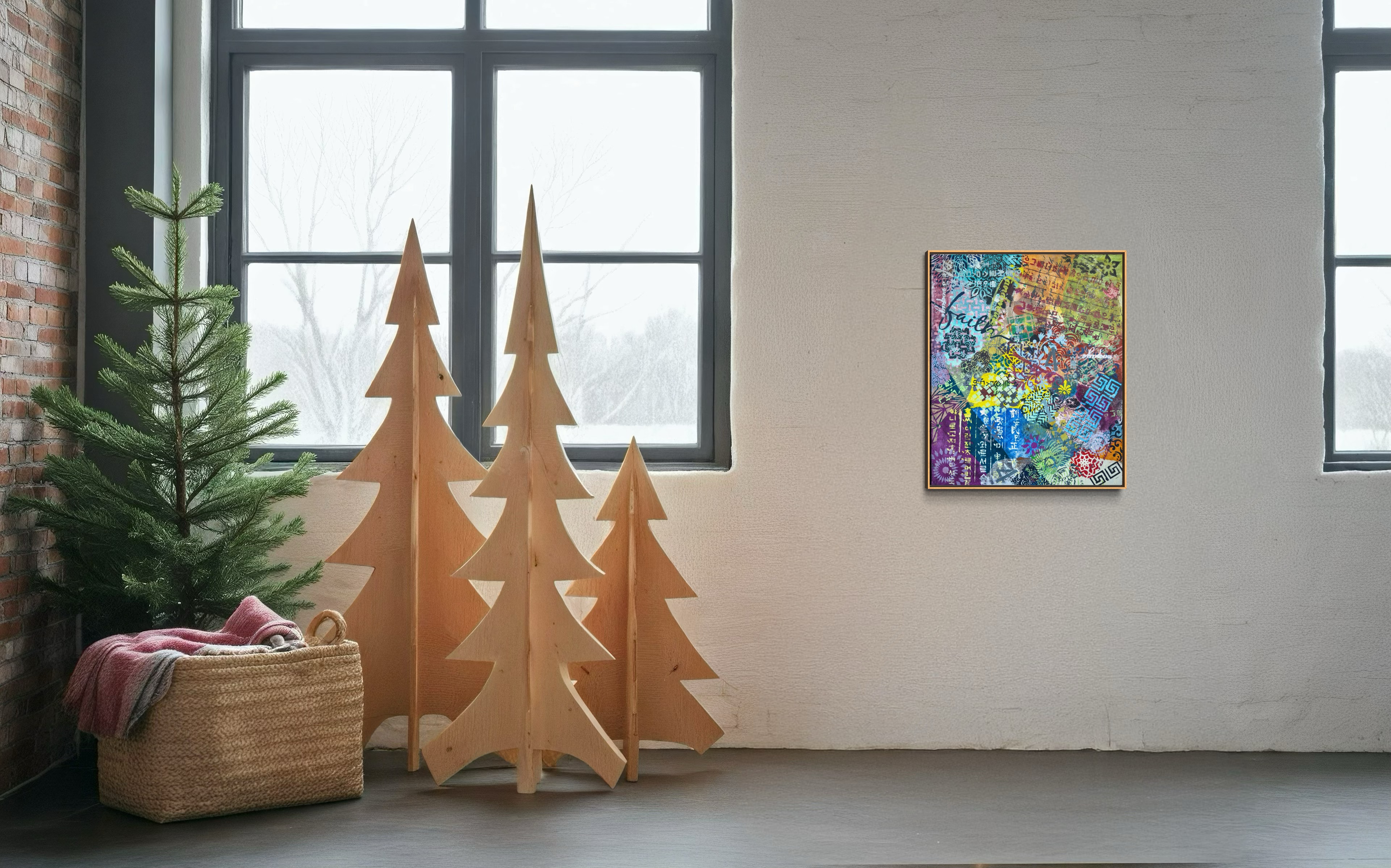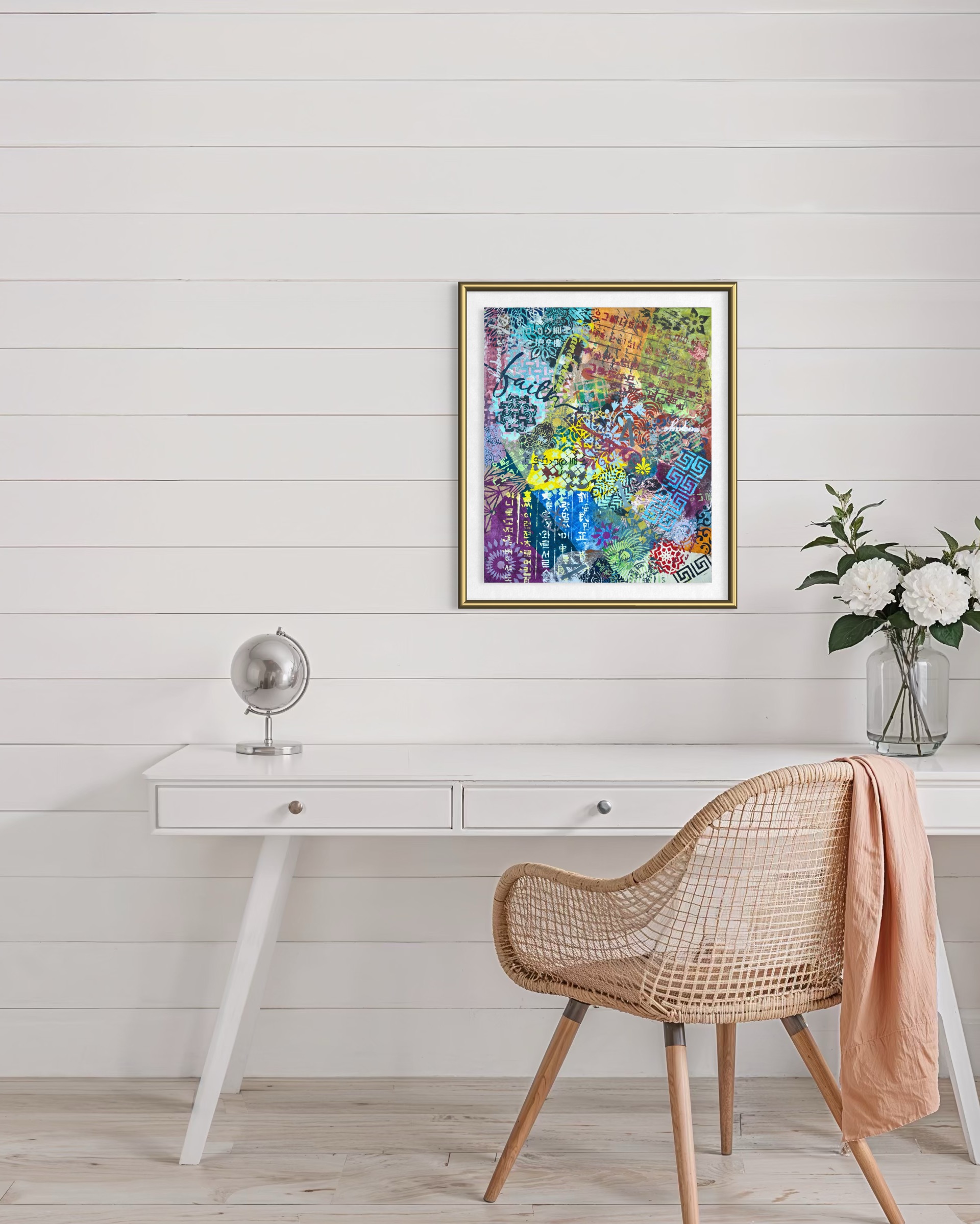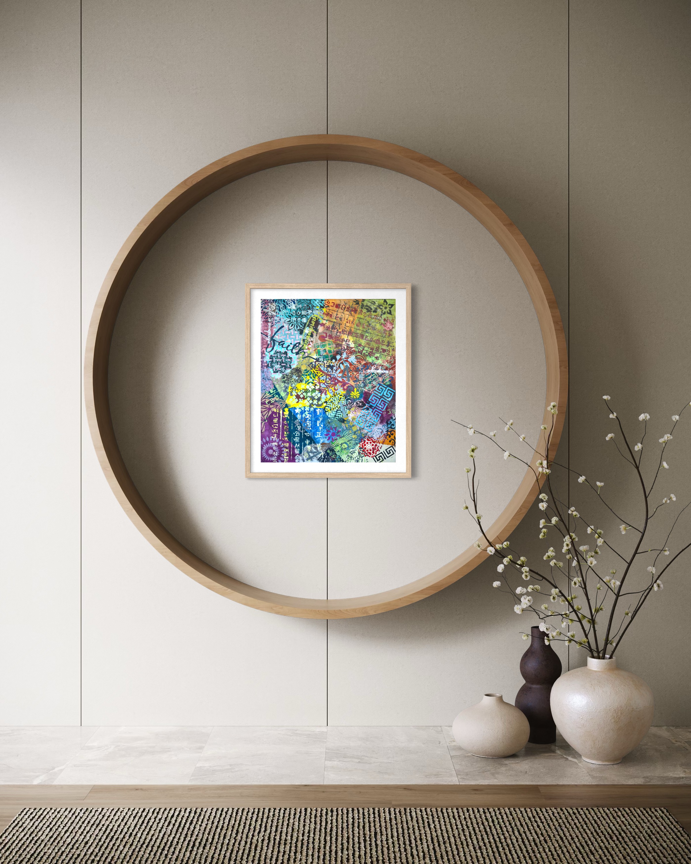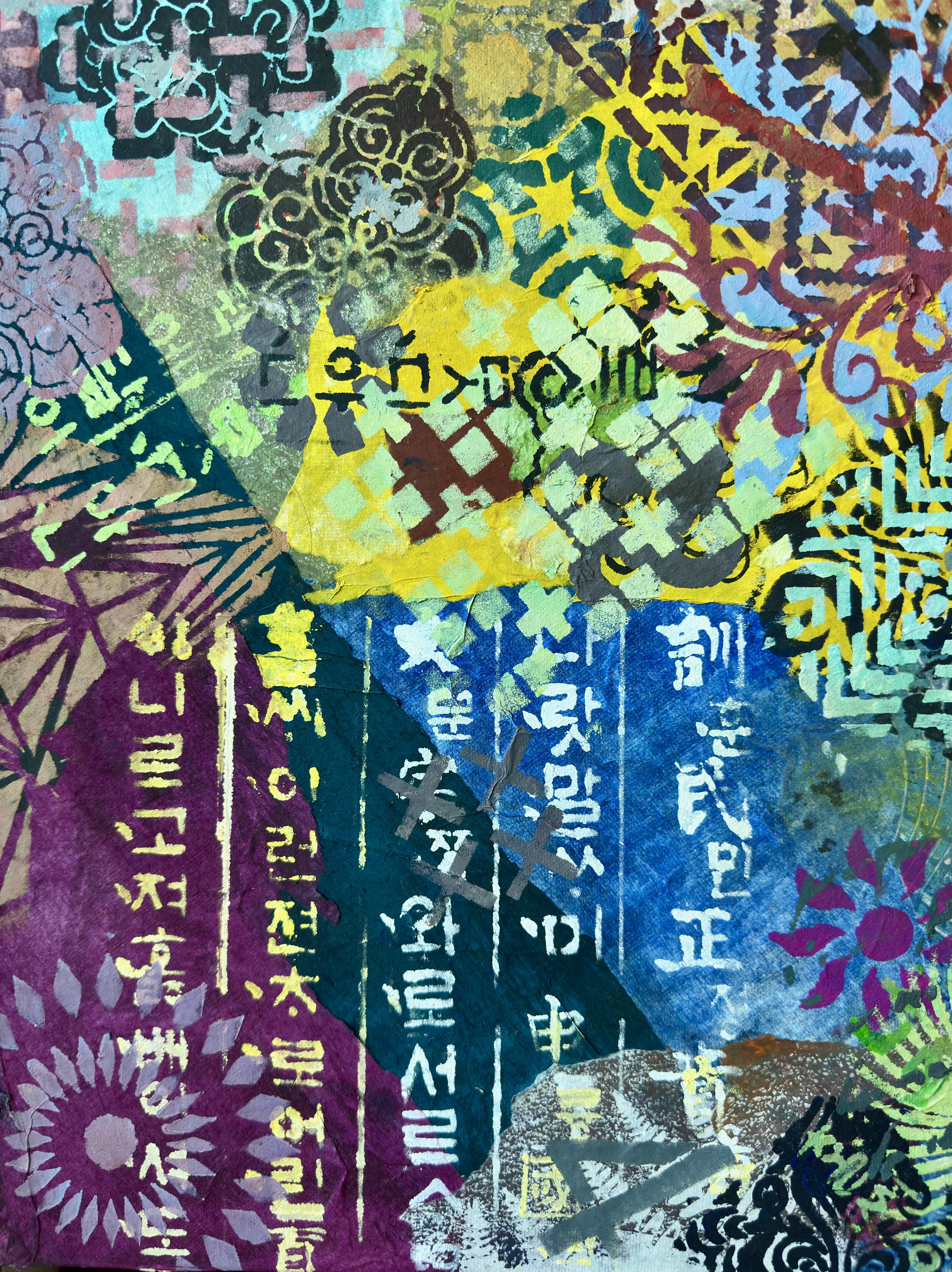 Mixed media on canvas (Dyed hanji and gel-printed hanji collage, acrylic stencil)