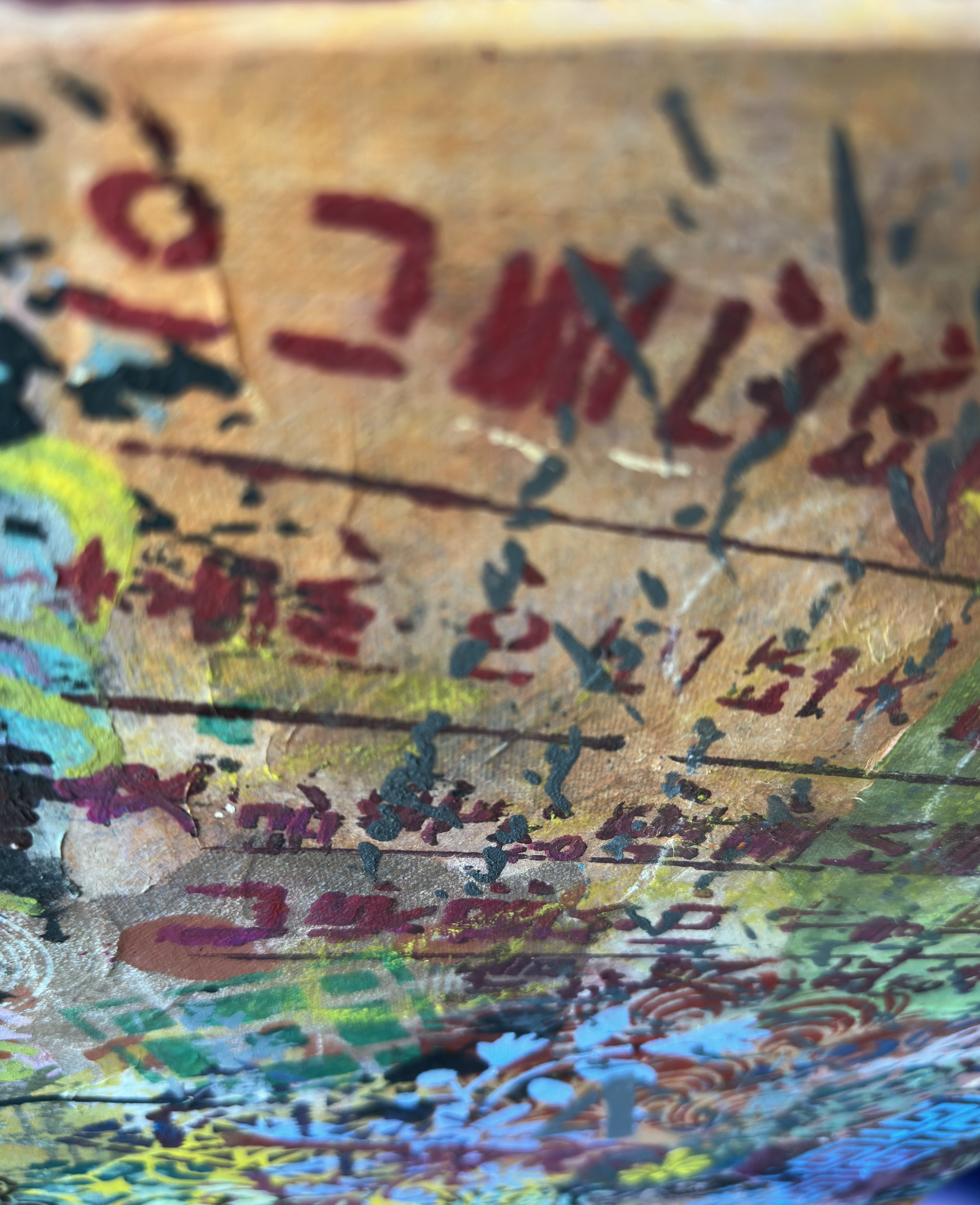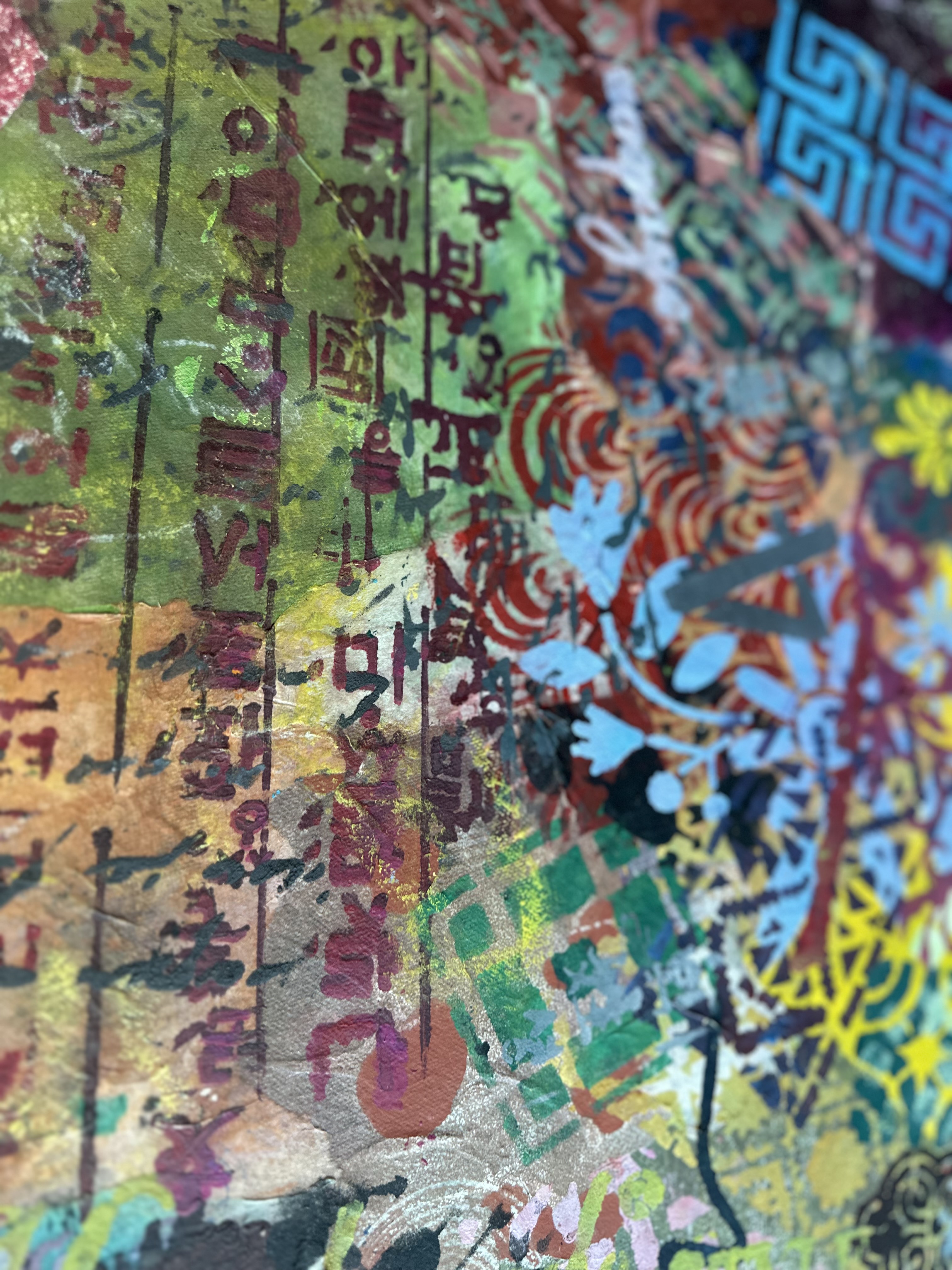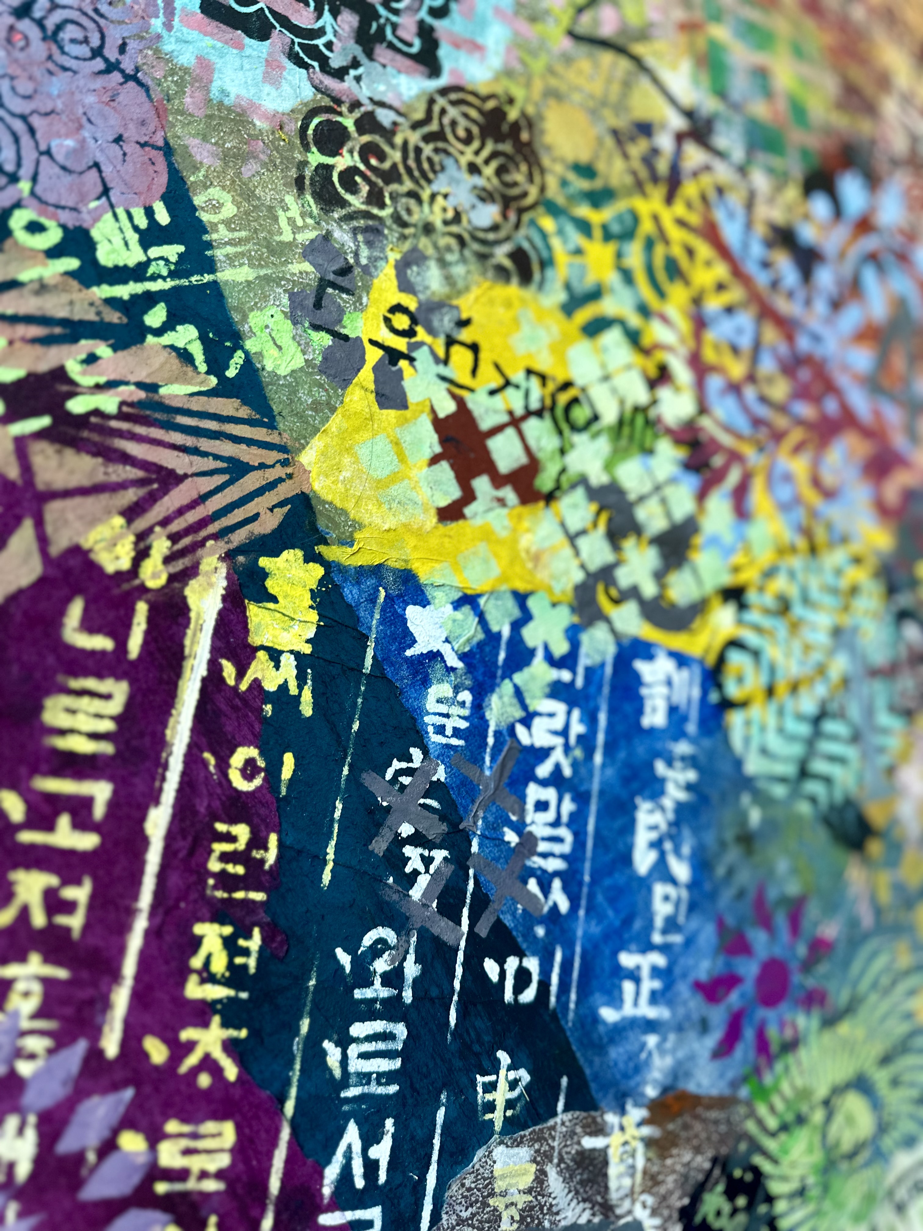 The work accommodates abundance without organizing it into a hierarchy. Throughout the surface, traditional motifs appear without obligation. Dancheong cloud patterns drift without architectural hierarchy. Geometric keys cut through the field but organize nothing. Korean script maintains its vertical logic while simultaneously spreading laterally, refusing to choose between directions. These elements do not merge into a unified language. They persist side by side through difference.