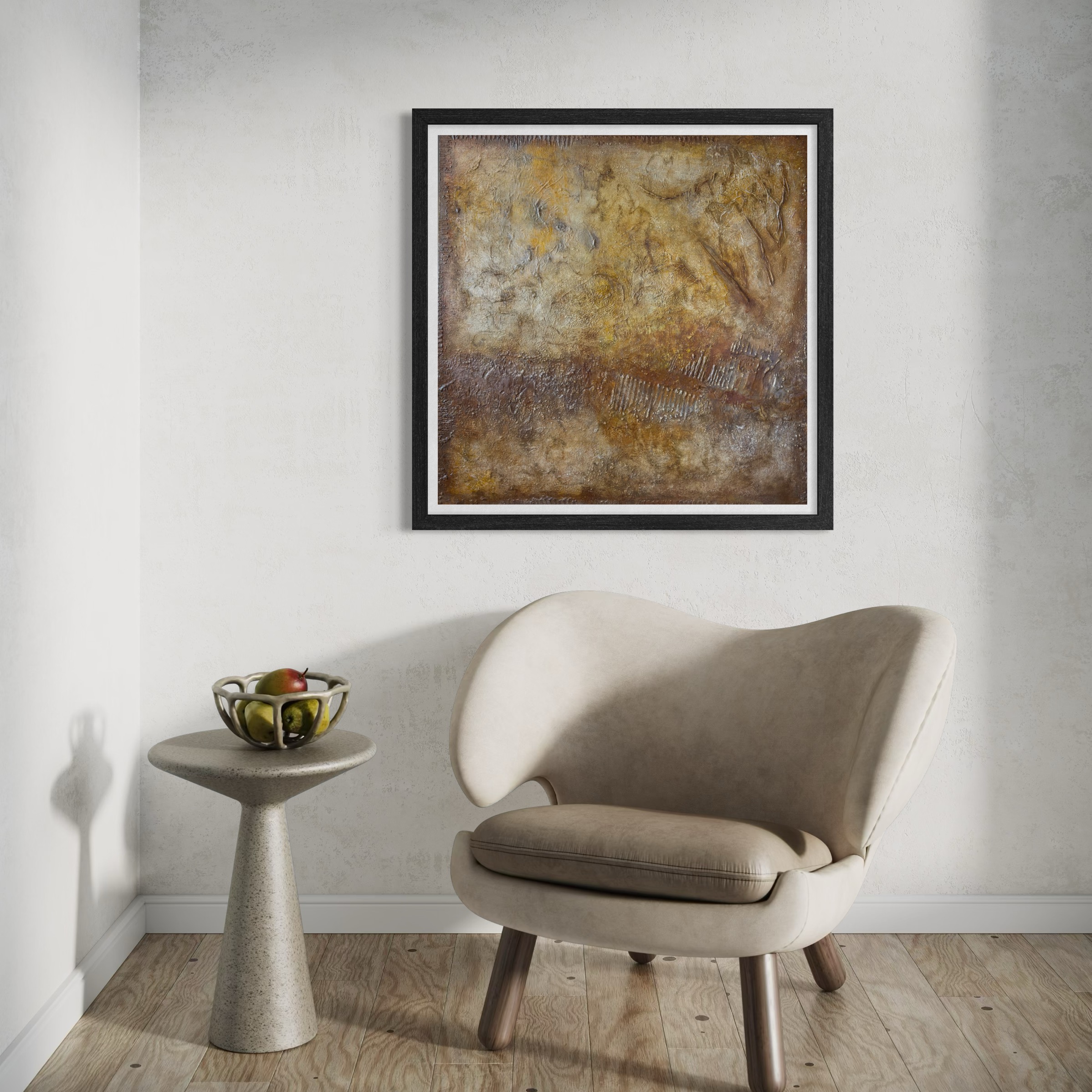 The square canvas (72.7 × 72.7 cm) is built from iron-oxide paint, aluminum foil, modeling paste, and paper foil, subjected to both forced oxidation via heat gun and passive exposure through air-drying. The final and decisive gesture is a heavy gloss varnish, sealing the surface at a moment the artist identifies as oxidation’s “aesthetic peak.” This act does not resolve the work’s tensions; it fixes them permanently in place.