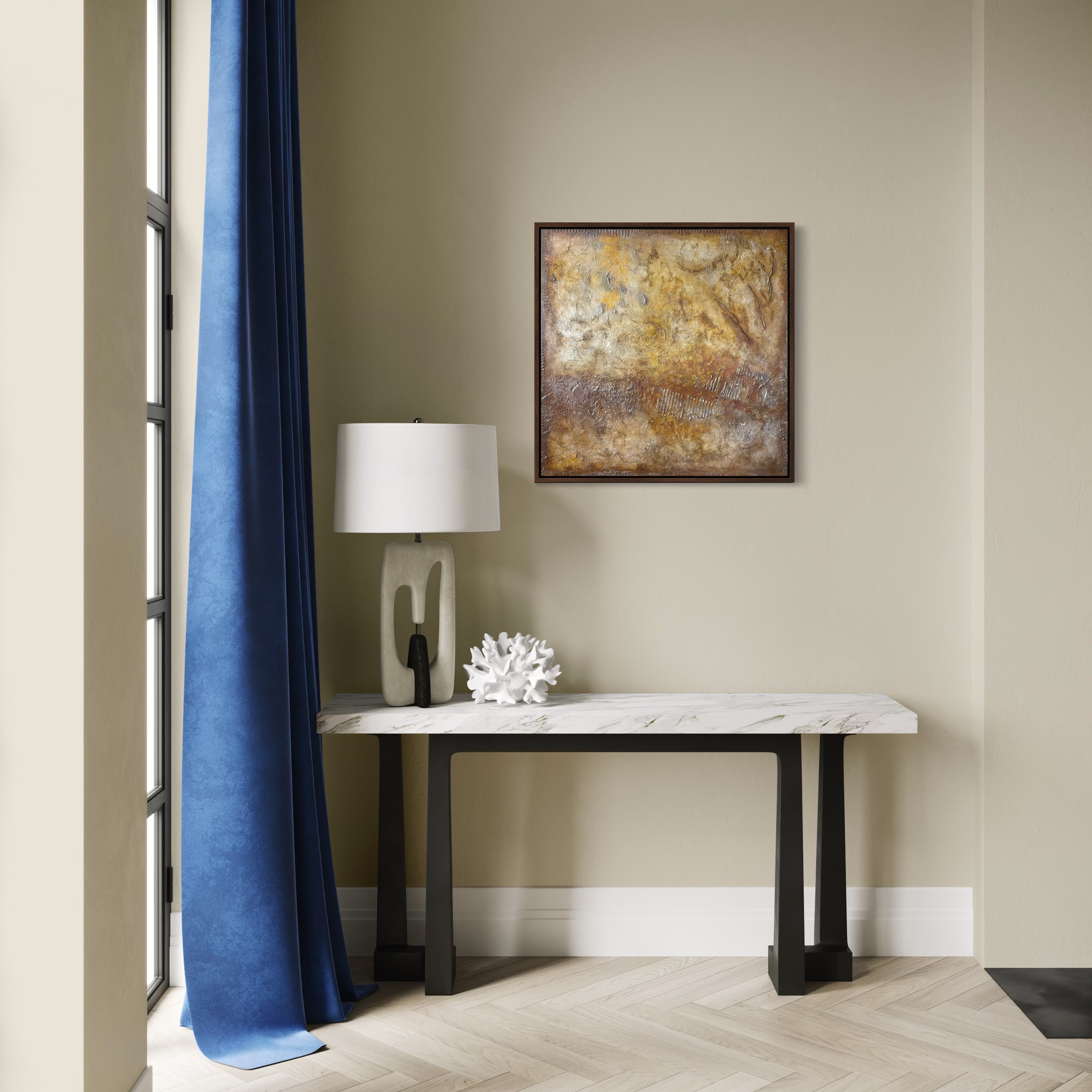Formally, the work is unmistakably seductive. The oxidized surface produces chromatic effects unattainable through pigment alone: translucent ambers, dense umbers, rust-orange accretions that oscillate between depth and surface. Embedded aluminum fragments refract light, generating intermittent luminosity within an otherwise earthen palette. Texture accumulates rather than performs; impasto and pooling coexist without hierarchy.