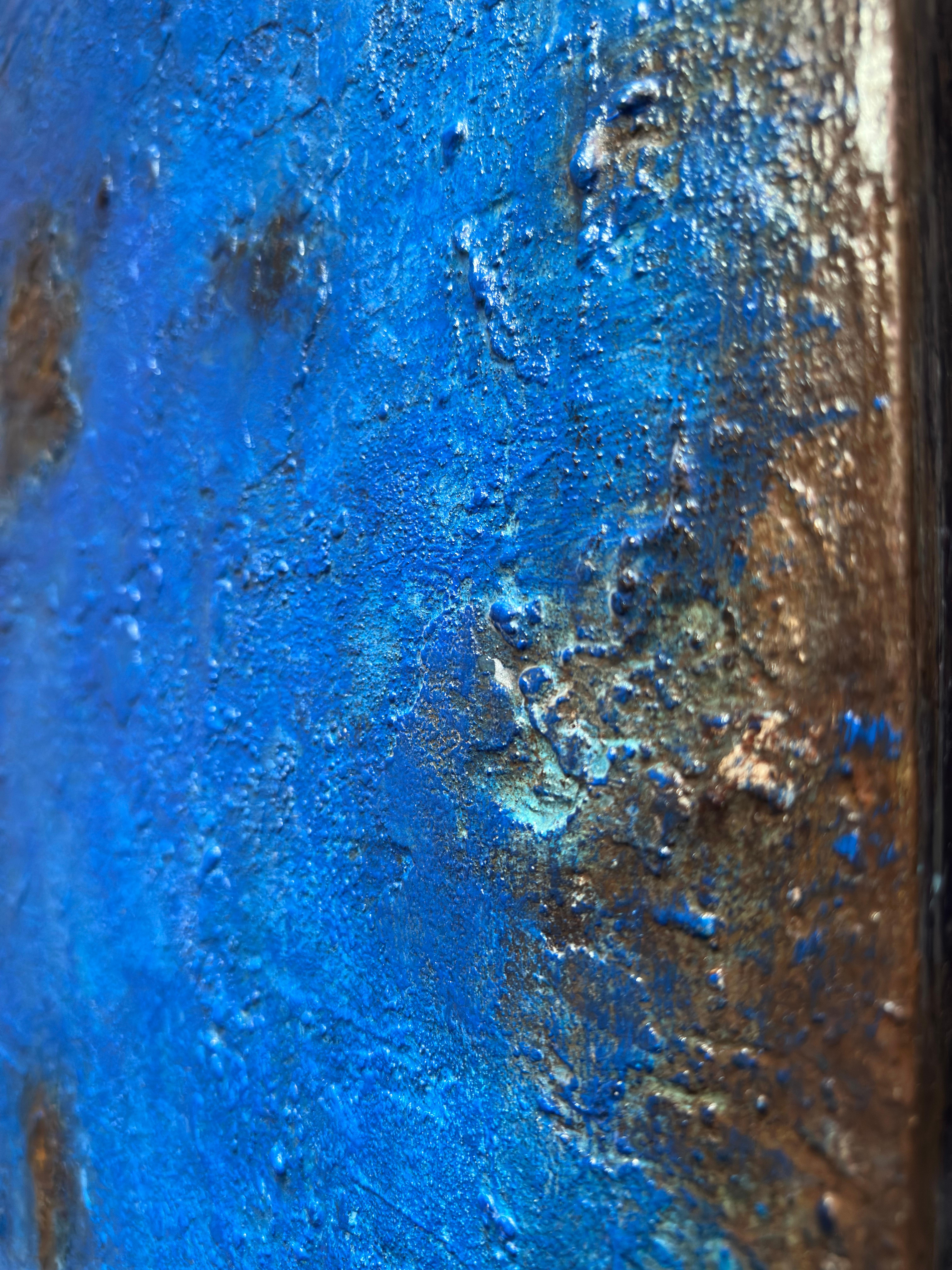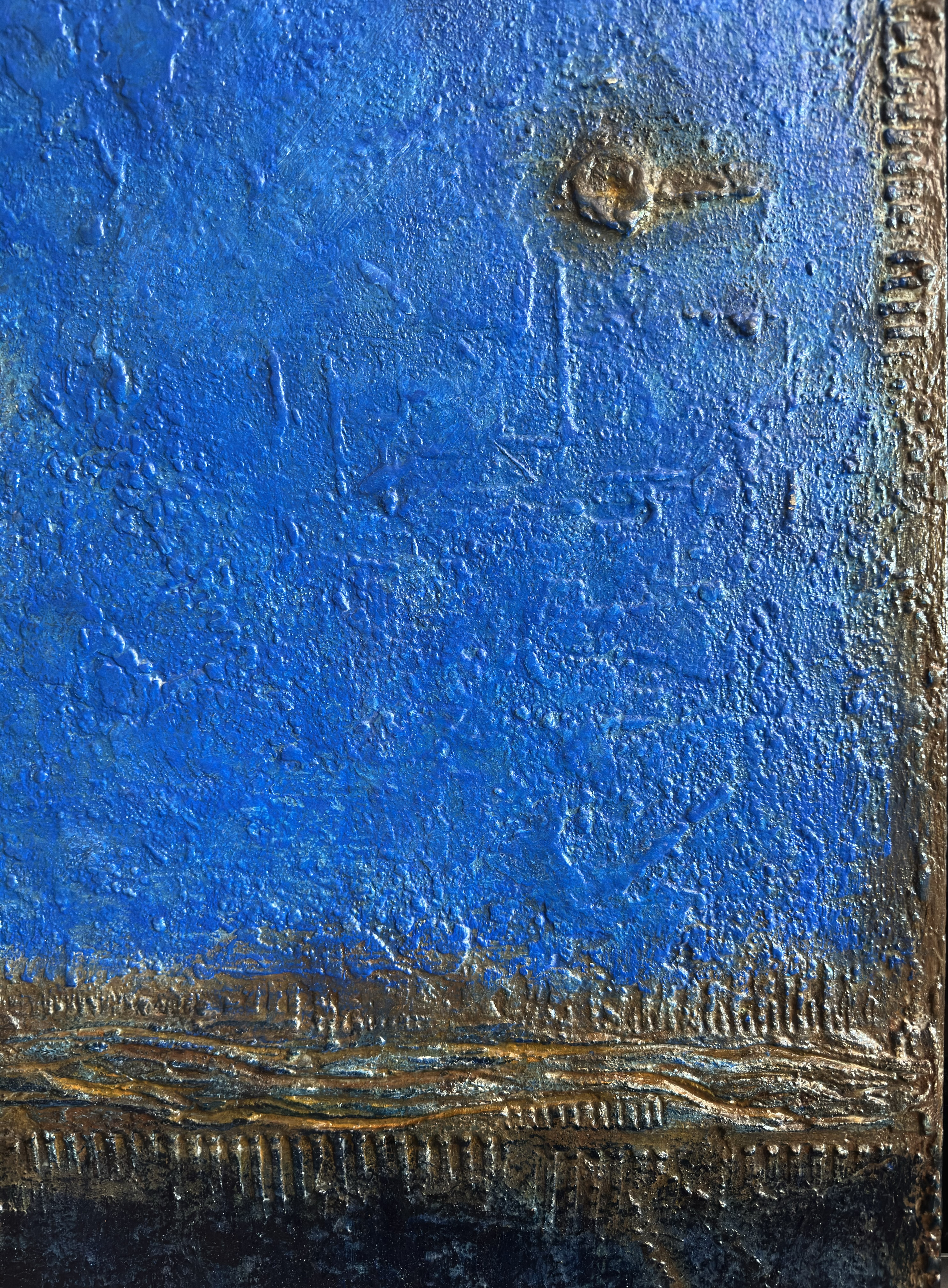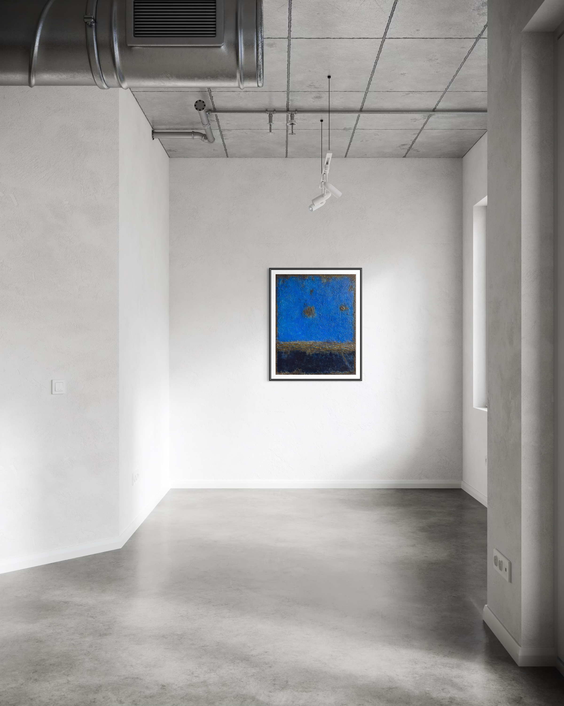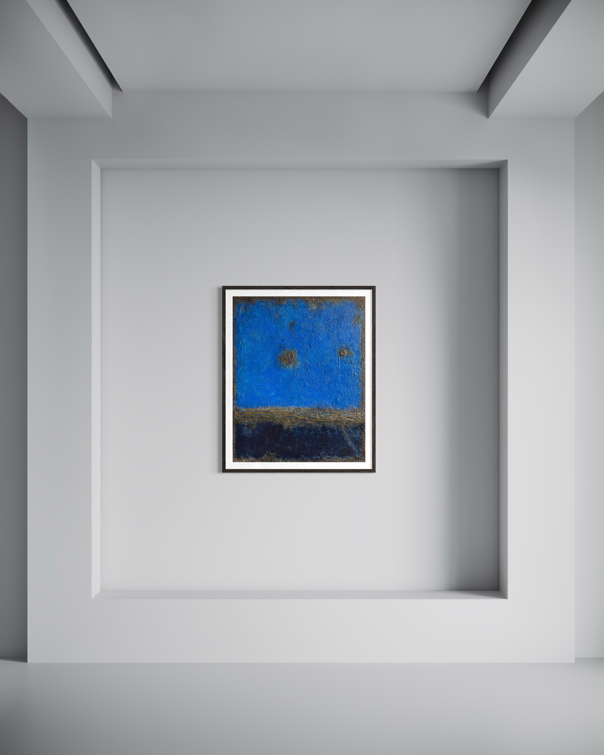 II. Blue as Weight The vast fields of this work are what I term "Residual Atmosphere." This blue does not invite the viewer into depth; it demands a confrontation with its opacity. It is the heavy sediment left after a world has burned through its resources. Within this field, the chemical scars of the pigments are held in a state of non-resistance. The blue does not heal these ruptures; it simply holds them as evidence of a transformation that has reached its boundary.