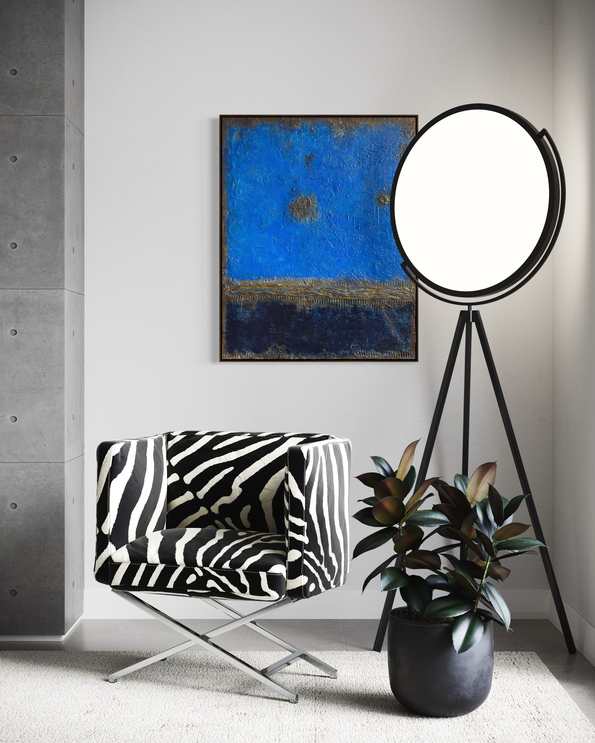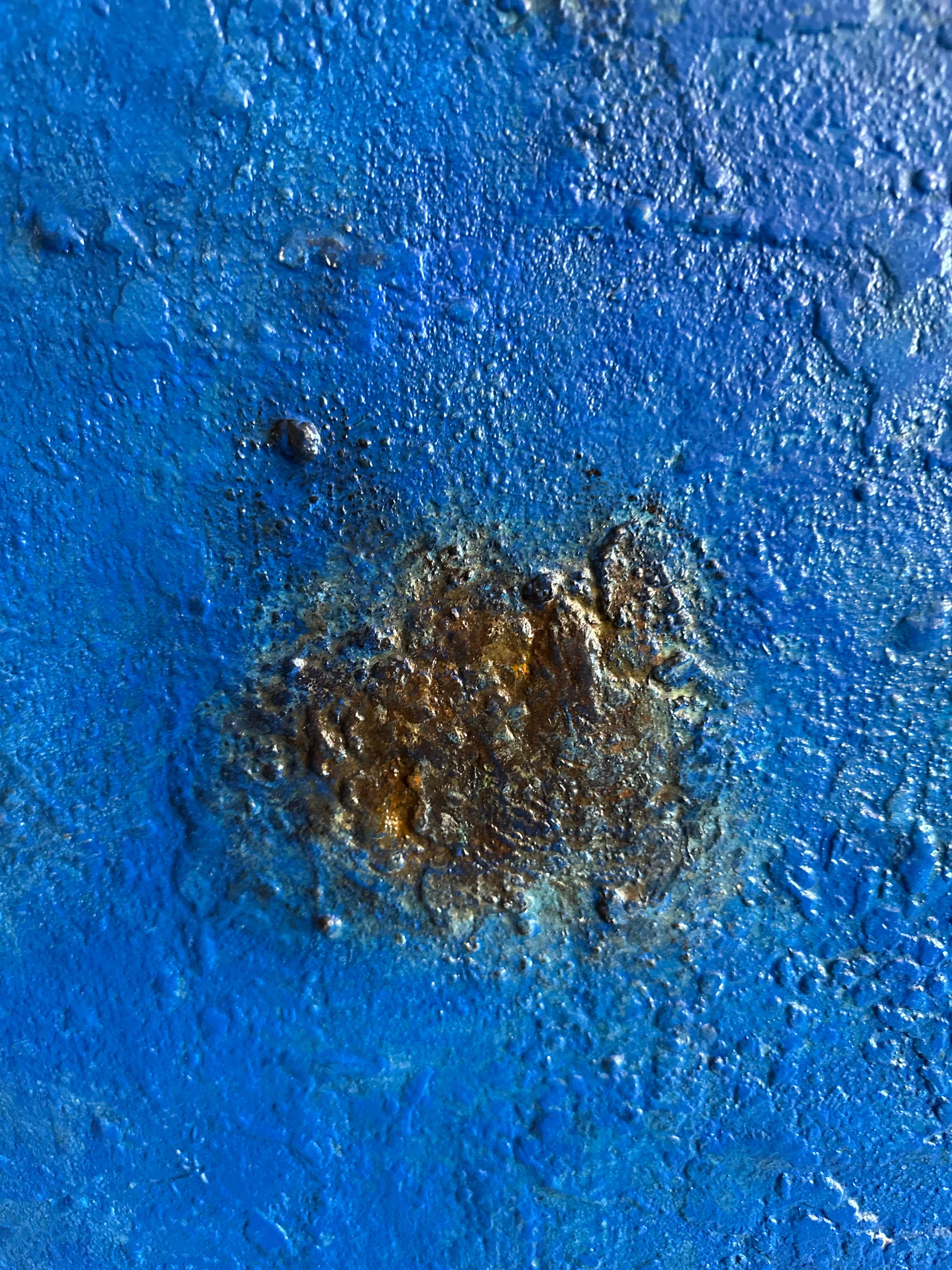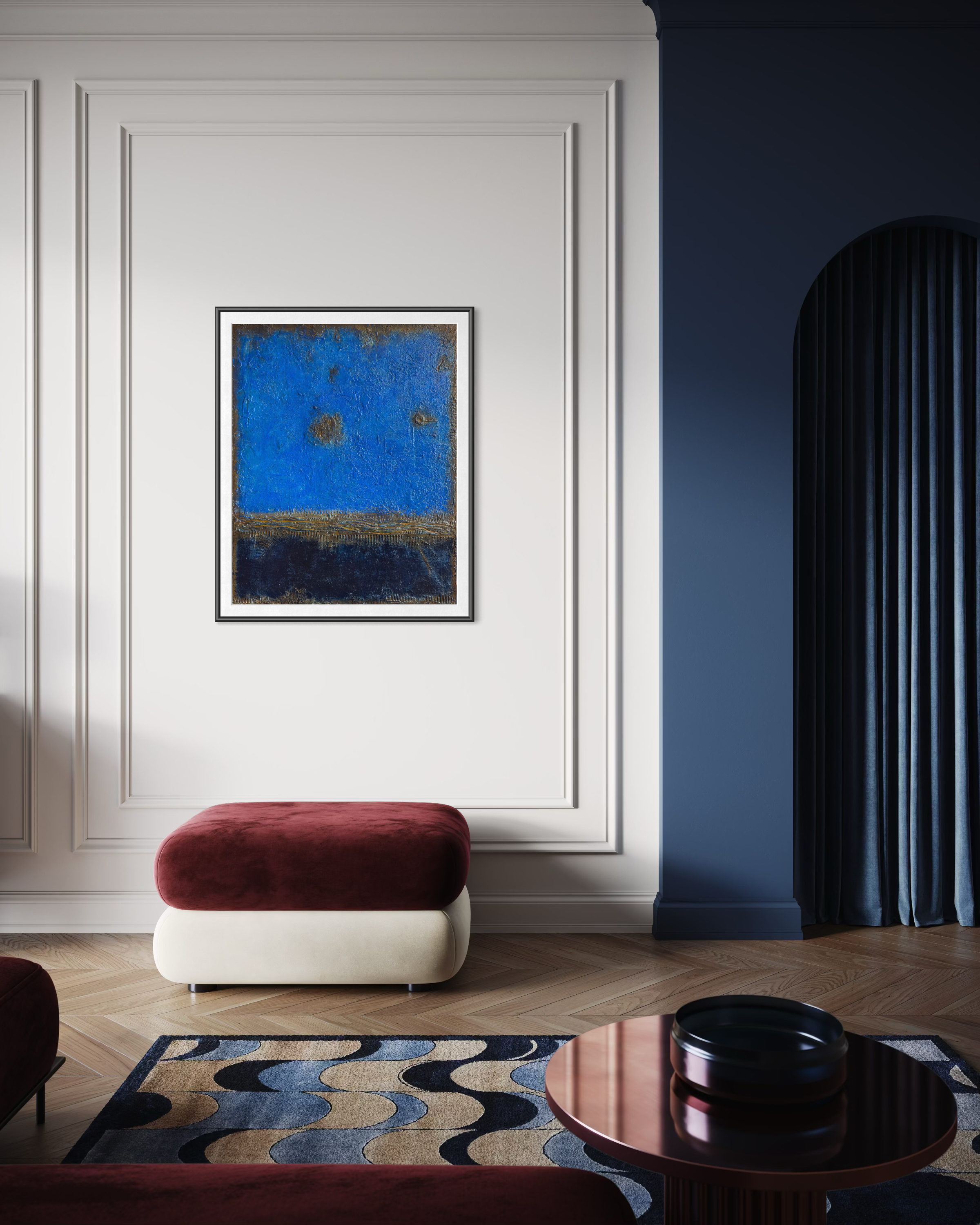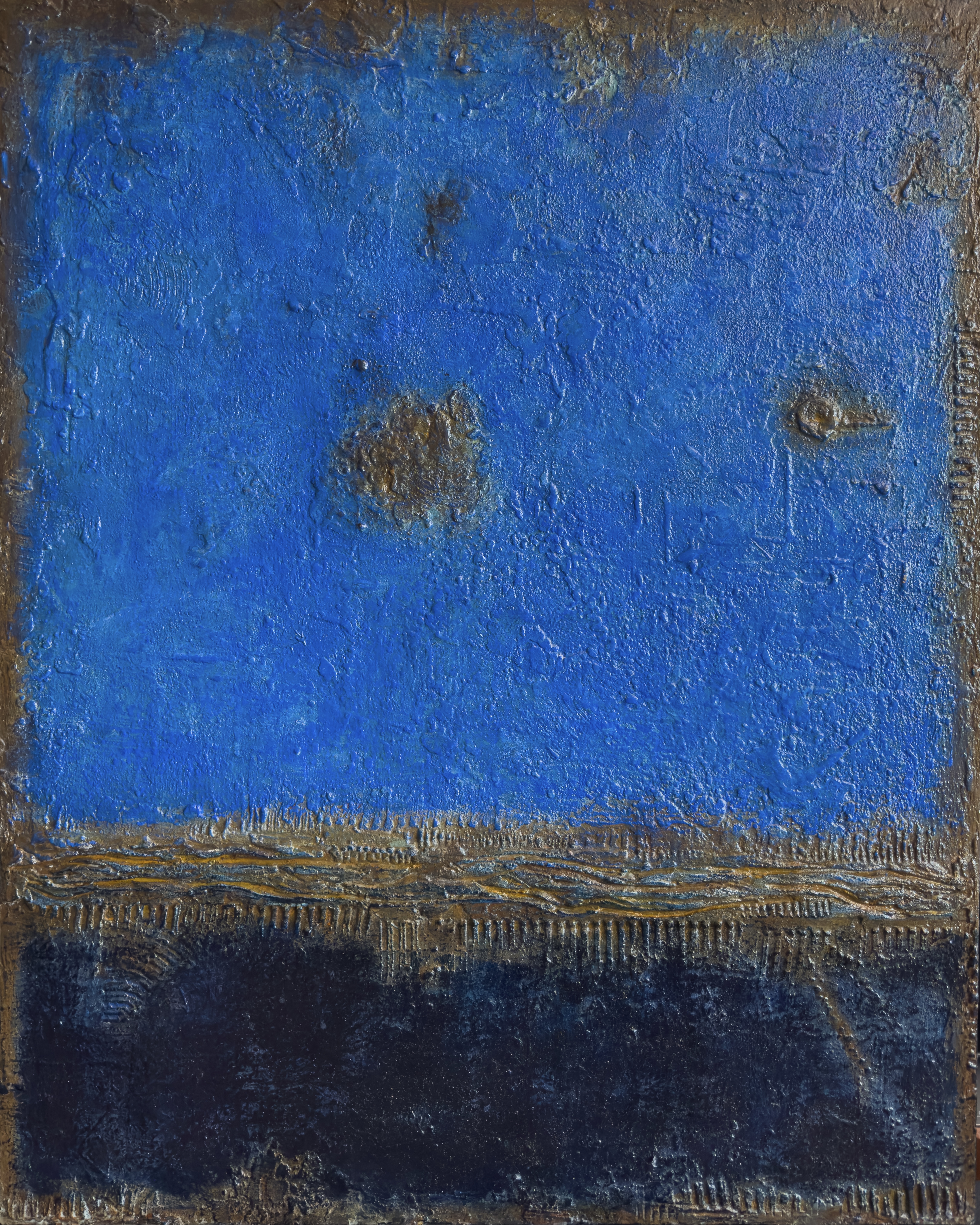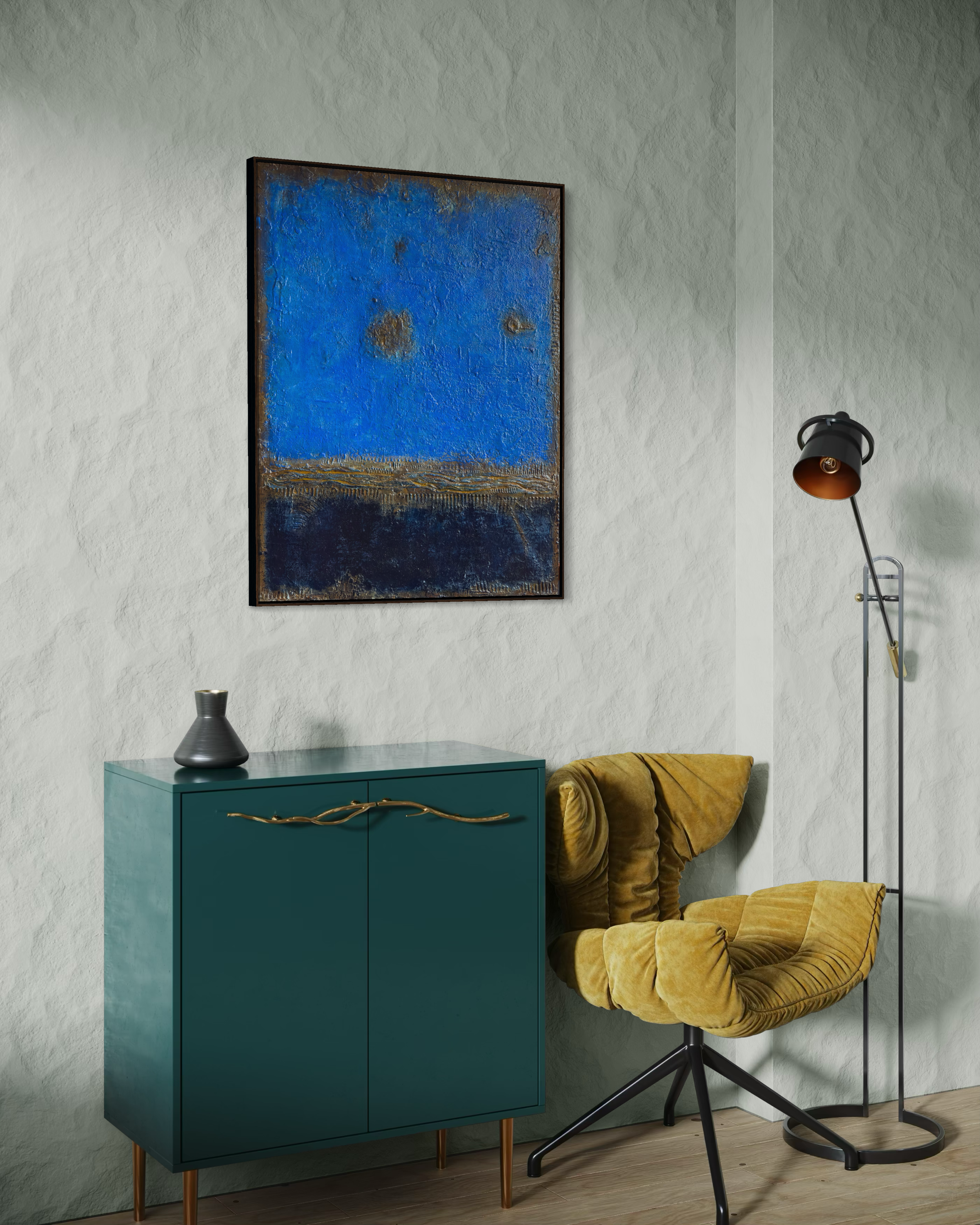 II. Blue as Weight The vast fields of this work are what I term "Residual Atmosphere." This blue does not invite the viewer into depth; it demands a confrontation with its opacity. It is the heavy sediment left after a world has burned through its resources. Within this field, the chemical scars of the pigments are held in a state of non-resistance. The blue does not heal these ruptures; it simply holds them as evidence of a transformation that has reached its boundary.