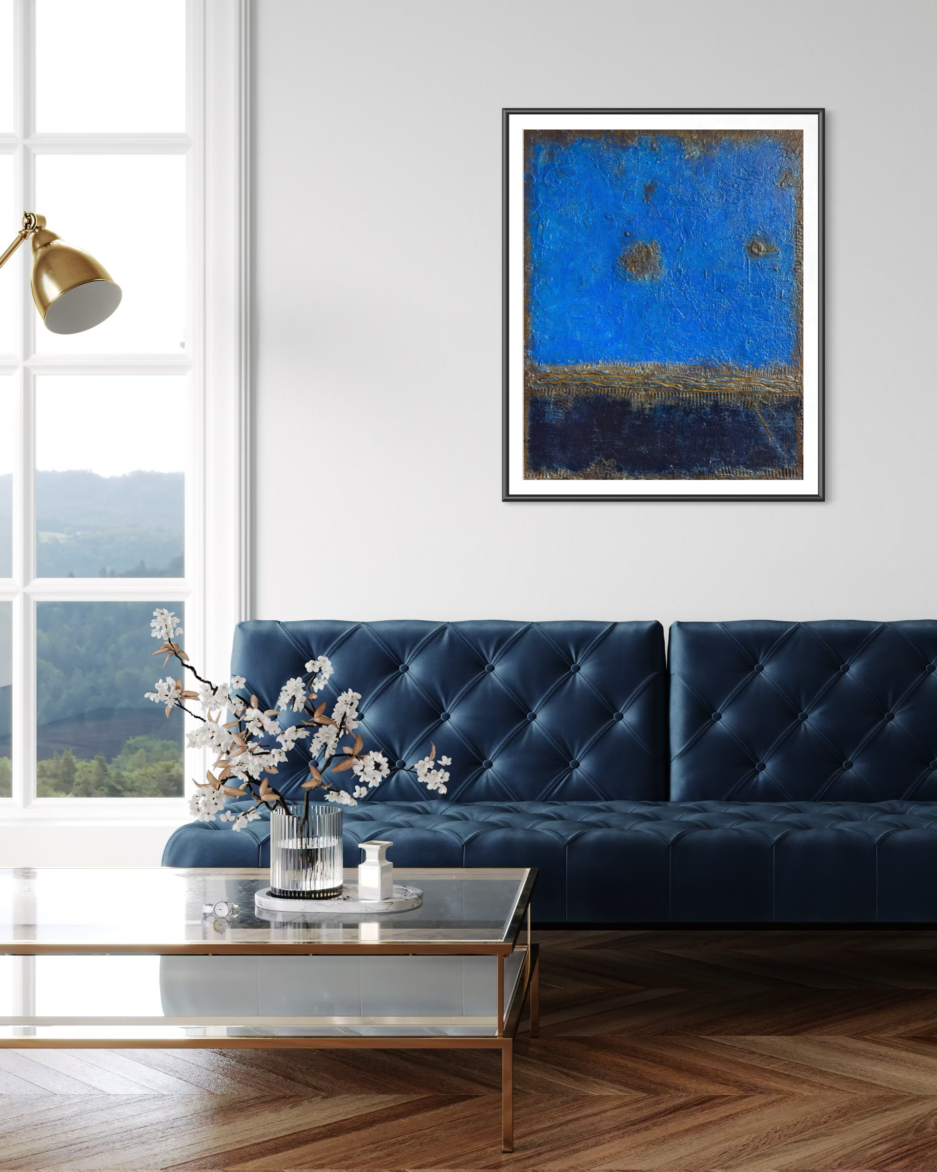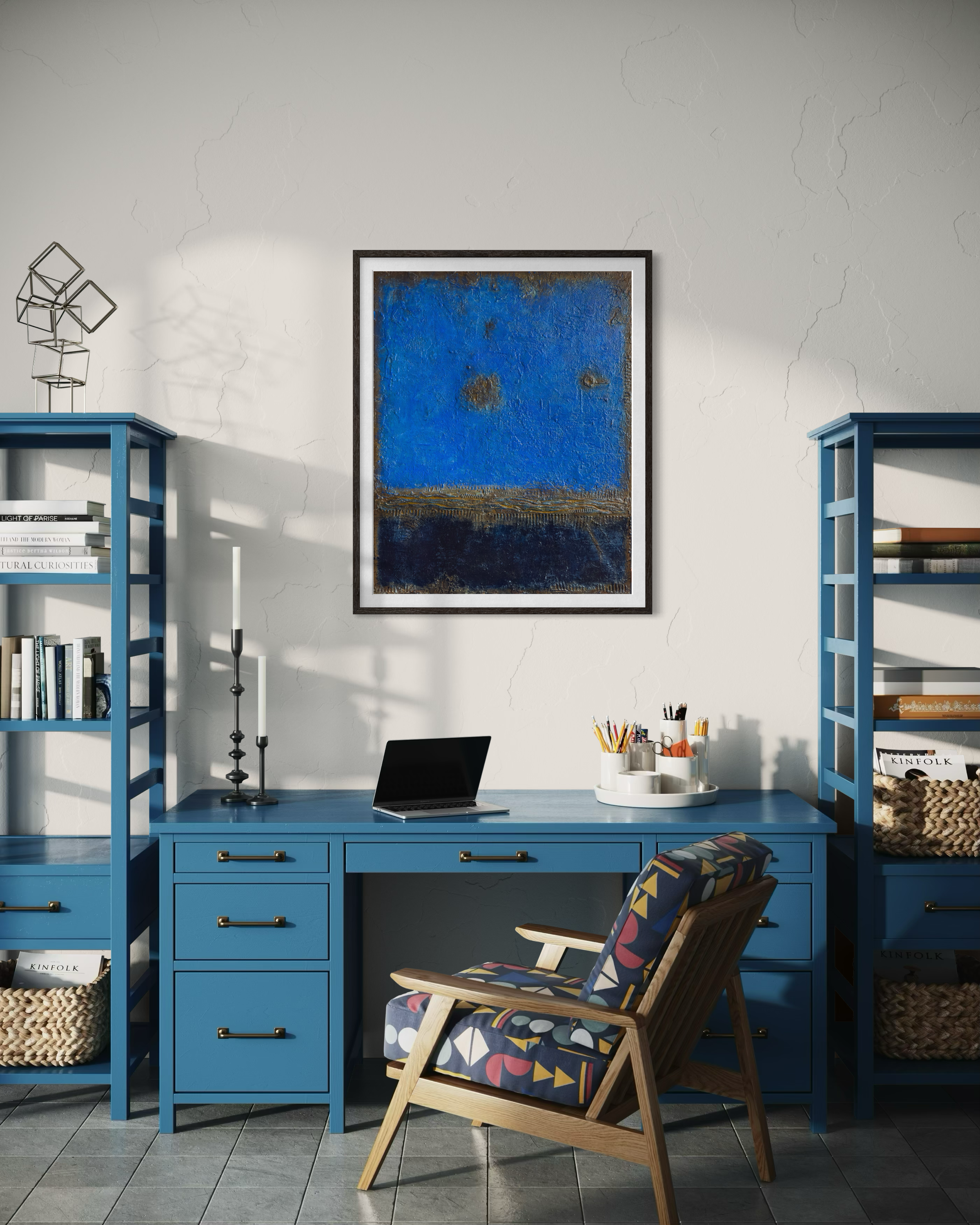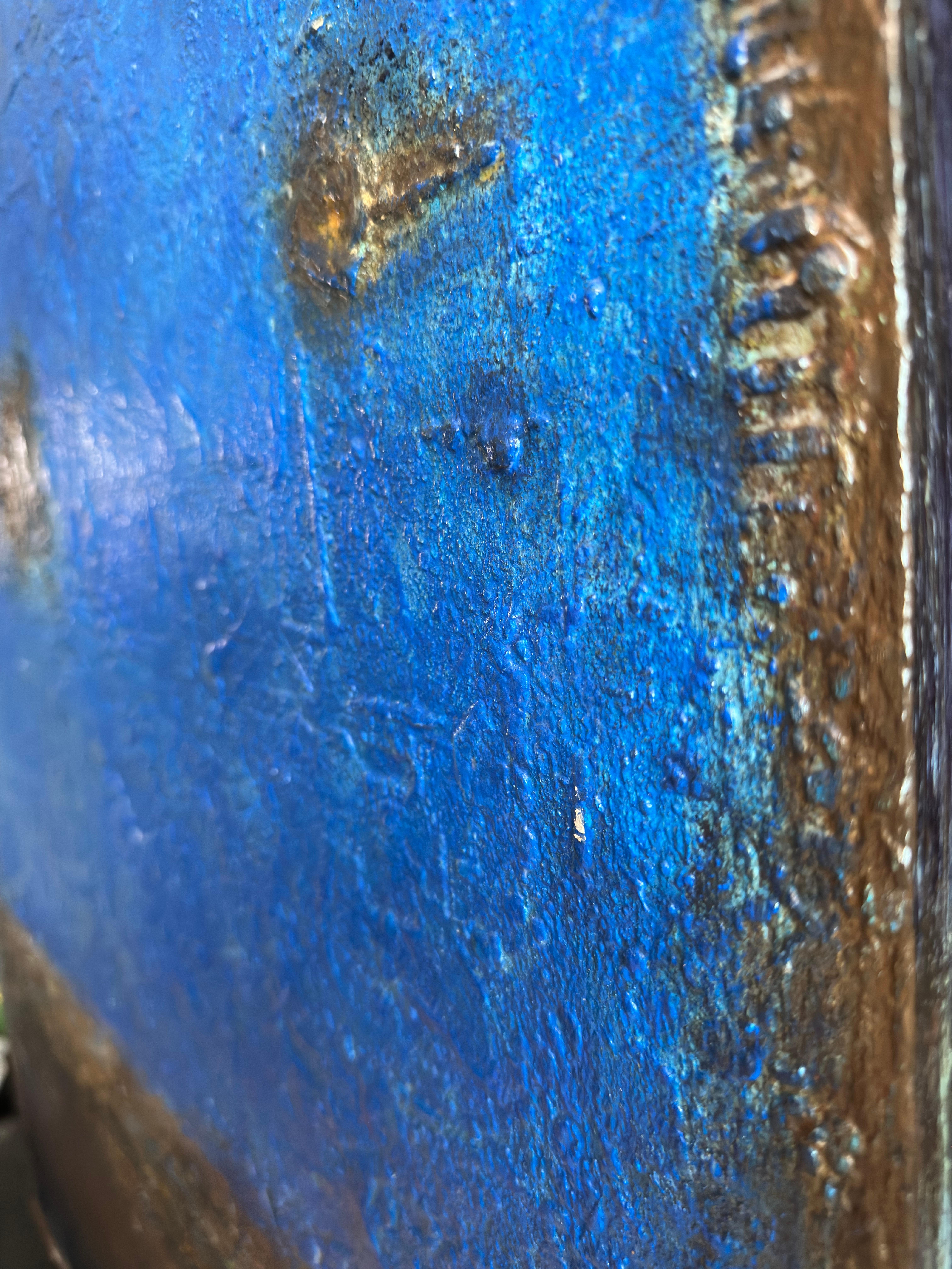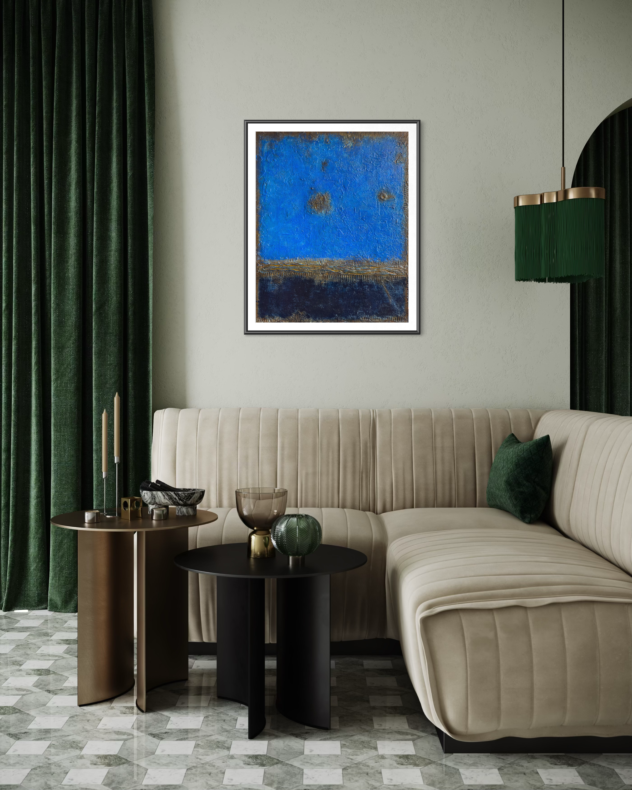 II. Blue as Weight The vast fields of this work are what I term "Residual Atmosphere." This blue does not invite the viewer into depth; it demands a confrontation with its opacity. It is the heavy sediment left after a world has burned through its resources. Within this field, the chemical scars of the pigments are held in a state of non-resistance. The blue does not heal these ruptures; it simply holds them as evidence of a transformation that has reached its boundary.