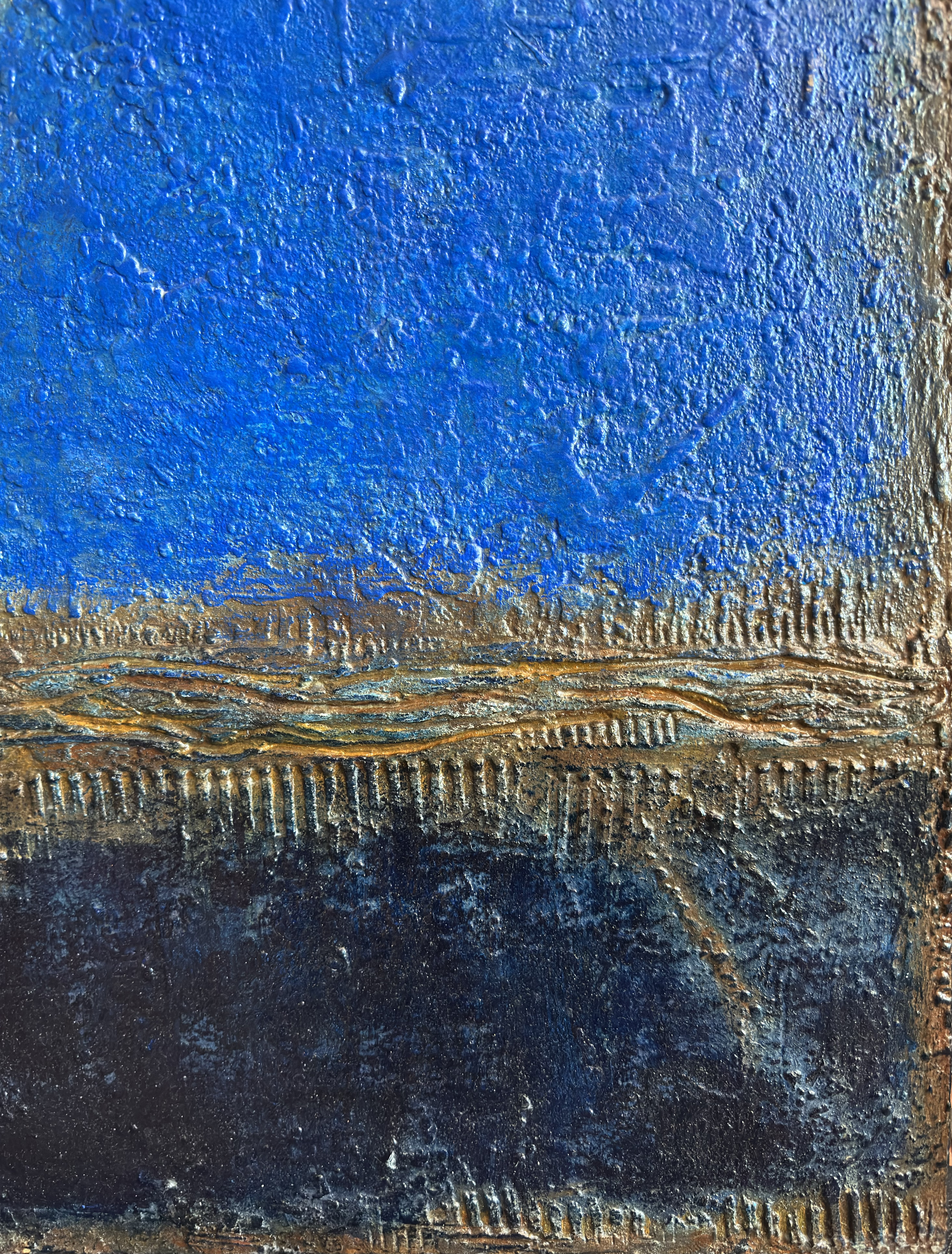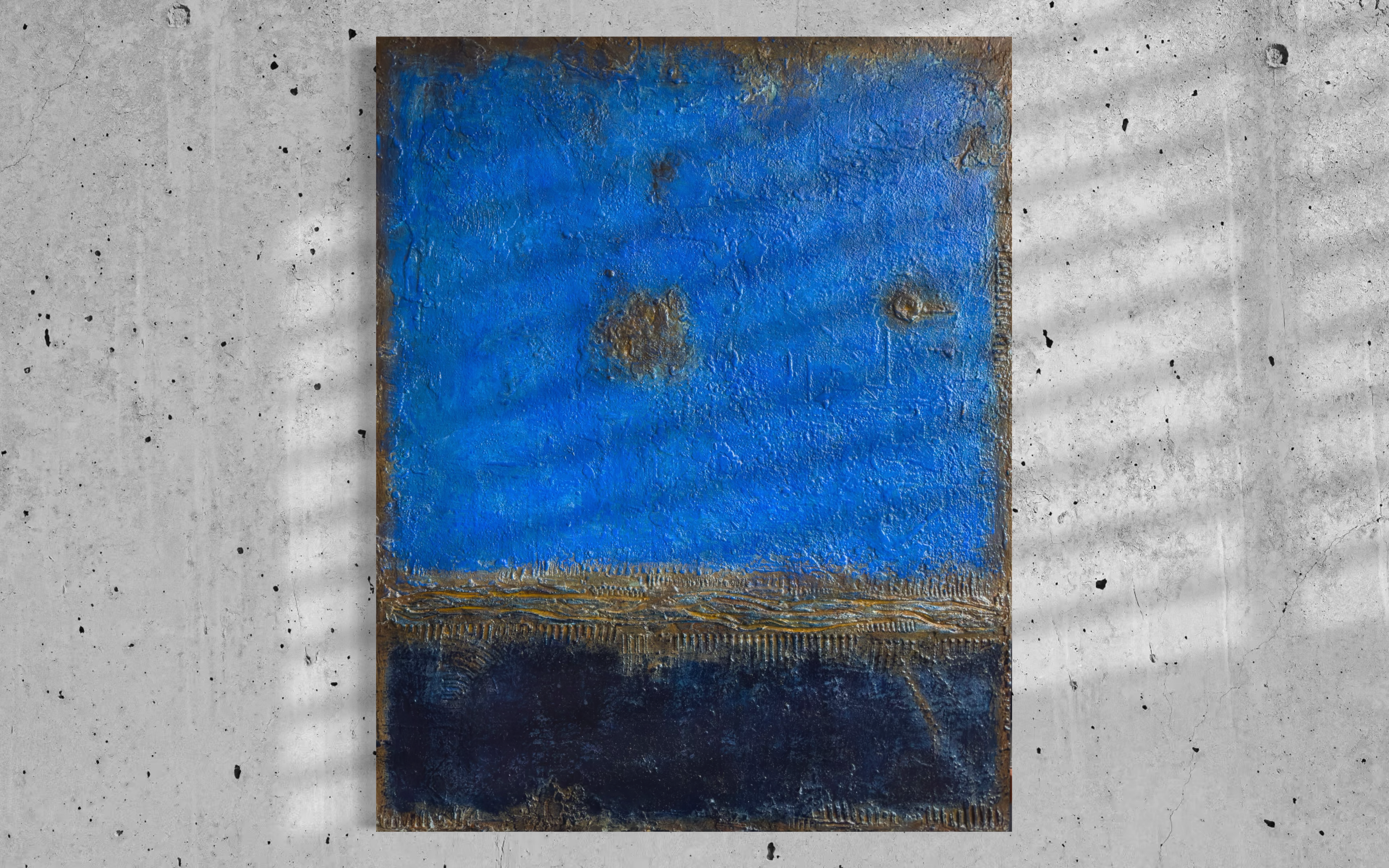 In Tranquility (2025), the material does not perform; it endures. The painting marks the point where intervention withdraws, allowing the surface to settle into its own density. The blue field functions as a compressed residue—an opaque mass that remains after volatility has subsided. Within this field, marks and scars coexist as fixed traces of a physical history that has met its limit.