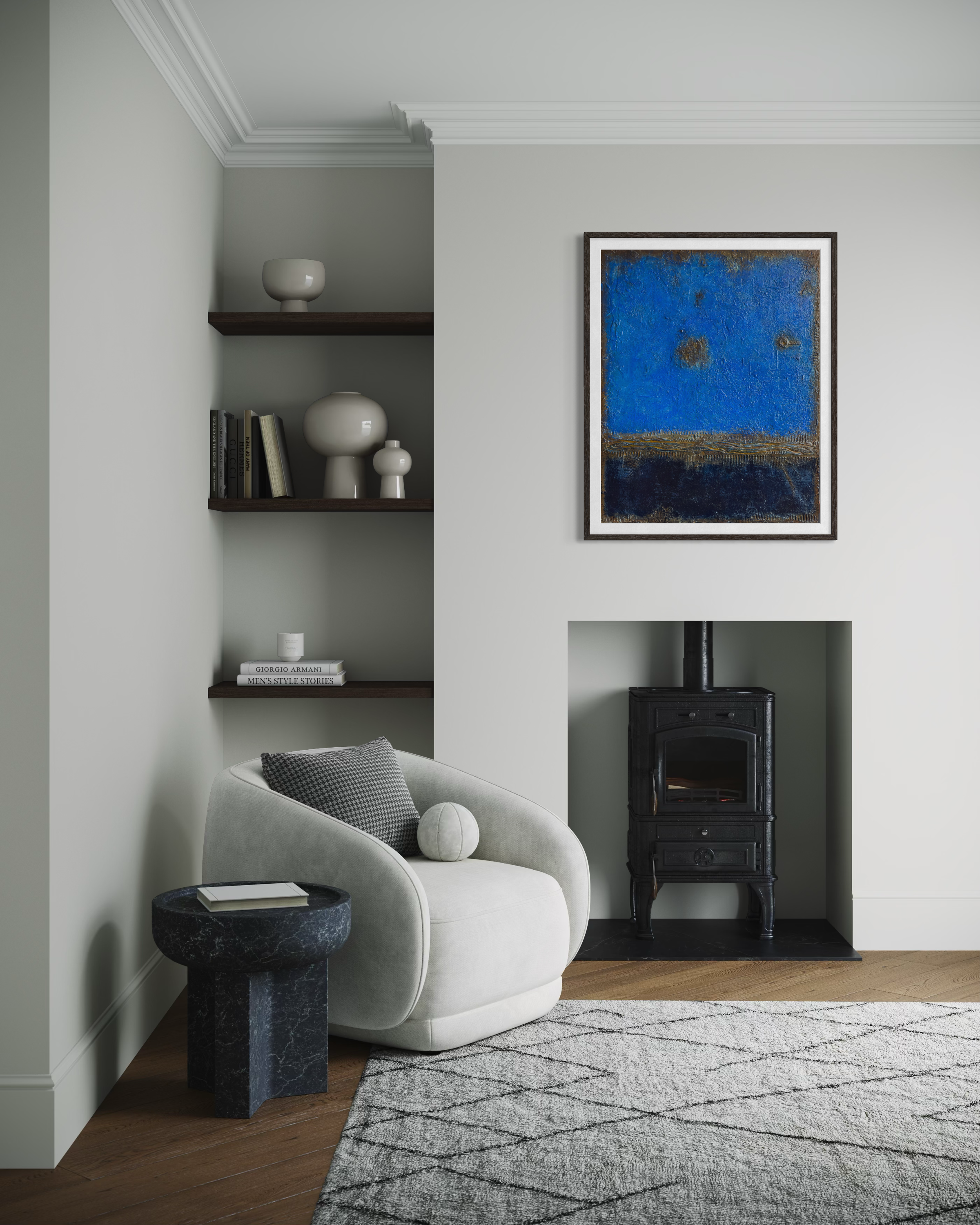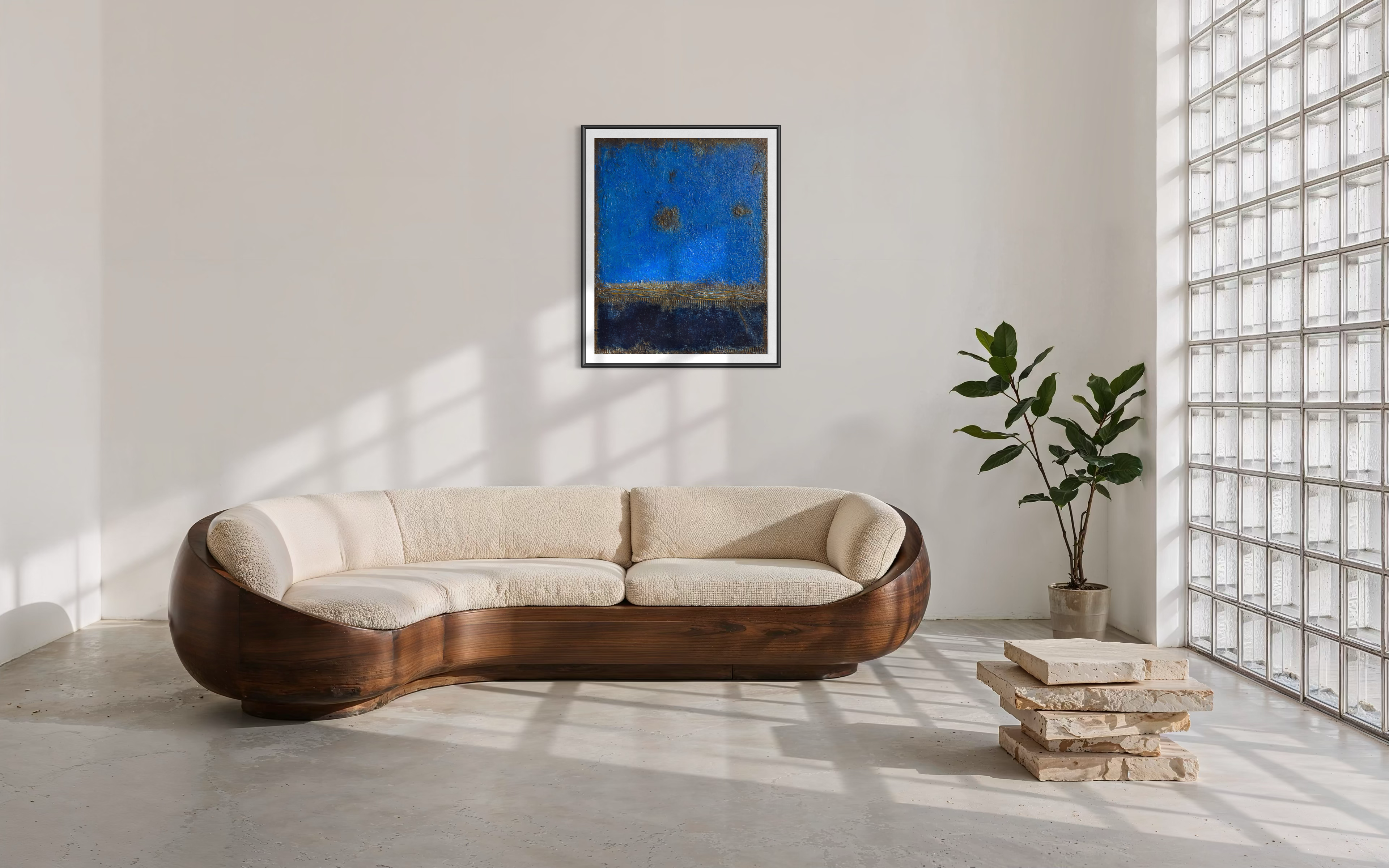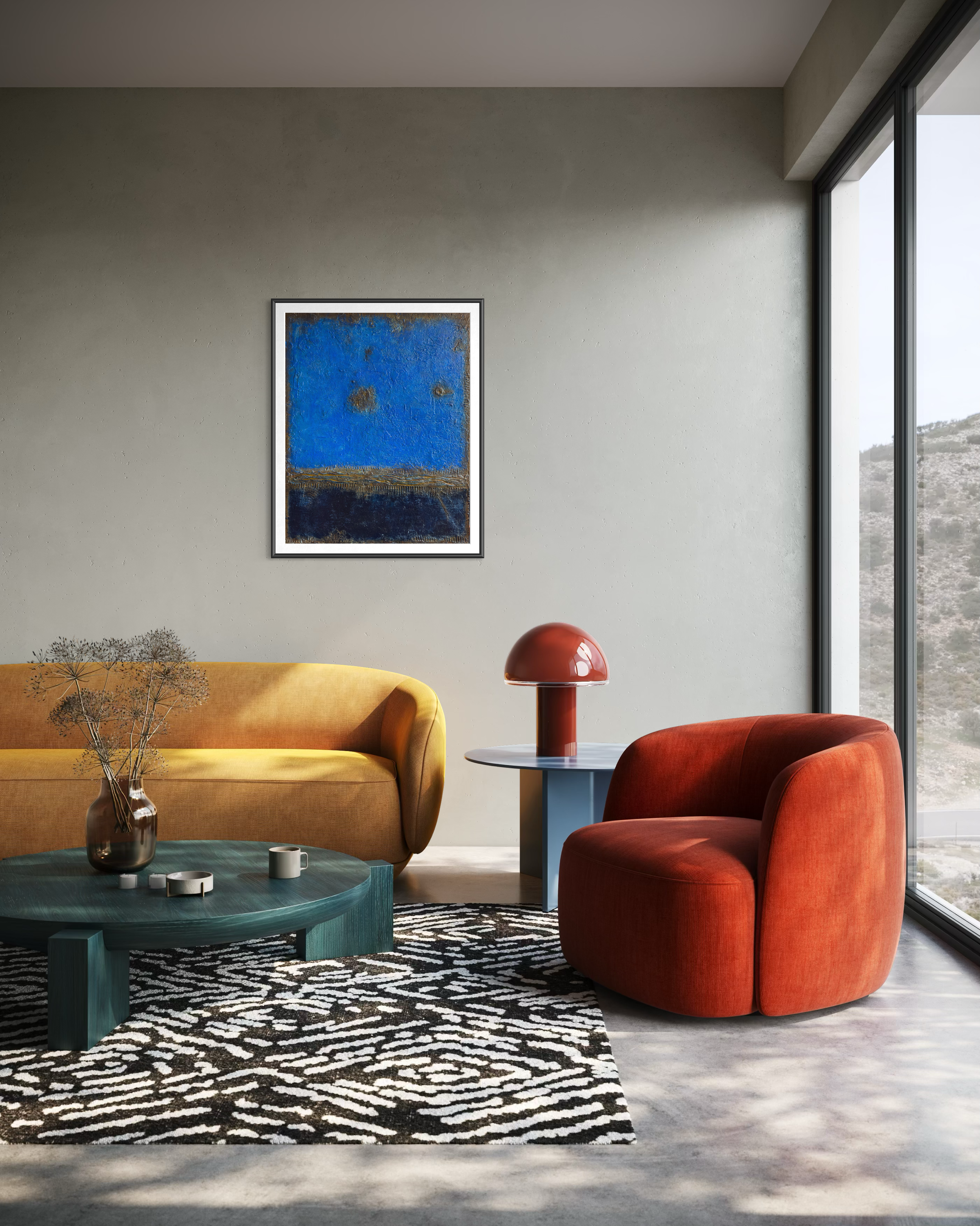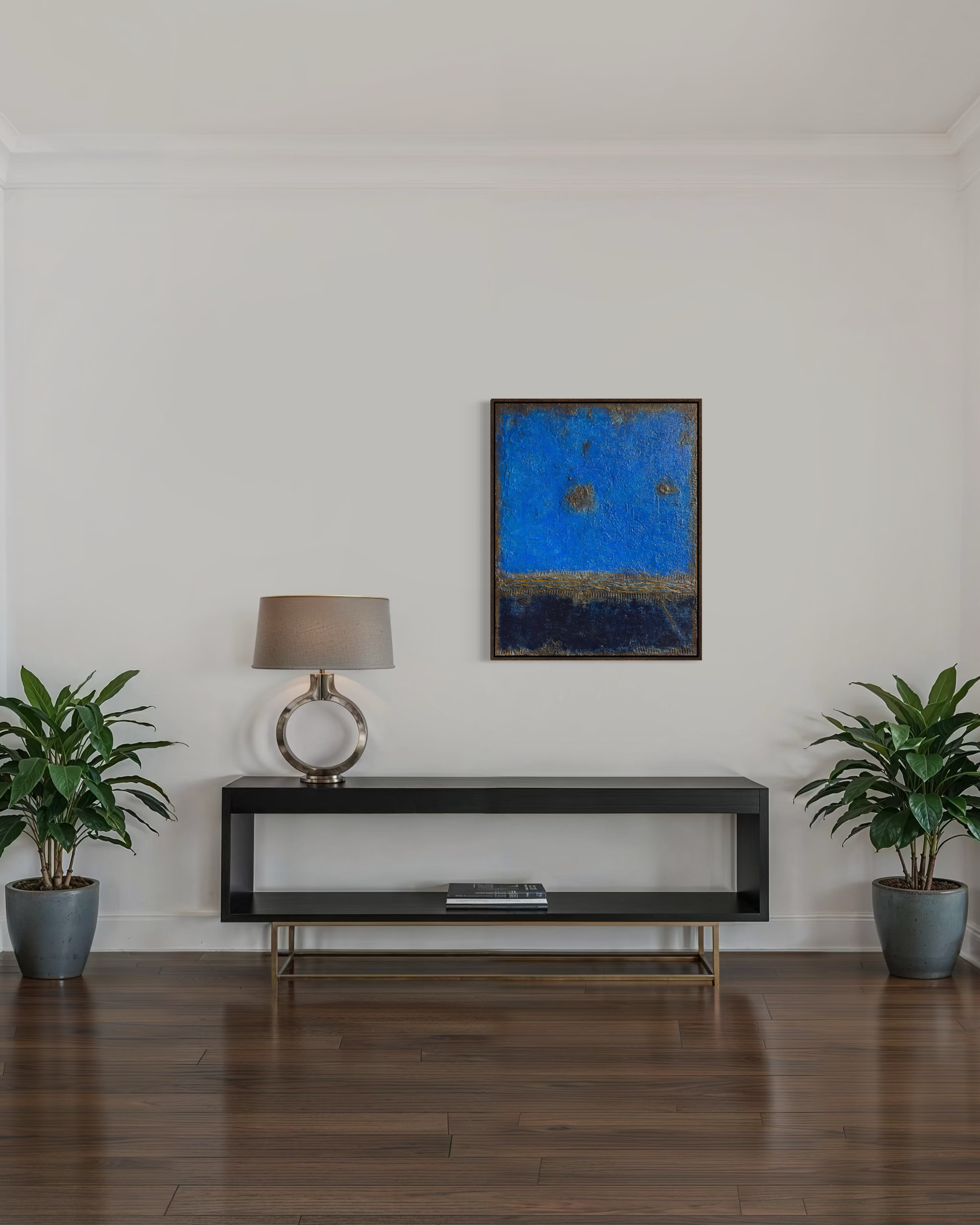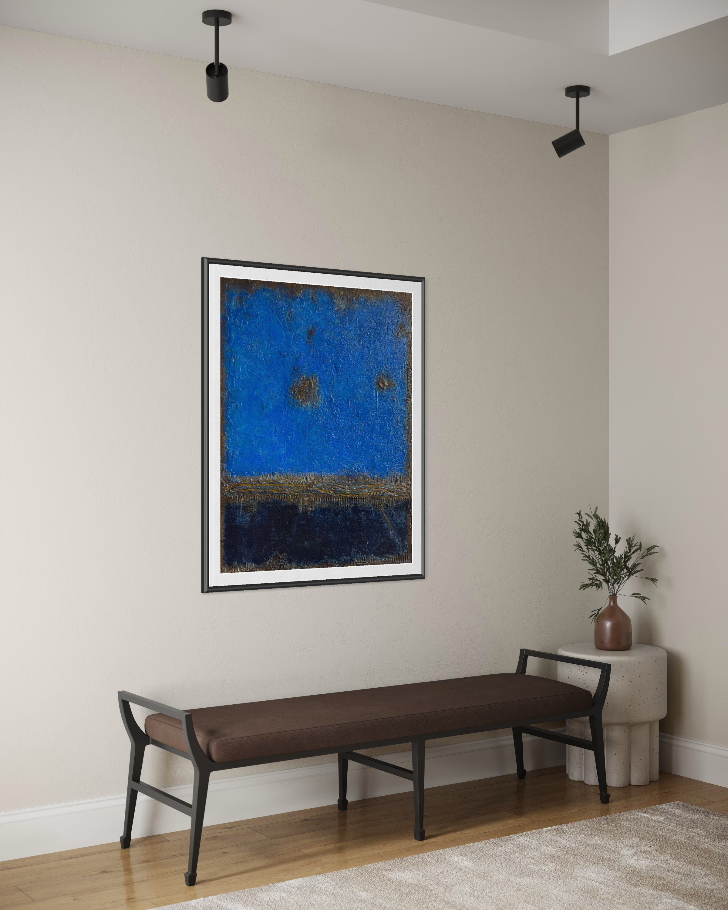 이 청색은 깊이가 아니라 무게다. 불꽃이 꺼진 뒤, 숨을 잃고 무겁게 가라앉은 대기다. 표면은 변화의 생생한 빛이 멈춰 선 정막을 머금는다. 남겨진 것은 더 이상 시간과 타협하지 않는 존재감—우리가 오늘날 도처에서 마주하는 서늘한 고요의 투영이다.