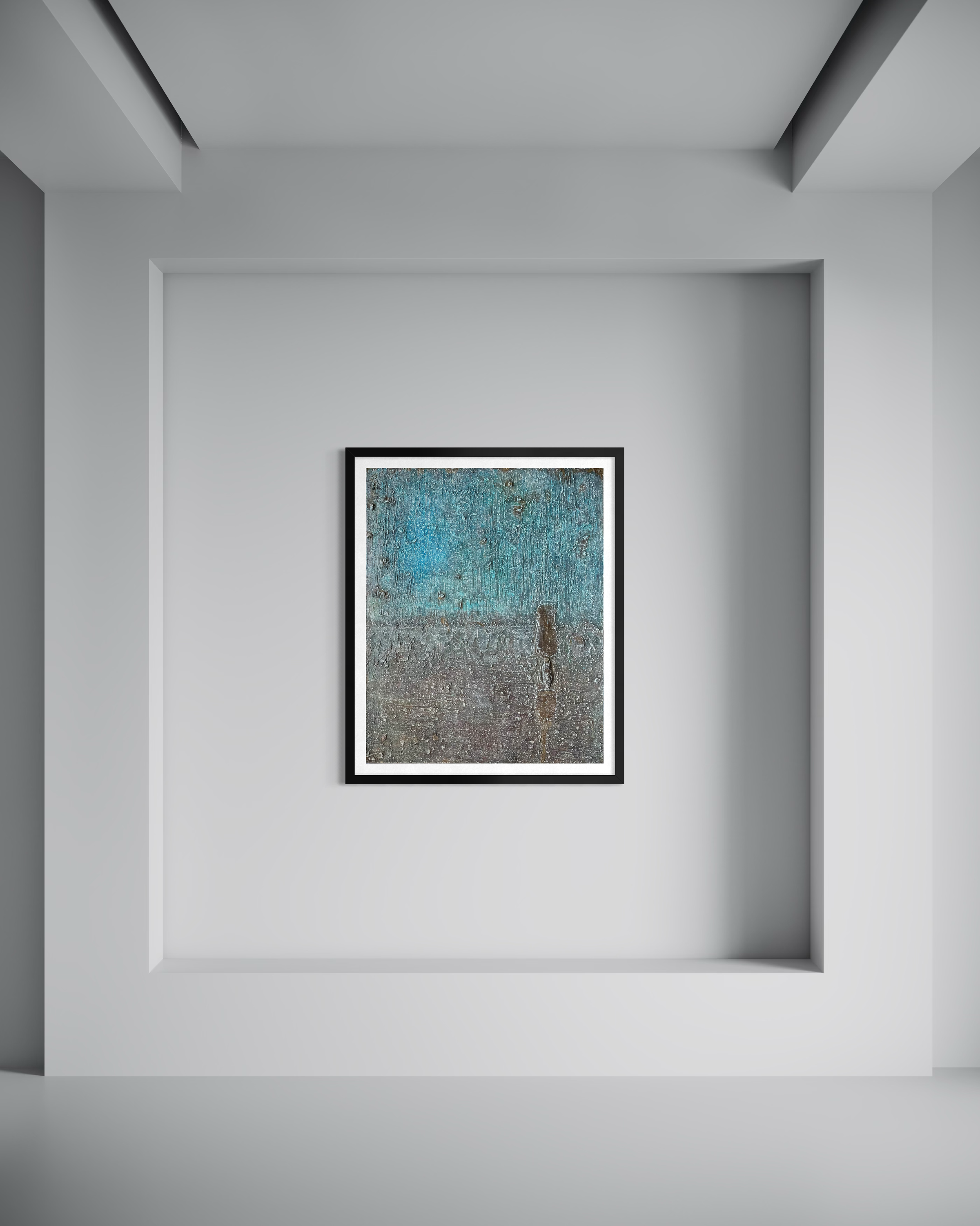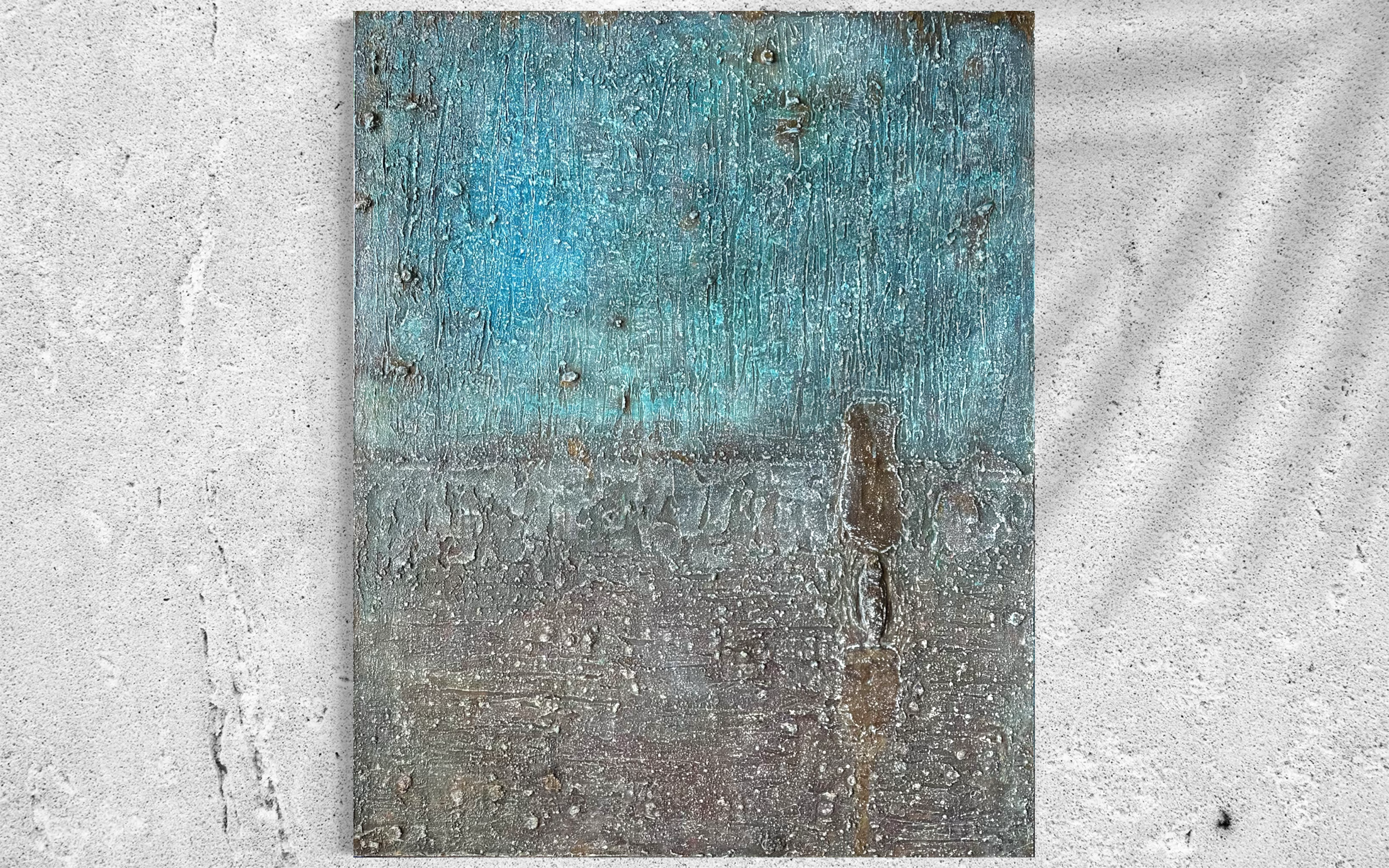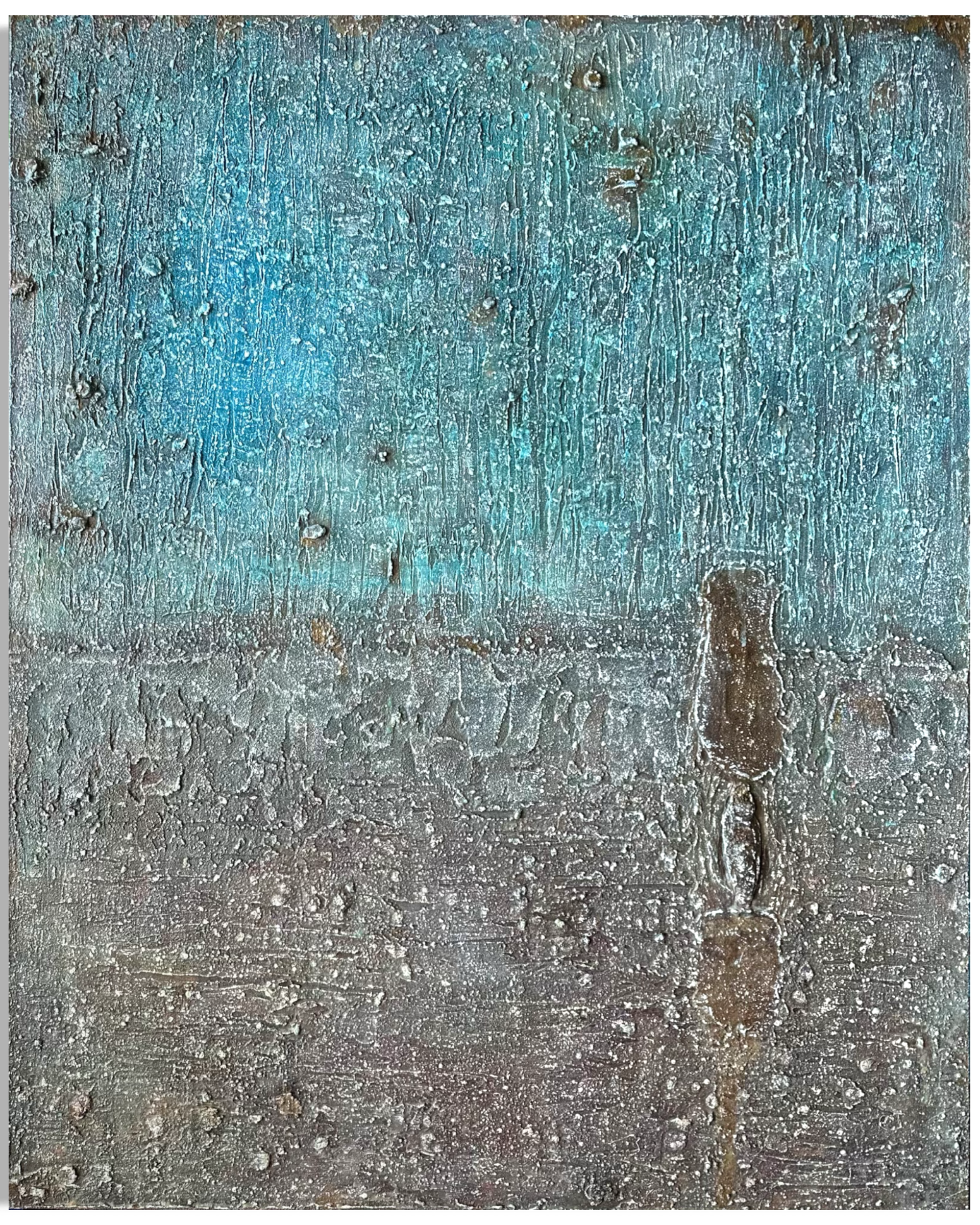 The palette knife entered the wet paste before color arrived. Ridges were raised, grooves cut, peaks pressed in — the surface established its topography before it knew what it would carry. Cerulean came and was rinsed away. Reddish-brown settled into the hollows and was withdrawn. Then white oil pastel was drawn across the built-up terrain — not to cover, but to catch. It gathered in the ridges and along the raised edges, settling into the surface's own geography, leaving a residue that reads, up close, like frost on uneven ground: each deposit particular, each line unrepeatable. Inside the hardening layers, a dried anchovy. The surface has been building itself toward what could not have been planned.