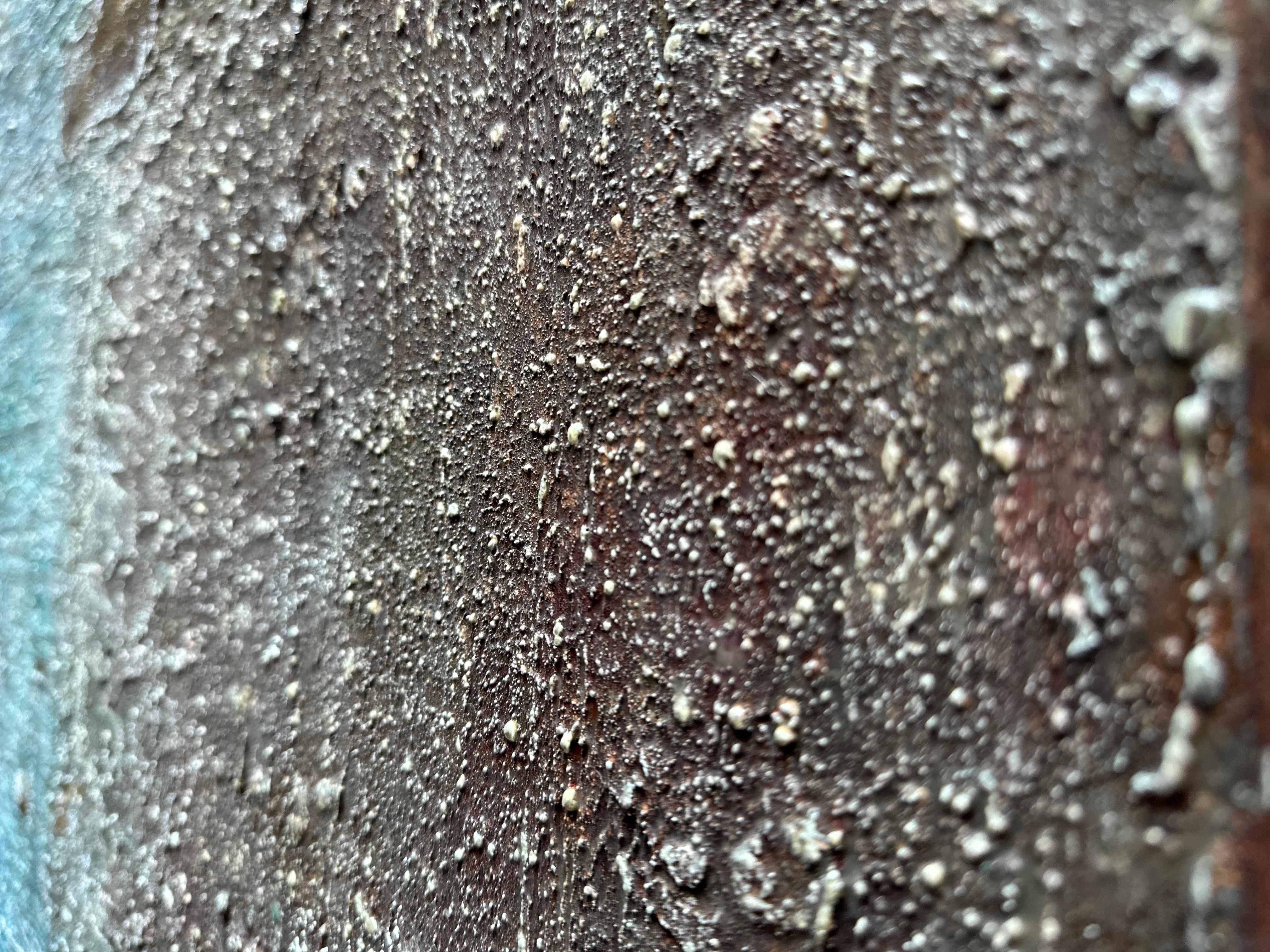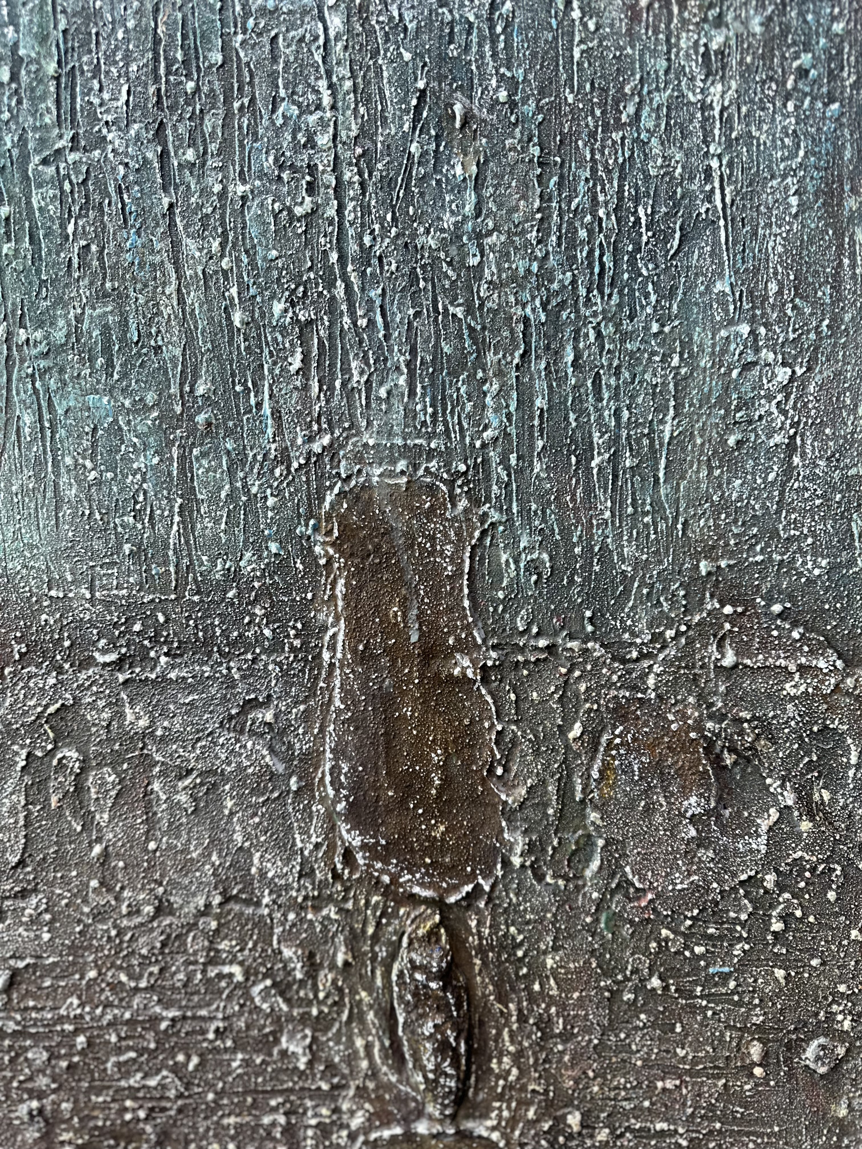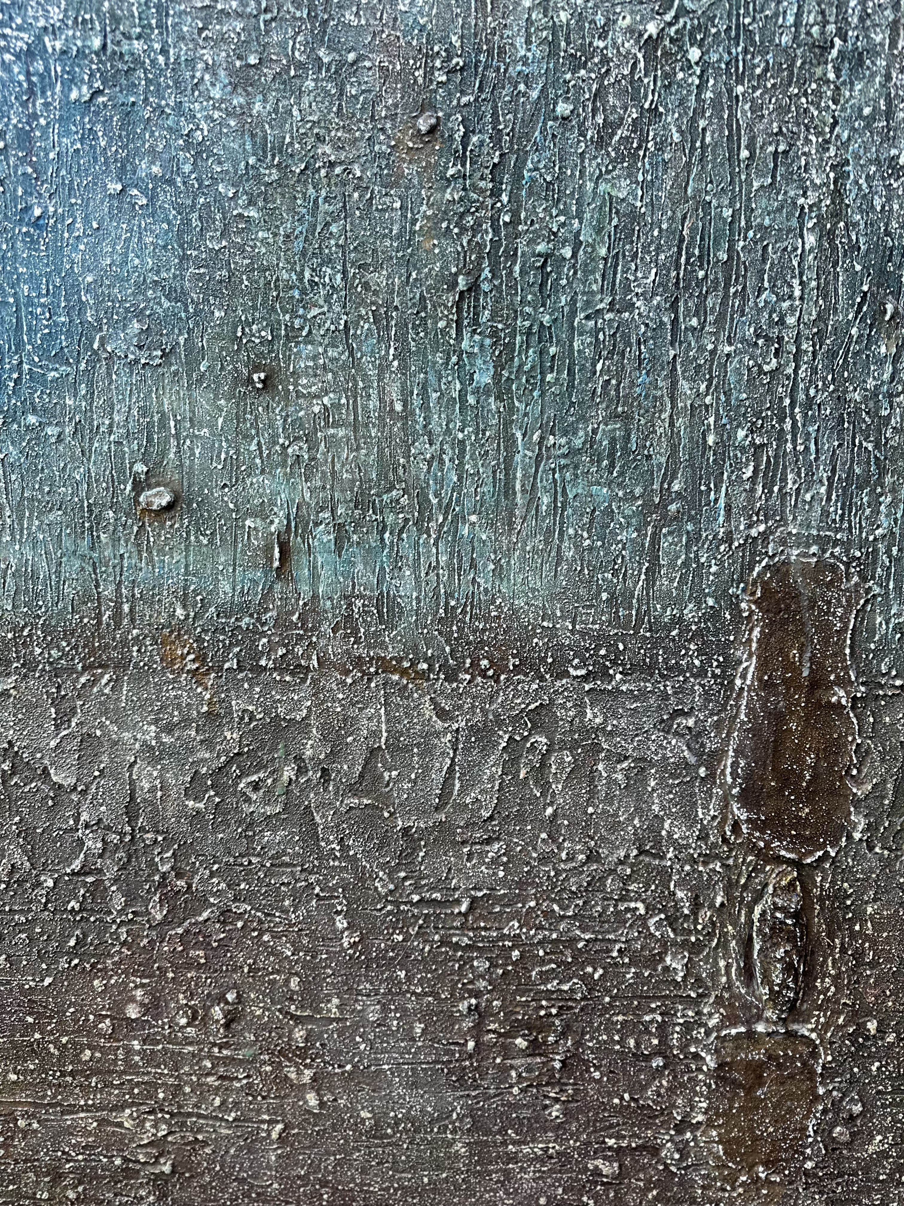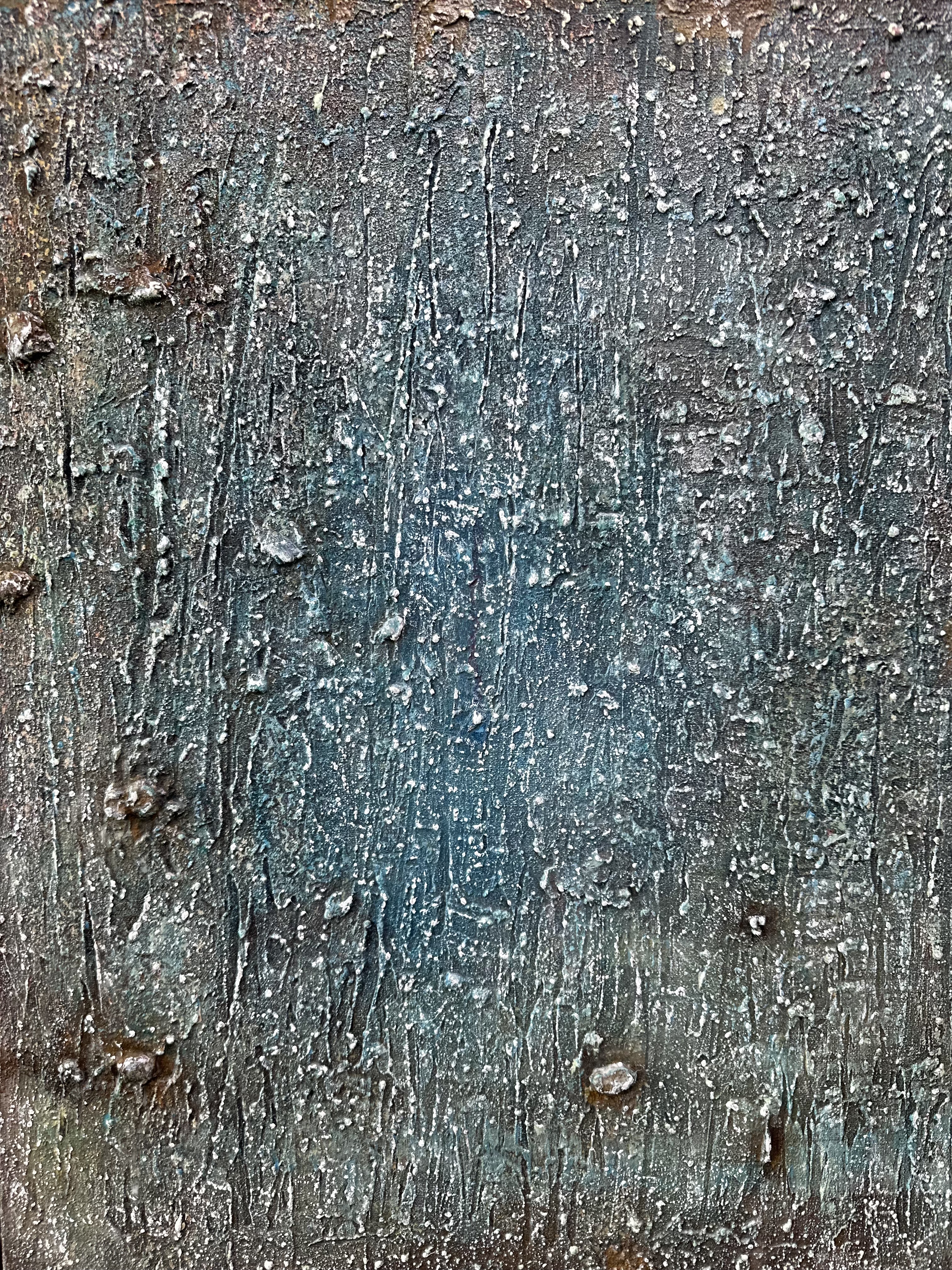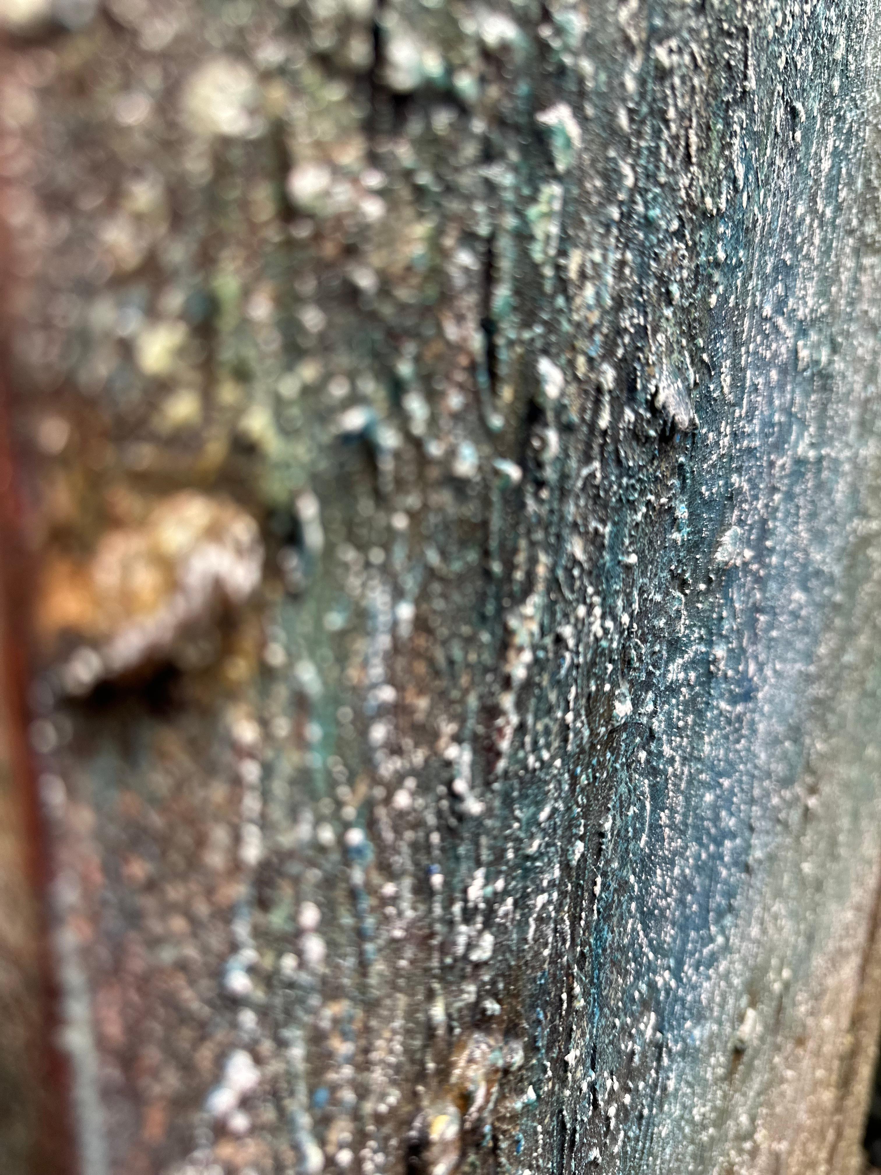 From close range, the surface is irreplicable. Modeling paste and coffee grounds accumulate; the palette knife cuts, presses, and raises ridges and grooves; cerulean and reddish-brown settle through repetition and removal. Then white oil pastel is drawn across the built terrain — not to cover, but to catch. It thickens on the raised edges, thins in the lower passages, following the surface's own geography without instruction. Up close, it reads like frost on uneven ground: each deposit formed by contact rather than intention, each line belonging only to the moment of its making. A dried anchovy hardens within the layers. Each material event belongs to its moment. At this distance, the surface holds its singularity.
