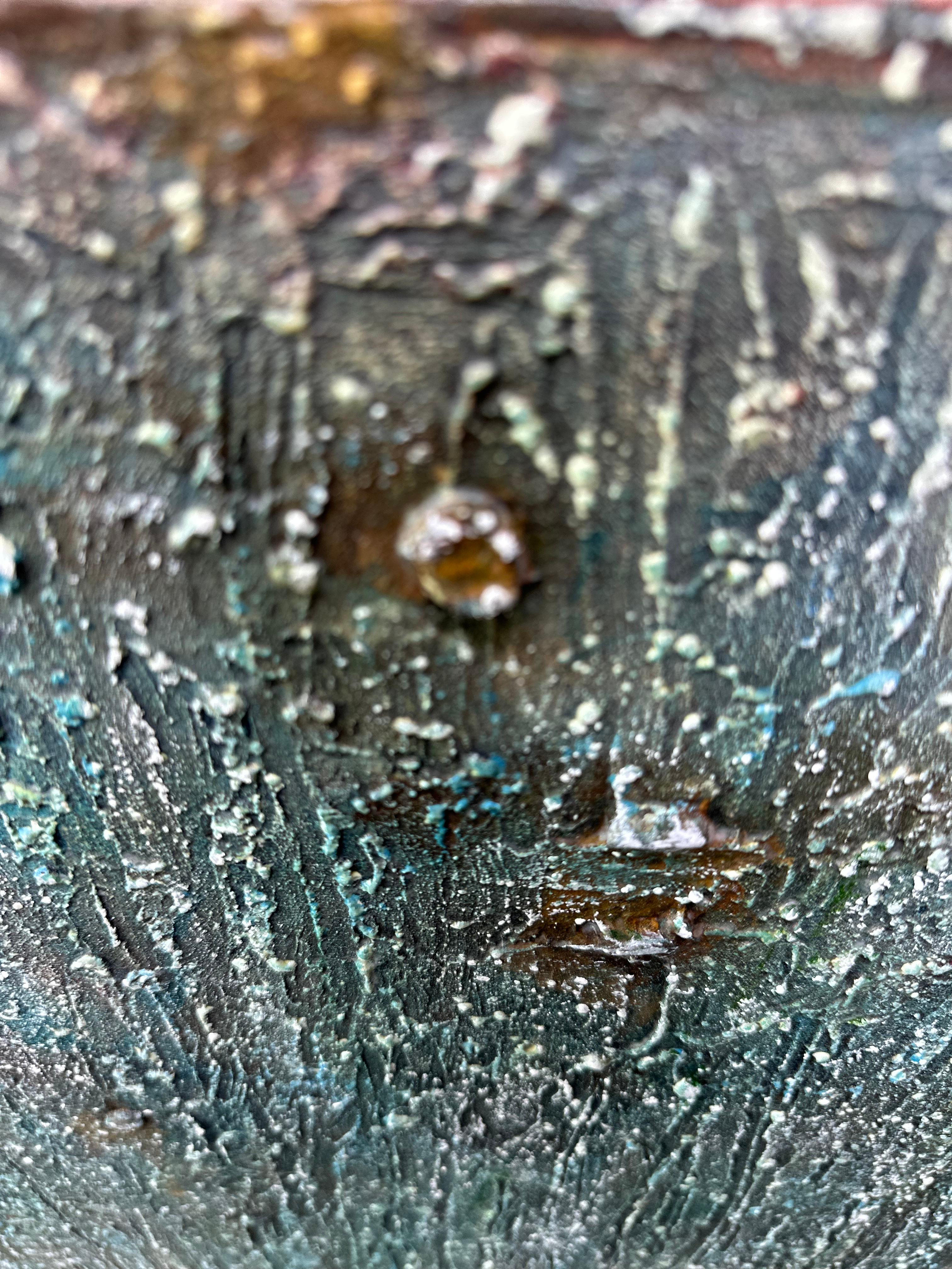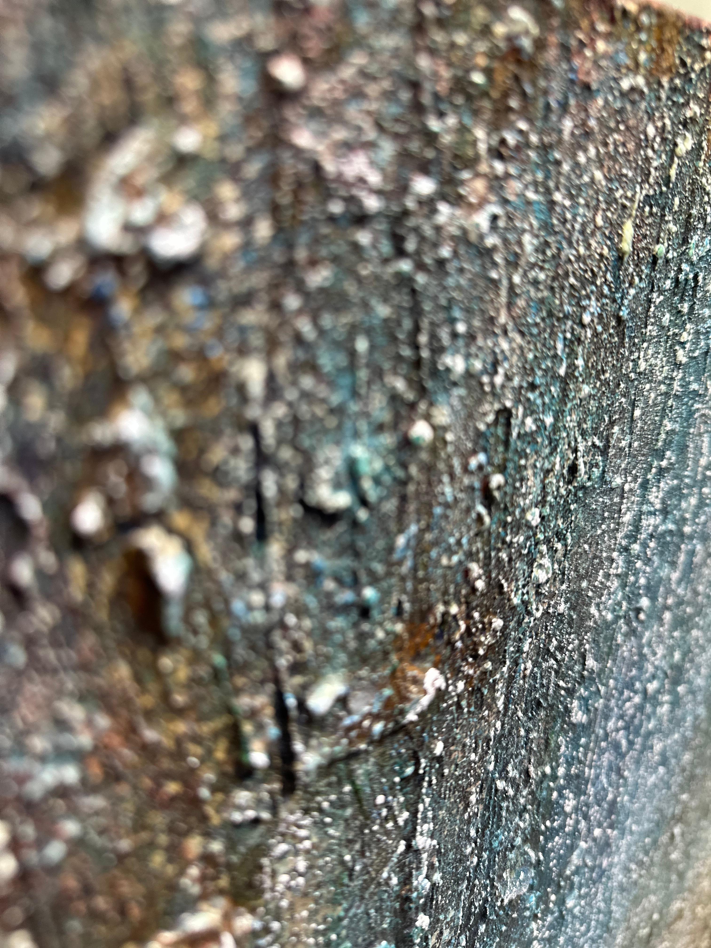 가까이서 이 표면은 모사 불가능하다. 모델링 페이스트와 커피 가루가 쌓이고 조각칼로 조각된 후 청록과 적갈색이 반복적인 도포와 제거를 거쳐 자리를 잡았다. 화이트 오일파스텔이 솟은 지형 위를 지나갔다. 덮기 위해서가 아니라 걸리기 위해서였다. 울퉁불퉁한 땅 위의 서리처럼 능선을 따라 내려앉으며. 마른 엔초비 한 마리가 층위 안에 굳었다. 각각의 물질적 사건은 그 순간에만 가능했다. 이 거리에서 표면의 고유성은 절대적이다.