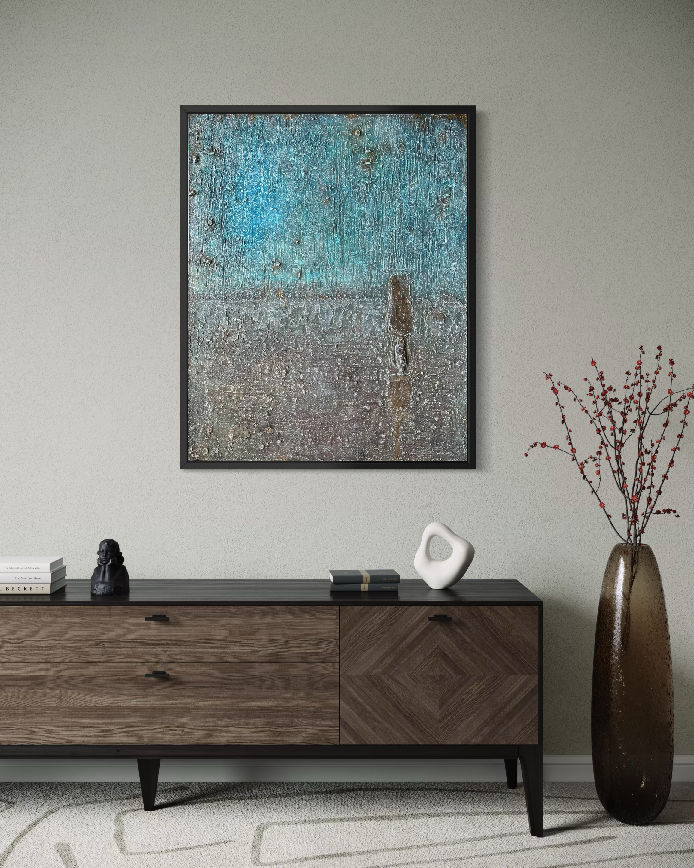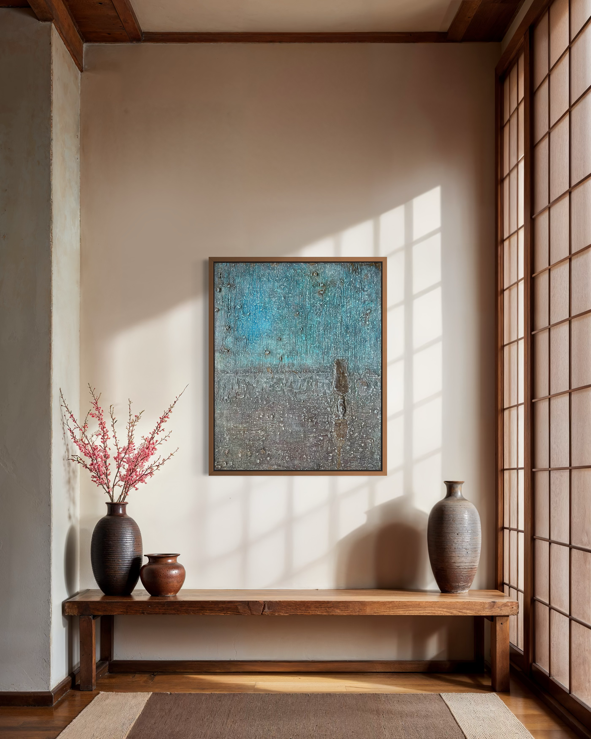 The chromatic structure carries this condition. The cerulean above does not radiate outward but remains contained within the surface. The reddish-brown below settles into the topography established by the knife. No line divides them. A transitional zone forms through accumulation, without declaration, becoming legible only afterward.