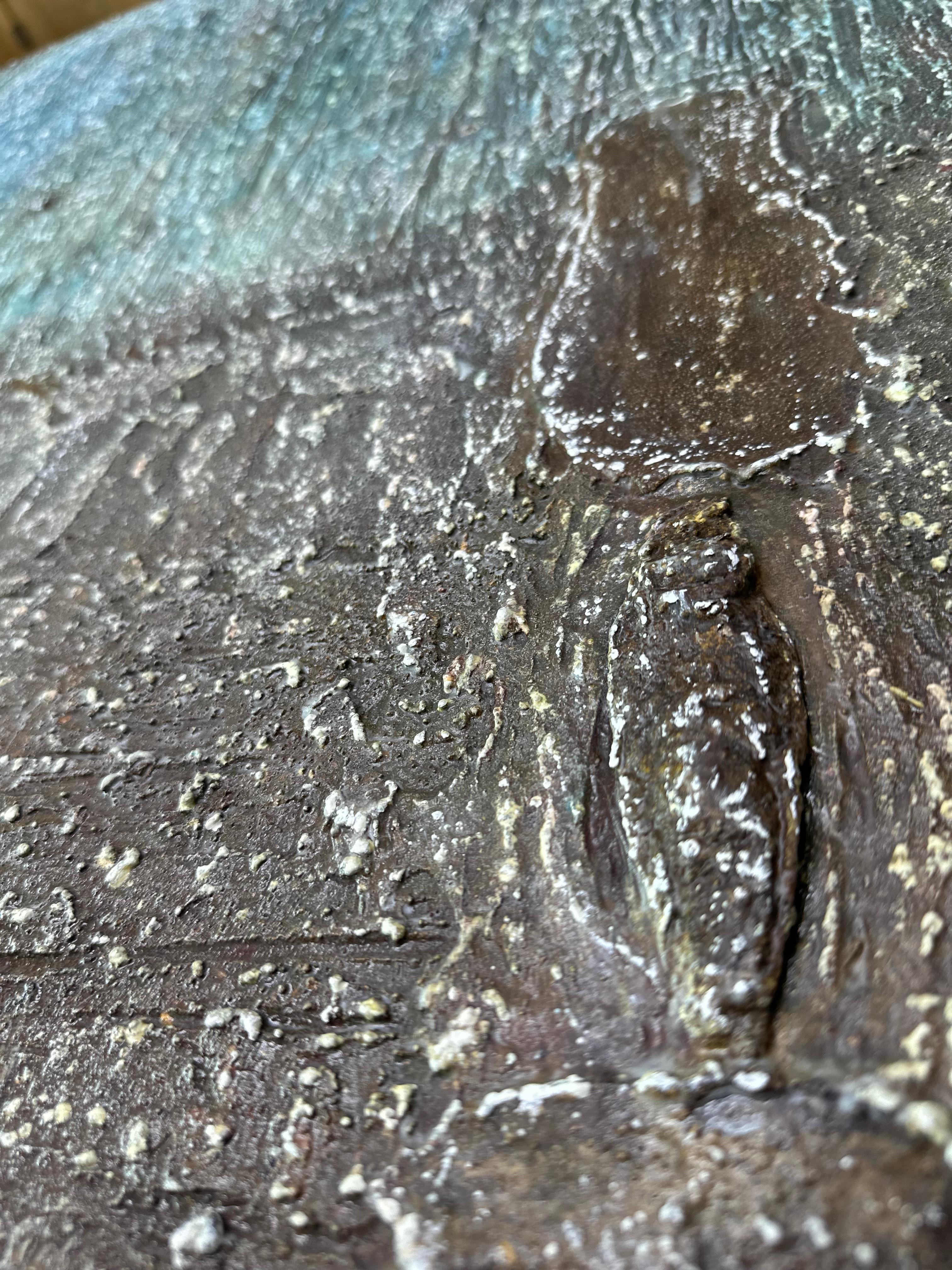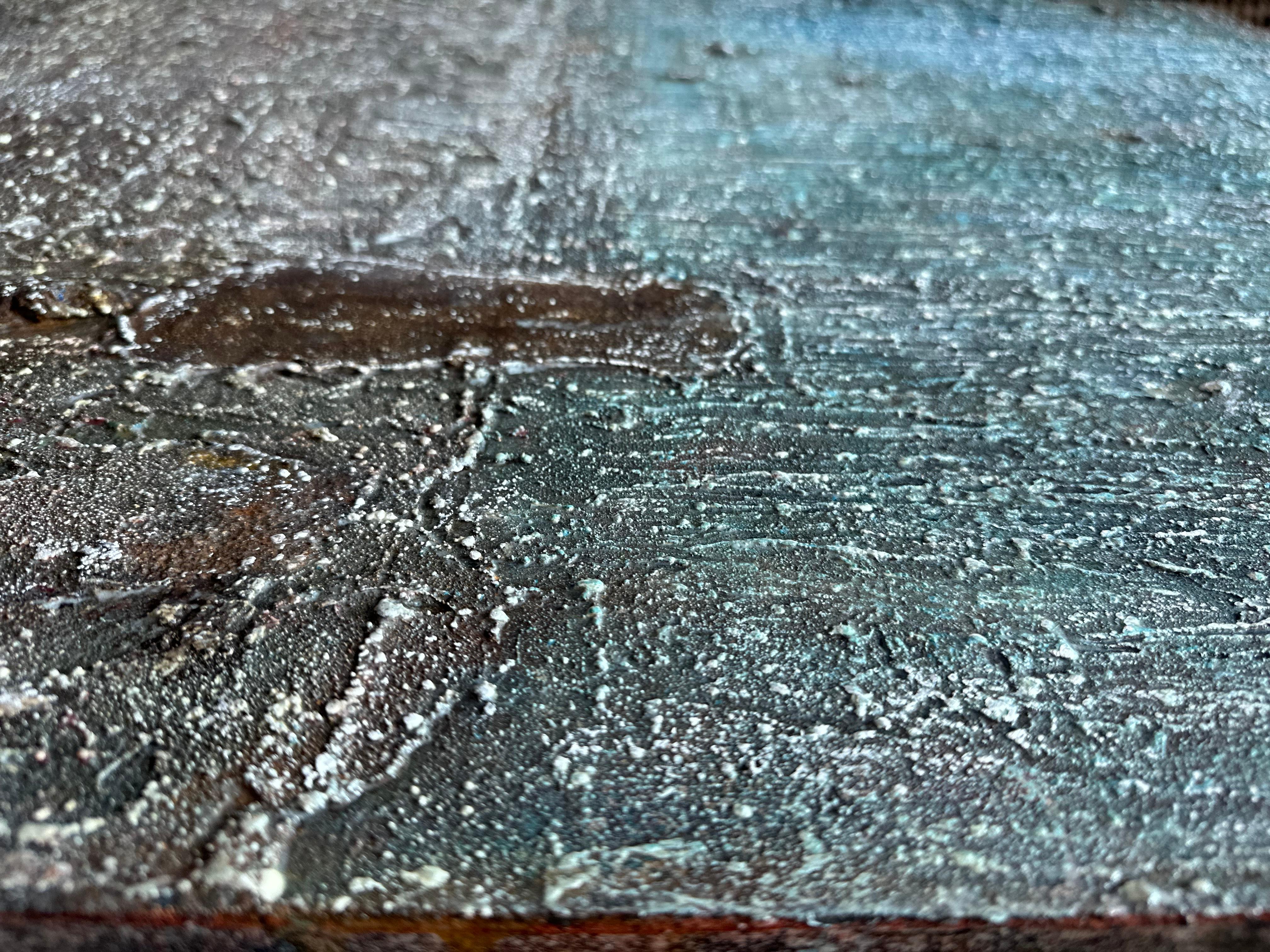 From close range, this surface cannot be replicated. Modeling paste and coffee grounds were built up and carved before color arrived; cerulean and reddish-brown were applied and withdrawn through repeated cycles; white oil pastel was drawn across the raised terrain — not to cover, but to catch, settling along ridges like frost on uneven ground. A dried anchovy hardened into the layers. Each material event belonged to its moment. At this distance, the surface is absolutely singular.