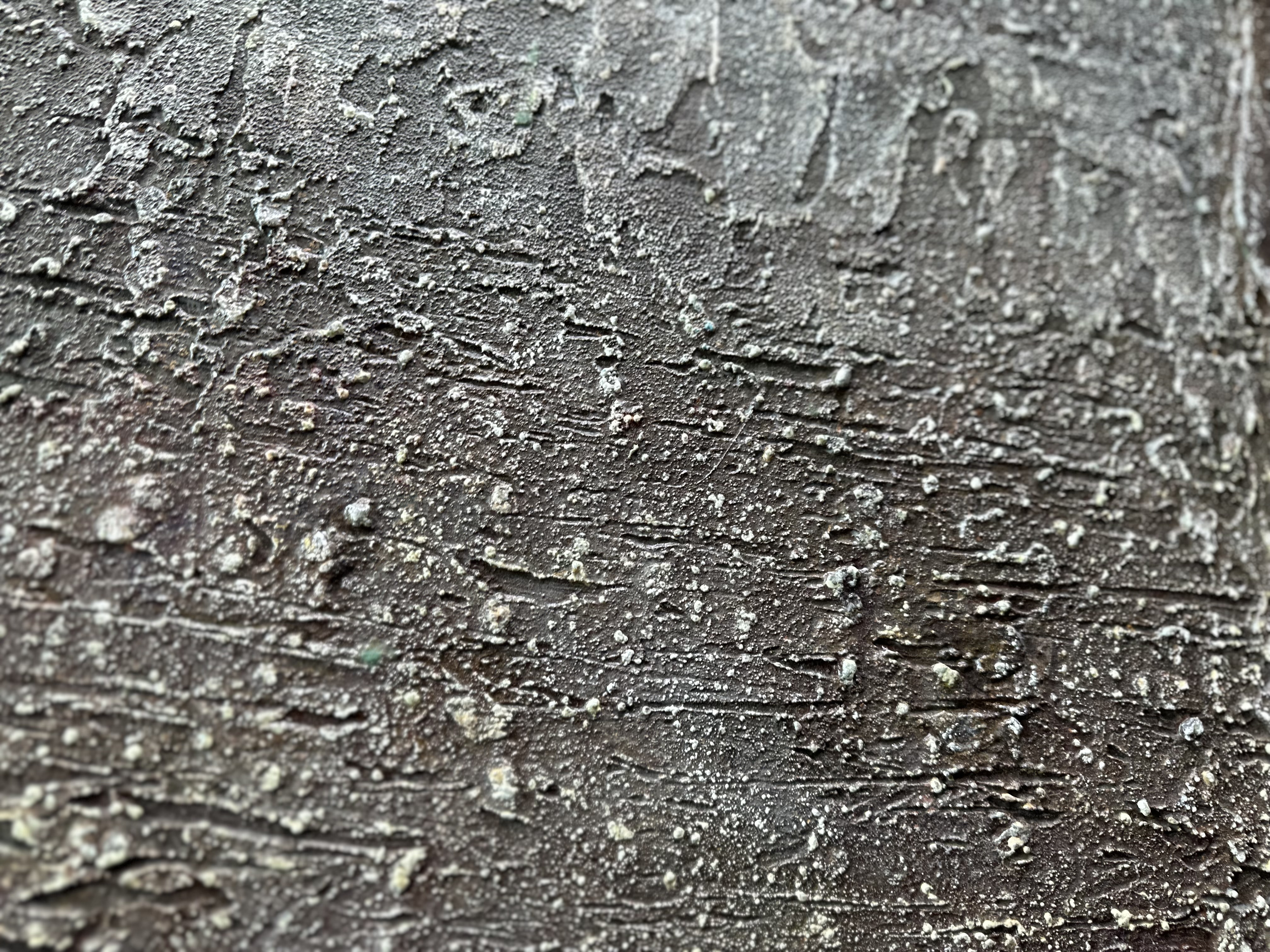 Nothing on this surface can be replicated. The marks, the crystallized residue, the anchovy hardened into the layers — each particular is unrepeatable. This much holds. Step back, and it loosens into haze.